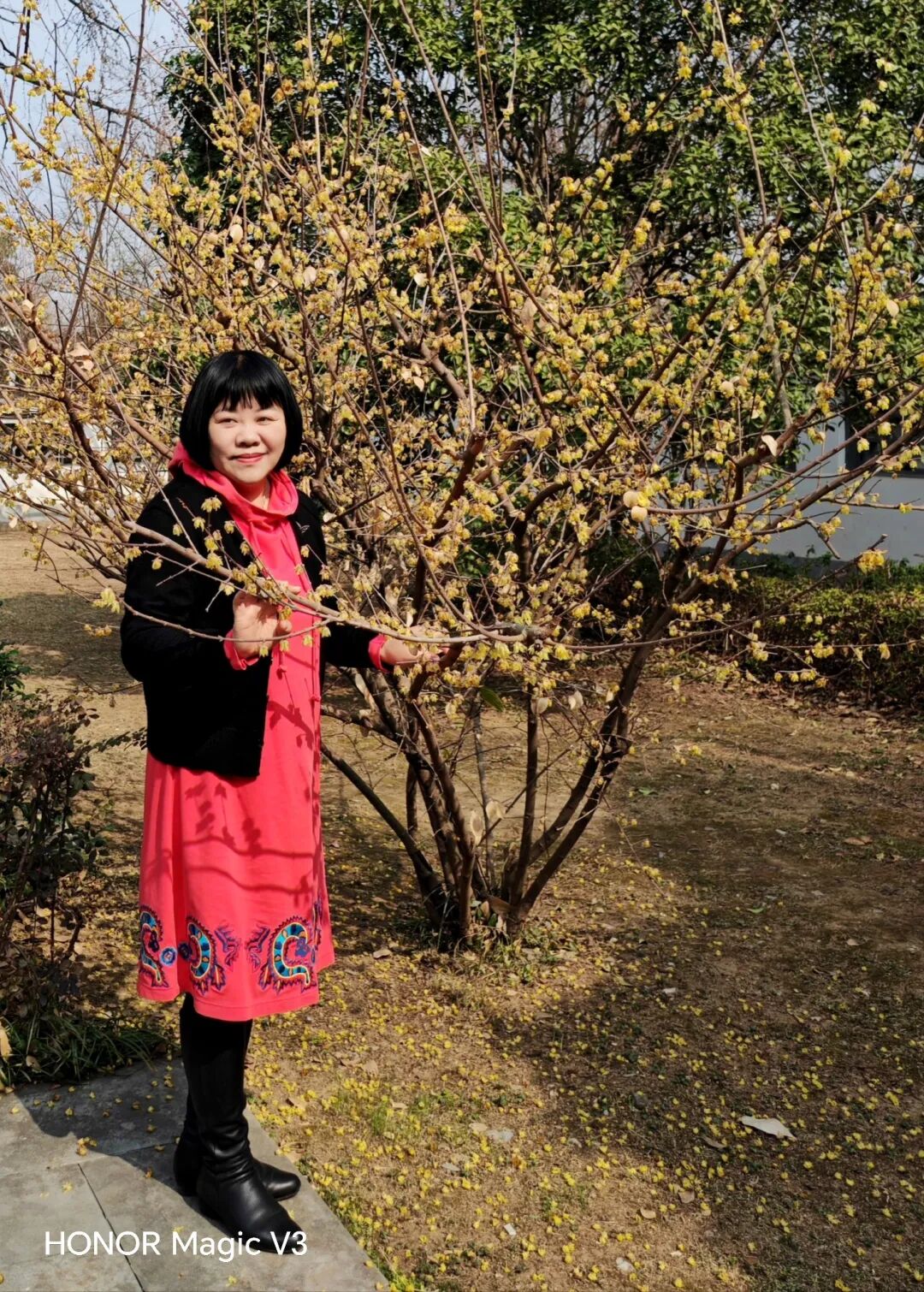 二月二神山寺千年玉兰花下众女诗友撒花瓣拍照