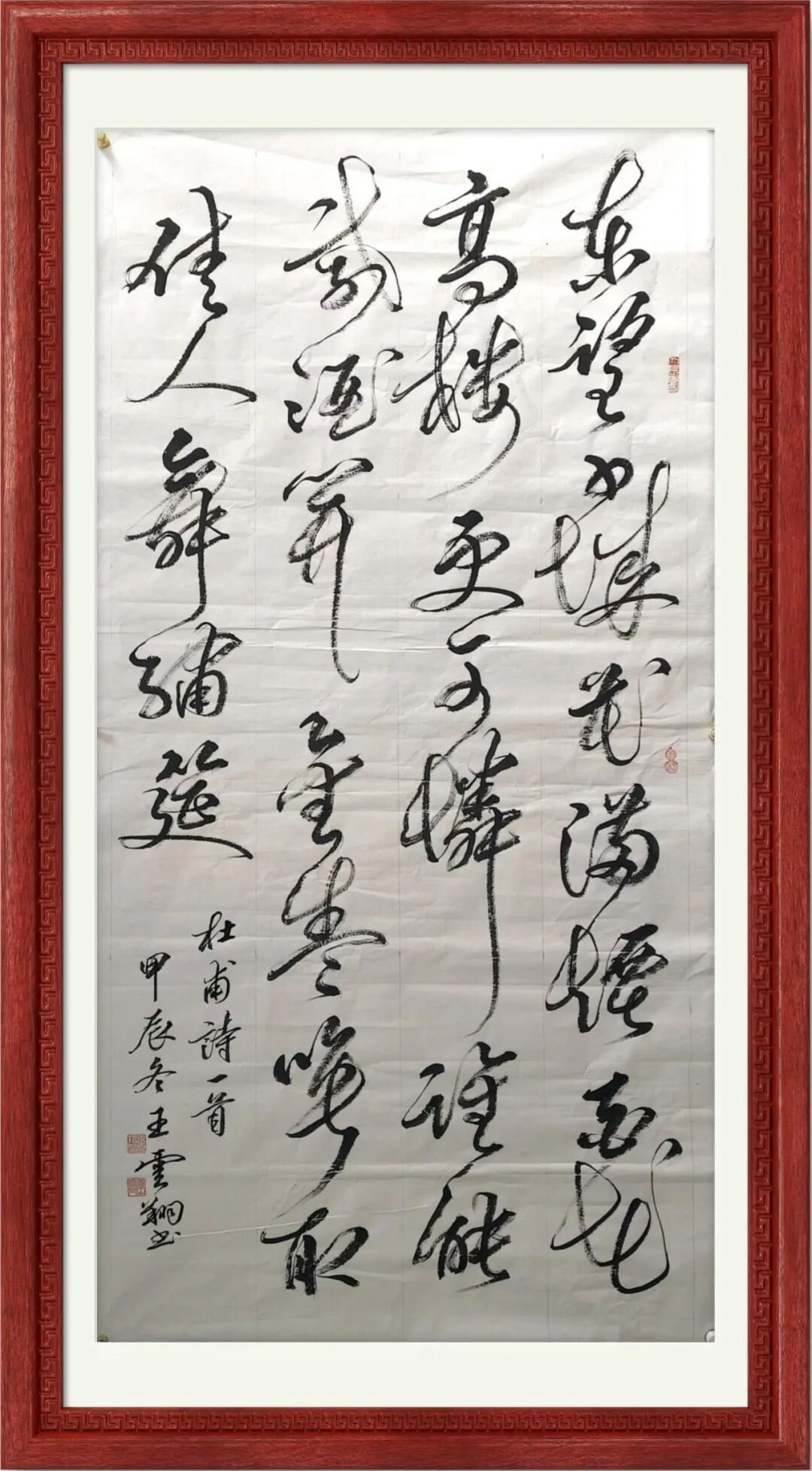 复观他的草书创作,线条塑造变化多端,有如虬龙盘曲腾跃于九天之上,时而似鸾凤展翅翩然于云霞之间。落笔皆如江河奔涌气势磅礴,却又在转折处暗藏细腻成为春风拂柳。节奏分明错落有致,起笔雷霆万钧,落笔似细雨轻吟。动静之间展现出惊人的生命力与艺术表现力。墨色浓淡变化宛如远山近水层次分明,笔势轻重缓急借鉴古琴曲的高低起伏,韵律悠长。飞舞的笔墨线条既驾驭传统书法的神韵,又重塑现代书法的审美特质,将千年的文脉与当代的精神熔铸于一炉。在他的笔下书法不再是简单的文字书写,成为视觉与心灵的盛宴,成为对天地万物诗意诠释。法度与灵动的完美统一,正是王云翔先生书法艺术的精髓所在。他的作品既有古帖的严谨厚重,又有今人的自由奔放,展现出艺术家高超的技艺与深厚的修养,是谓当代书法艺术的一道奇观!