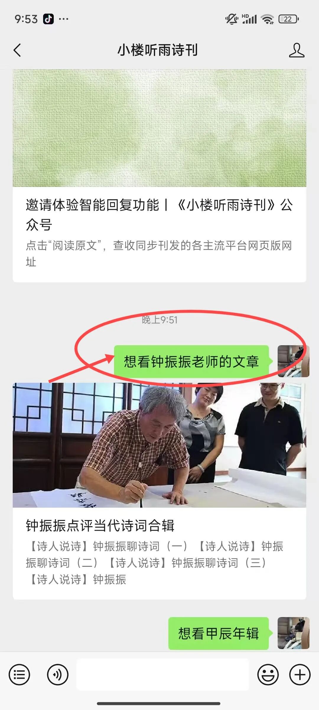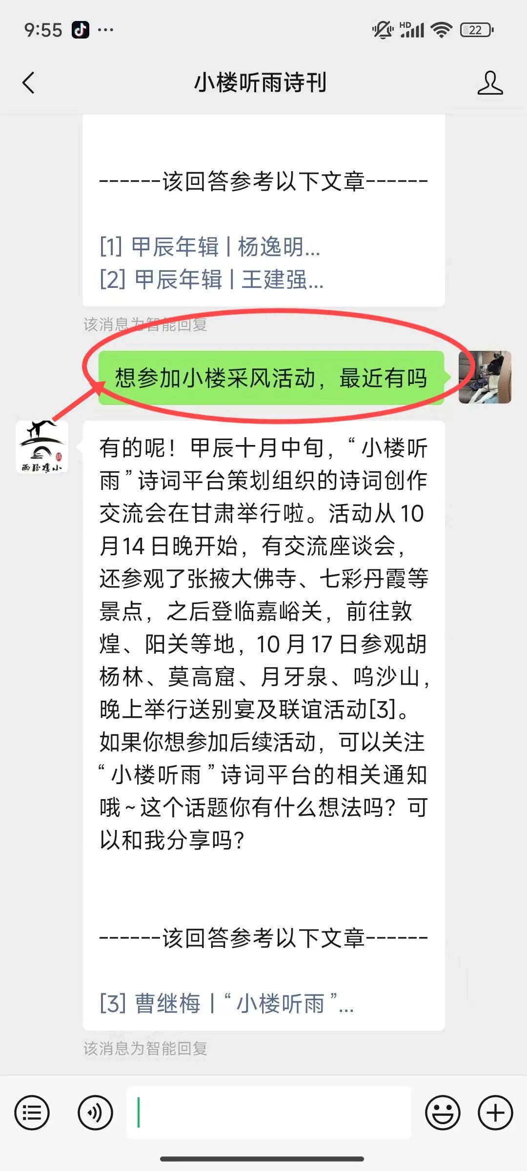 步骤二:点开公众号的对话框,输入自己的问题,例:
