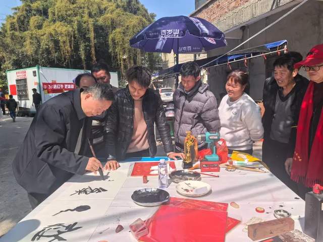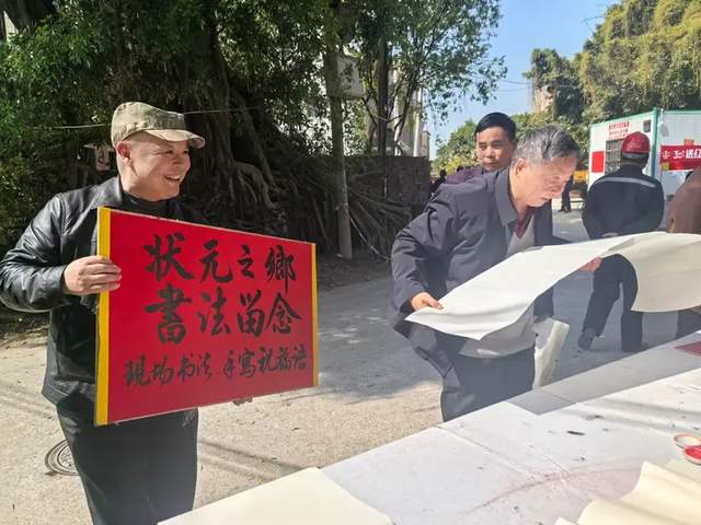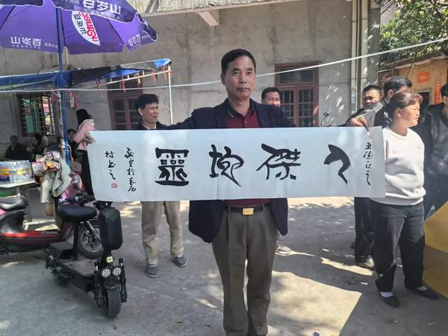 在村口和在村里,我们看到当地和外地来的一些文化人在摆摊写字,献给那些来这儿打卡的人,让他们享受到狀元之乡的祝福。正好我们参访打卡团里有著名书法家苏云,于是借此机会给陪同我们吴川朋友,还有梁家家里人献上一幅一幅的字,以示我们对梁文峰的祝福,对吴川美好未来的祝福!