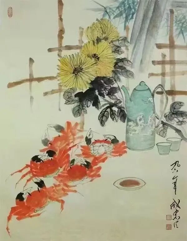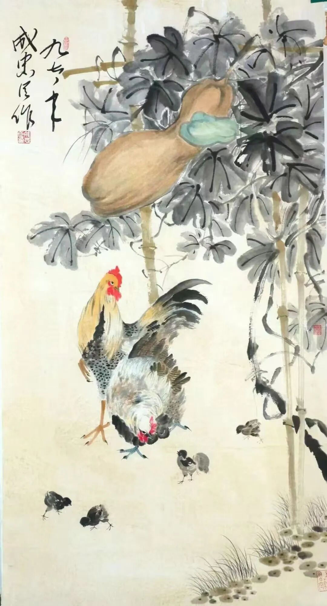 成忠臣对传统中国画的技法(如工笔、写意、没骨等)掌握娴熟,尤其擅长人物、花鸟题材。他的线条功力扎实,笔墨运用得心应手,对古代名家(如八大山人、吴昌硕、任伯年等)的风格有深入研究,并能灵活化用。