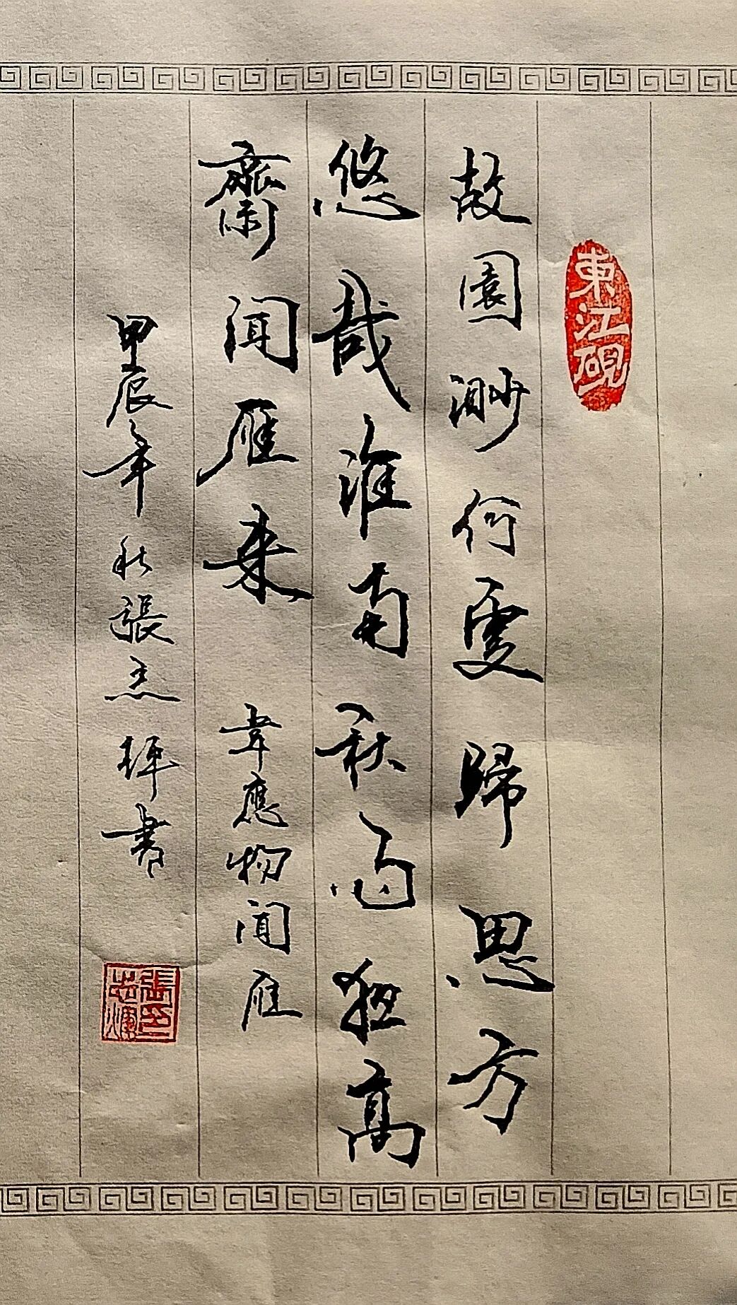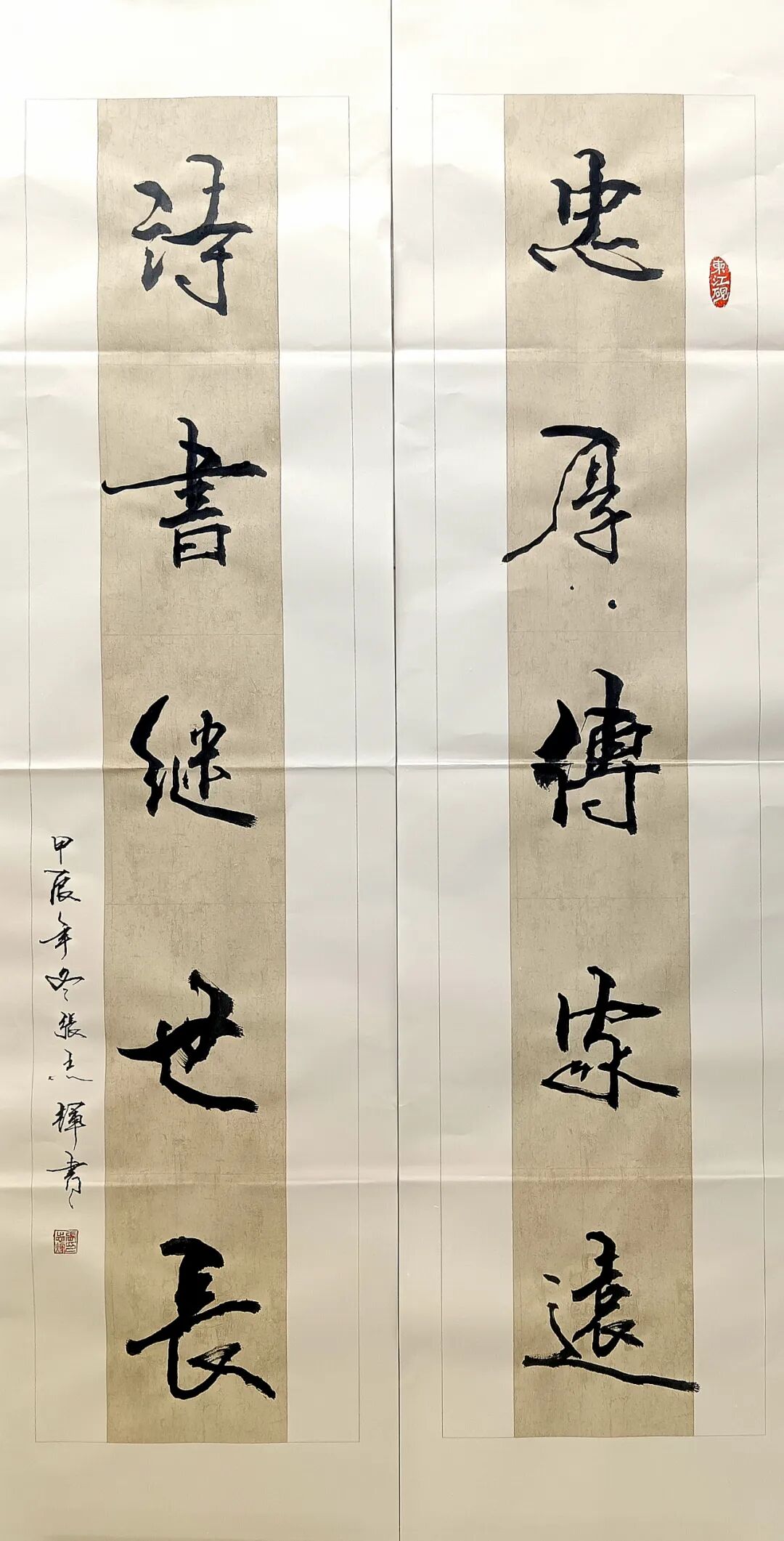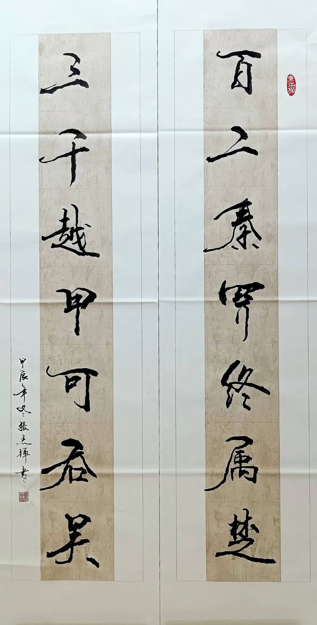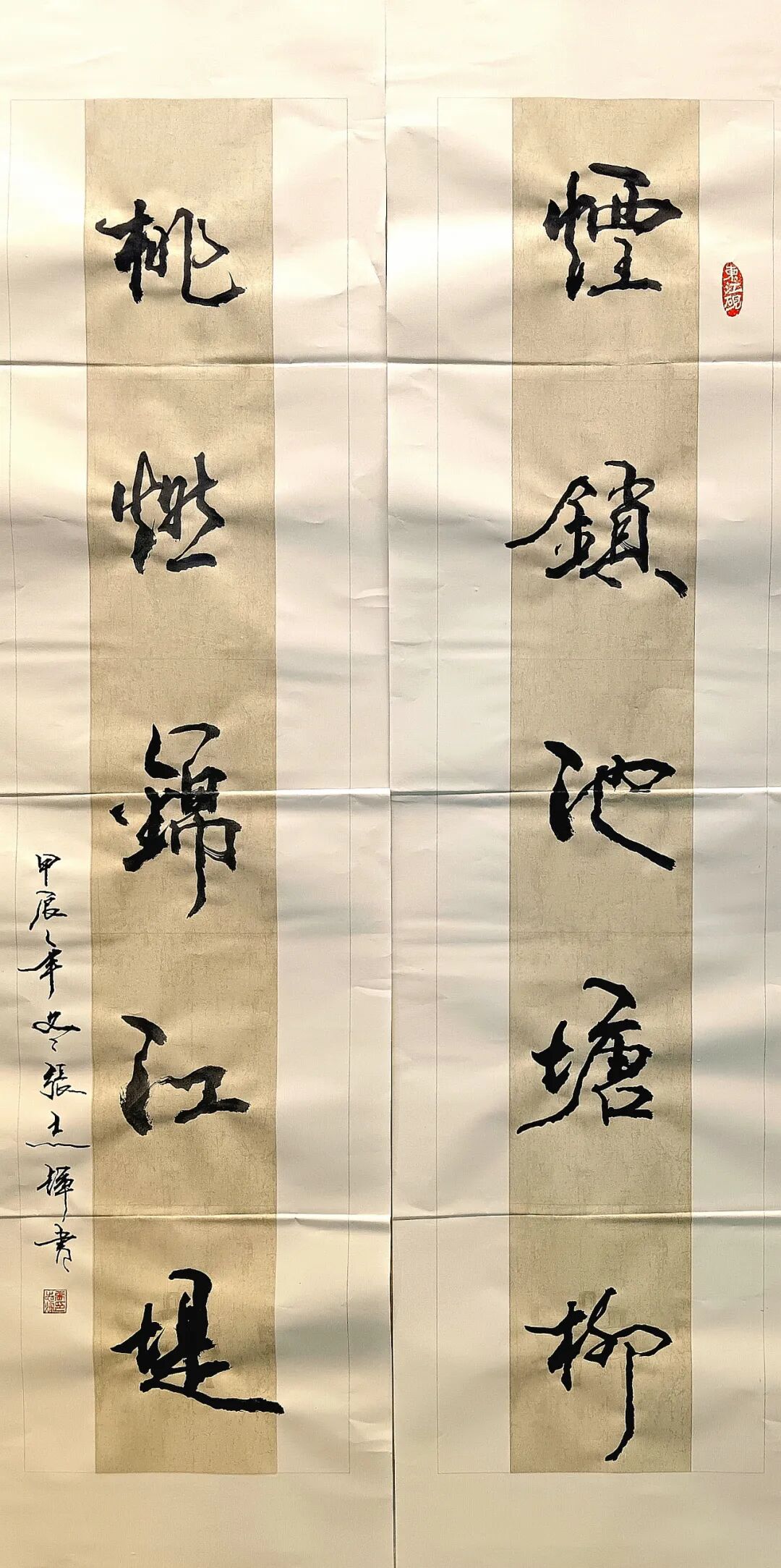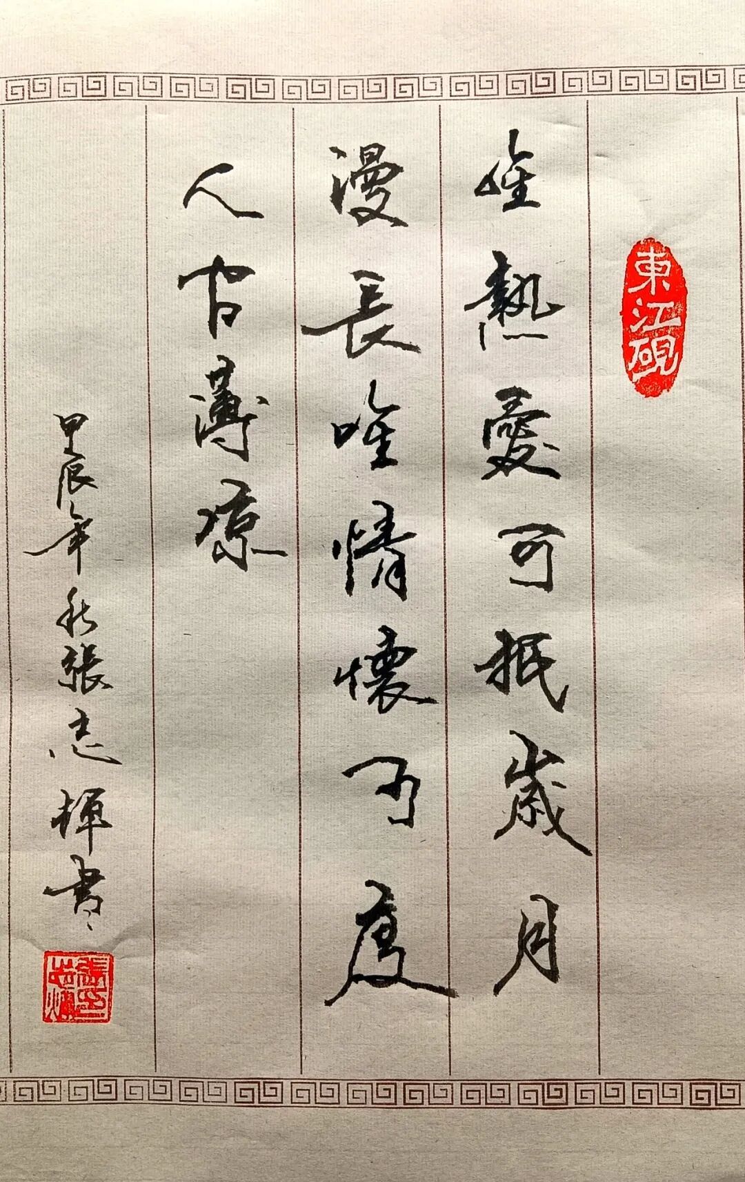 再者,能在行书领域脱颖而出,不仅因为他的用笔功夫,更在于他将书法艺术与文学修养的完美融合。正所谓"腹有诗书气自华",先生深谙文以载道的真谛,笔下书法往往以经典诗文为载体。观其作品,既有如"烟锁池塘柳,桃燃锦江堤"这般意境深远的楹联佳构,笔风淳畅,字字珠玑;又有如"故园渺何处,归思方悠哉"之类的抒情小札,行云流水,情思绵长。这些流传千年的诗文经典,通过他富有文人气的笔墨重新焕发光彩,而他对诗词文学的深刻理解,同样为其书法注入了隽永的精神内涵!