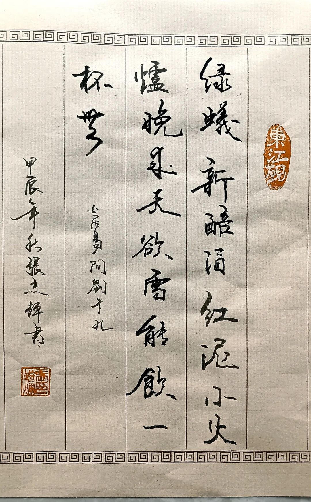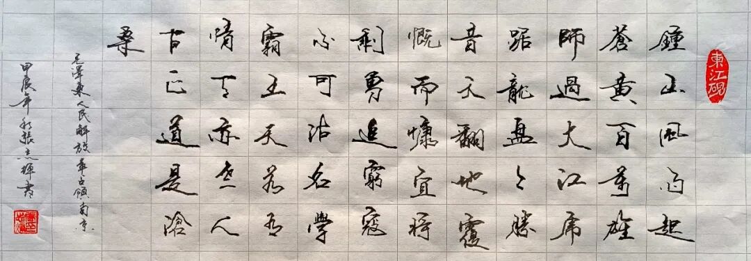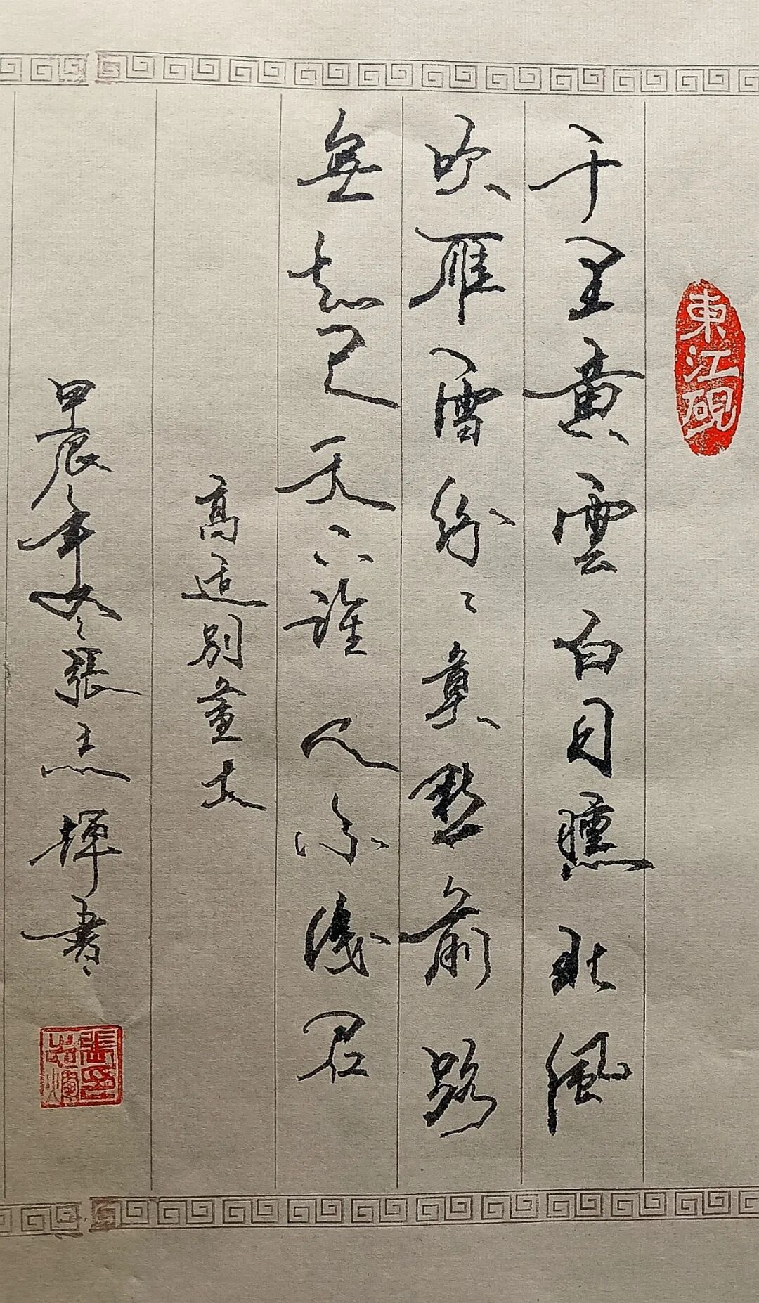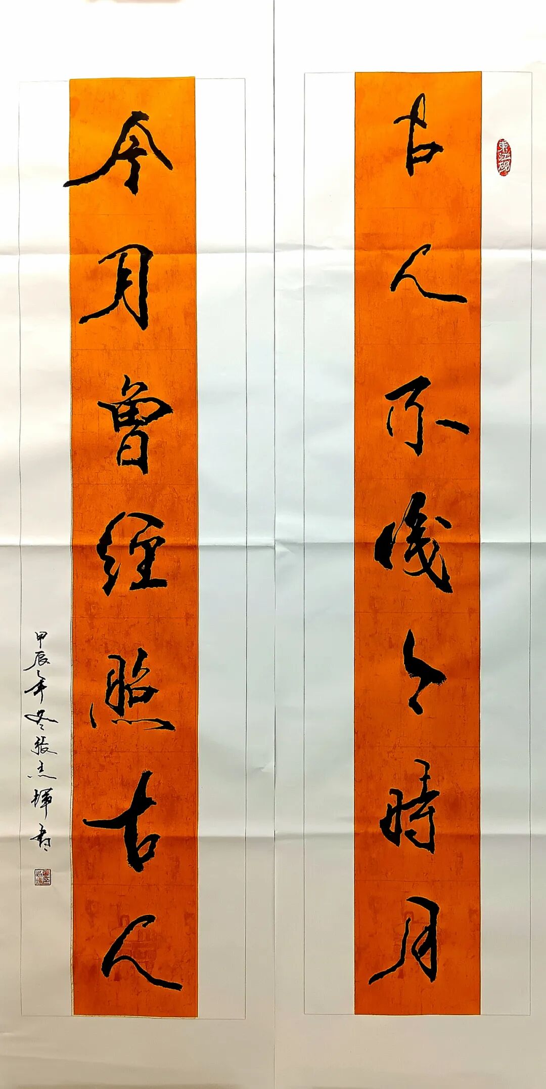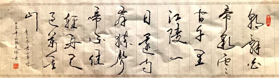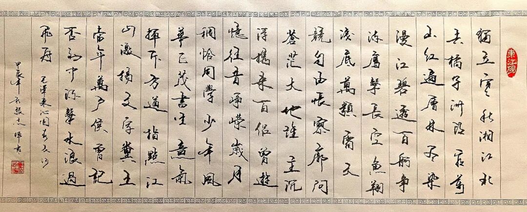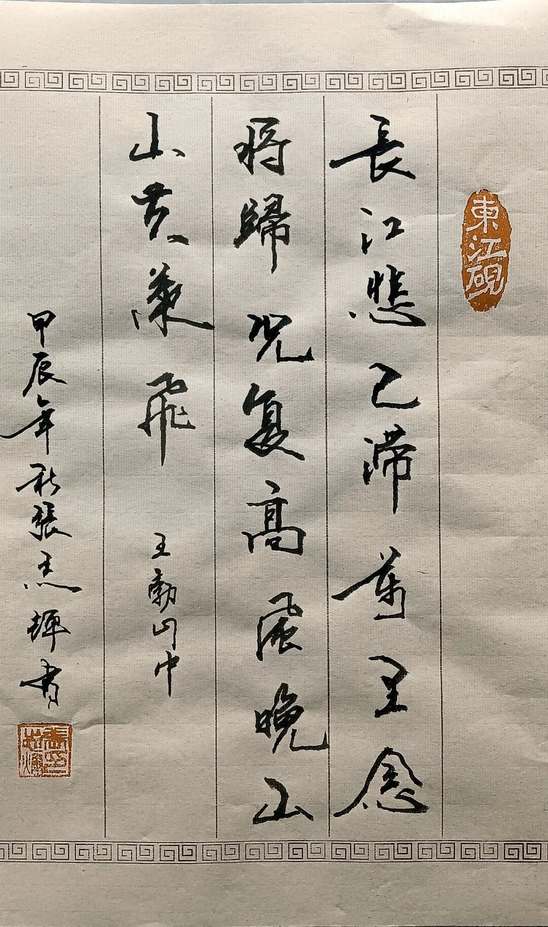 再者,能在行书领域脱颖而出,不仅因为他的用笔功夫,更在于他将书法艺术与文学修养的完美融合。正所谓"腹有诗书气自华",先生深谙文以载道的真谛,笔下书法往往以经典诗文为载体。观其作品,既有如"烟锁池塘柳,桃燃锦江堤"这般意境深远的楹联佳构,笔风淳畅,字字珠玑;又有如"故园渺何处,归思方悠哉"之类的抒情小札,行云流水,情思绵长。这些流传千年的诗文经典,通过他富有文人气的笔墨重新焕发光彩,而他对诗词文学的深刻理解,同样为其书法注入了隽永的精神内涵!