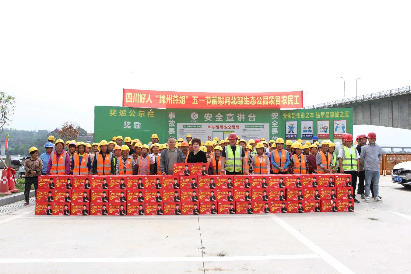 随后,燕姐一行来到绵阳市涪城区青义镇。在涪城区住建局局长陶波的安排下,综合执法办罗小平陪同燕姐慰问正在建设涪城区北部生态公园的农民工兄弟。燕姐亲手将节日礼品递到农民工们手中,并且衷心地感谢他们为城市建设添砖加瓦所贡献的力量。农民工们深受感动,纷纷表示对燕姐给予的关心和厚爱感激不尽。