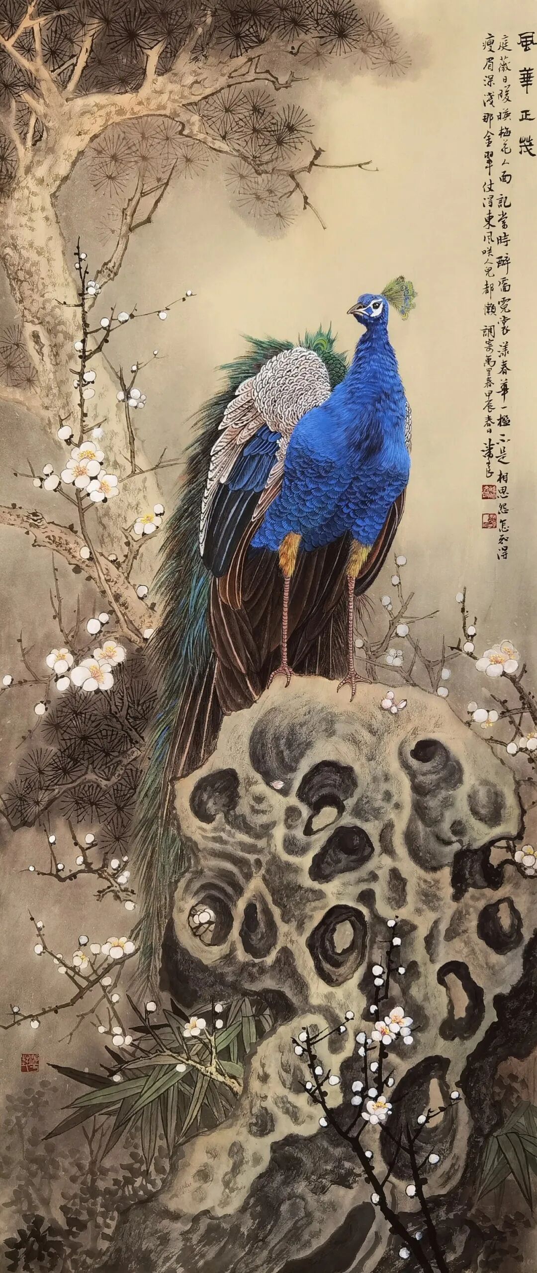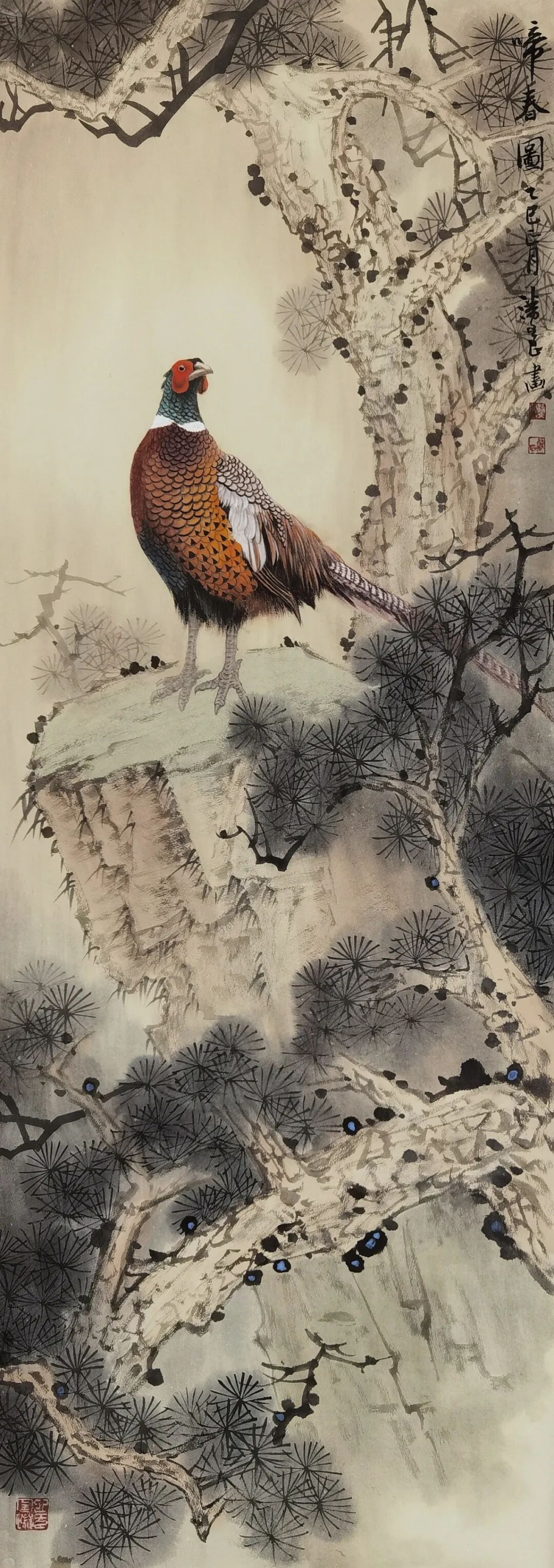 潘文良的花鸟画继承了中国传统写意花鸟的精髓,同时融入个人对自然万物的细腻观察。他的花鸟作品笔墨简练,设色清丽,尤其擅长表现禽鸟的灵动与花卉的娇艳,画面充满生机与情趣。