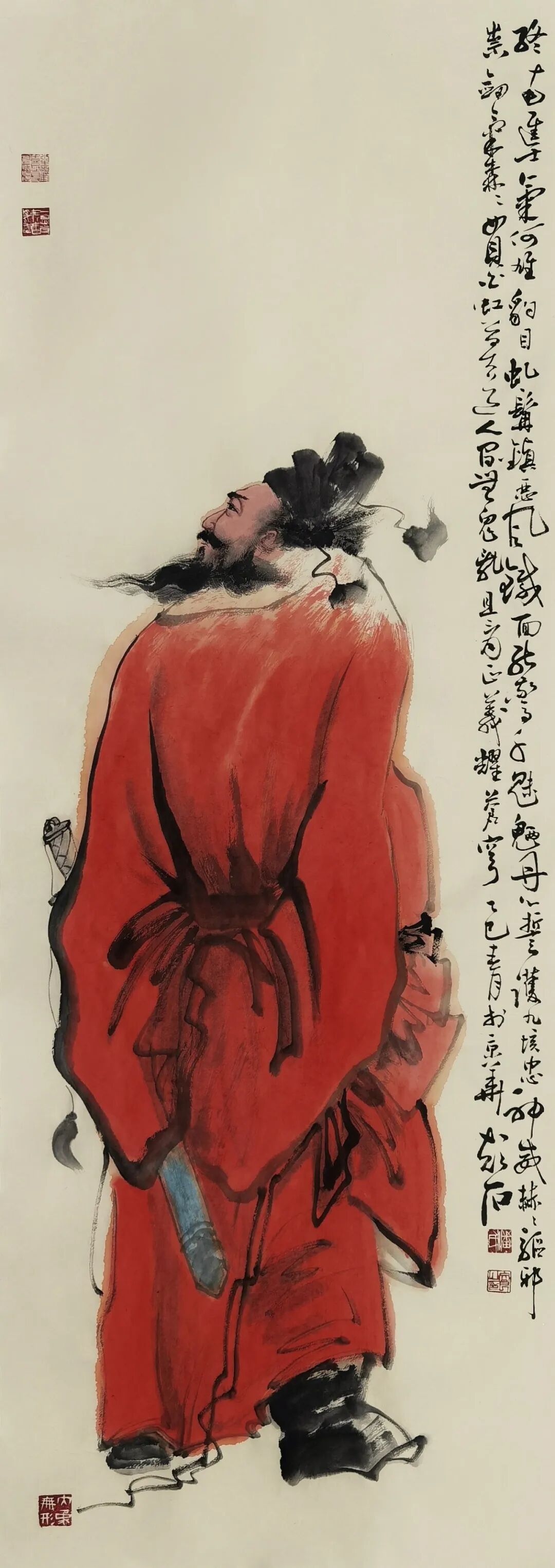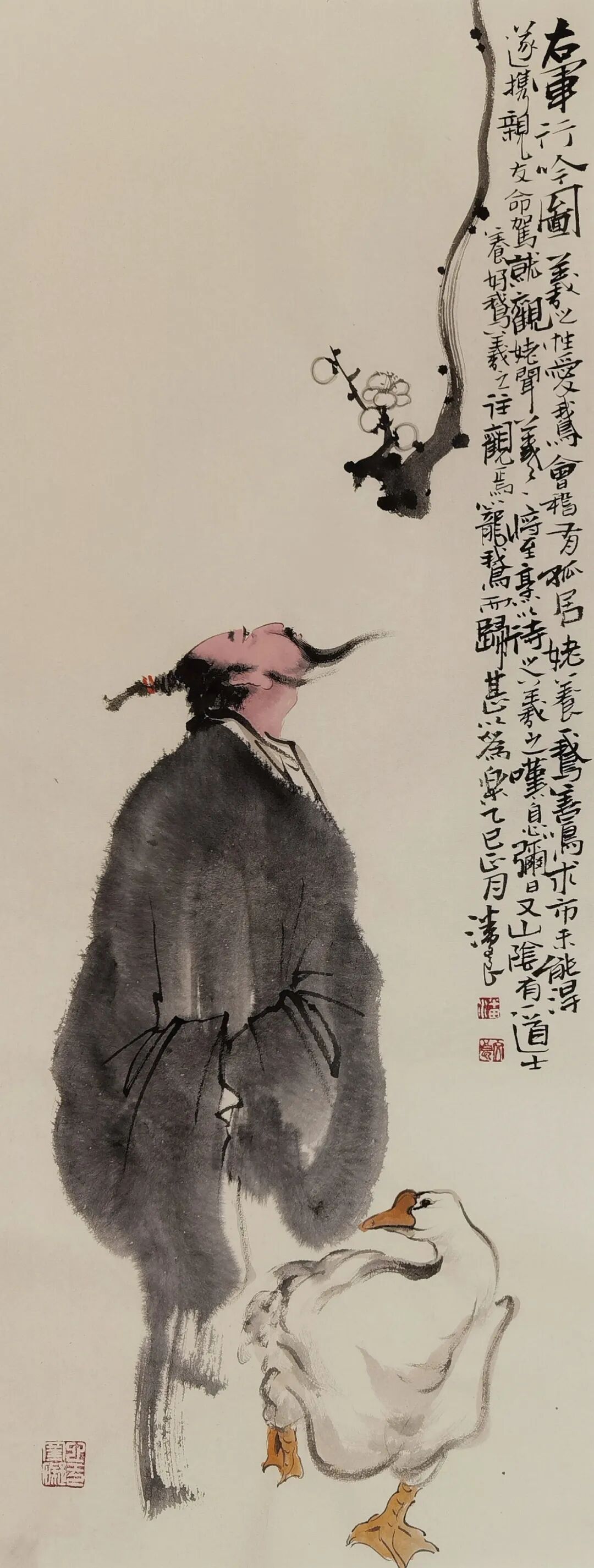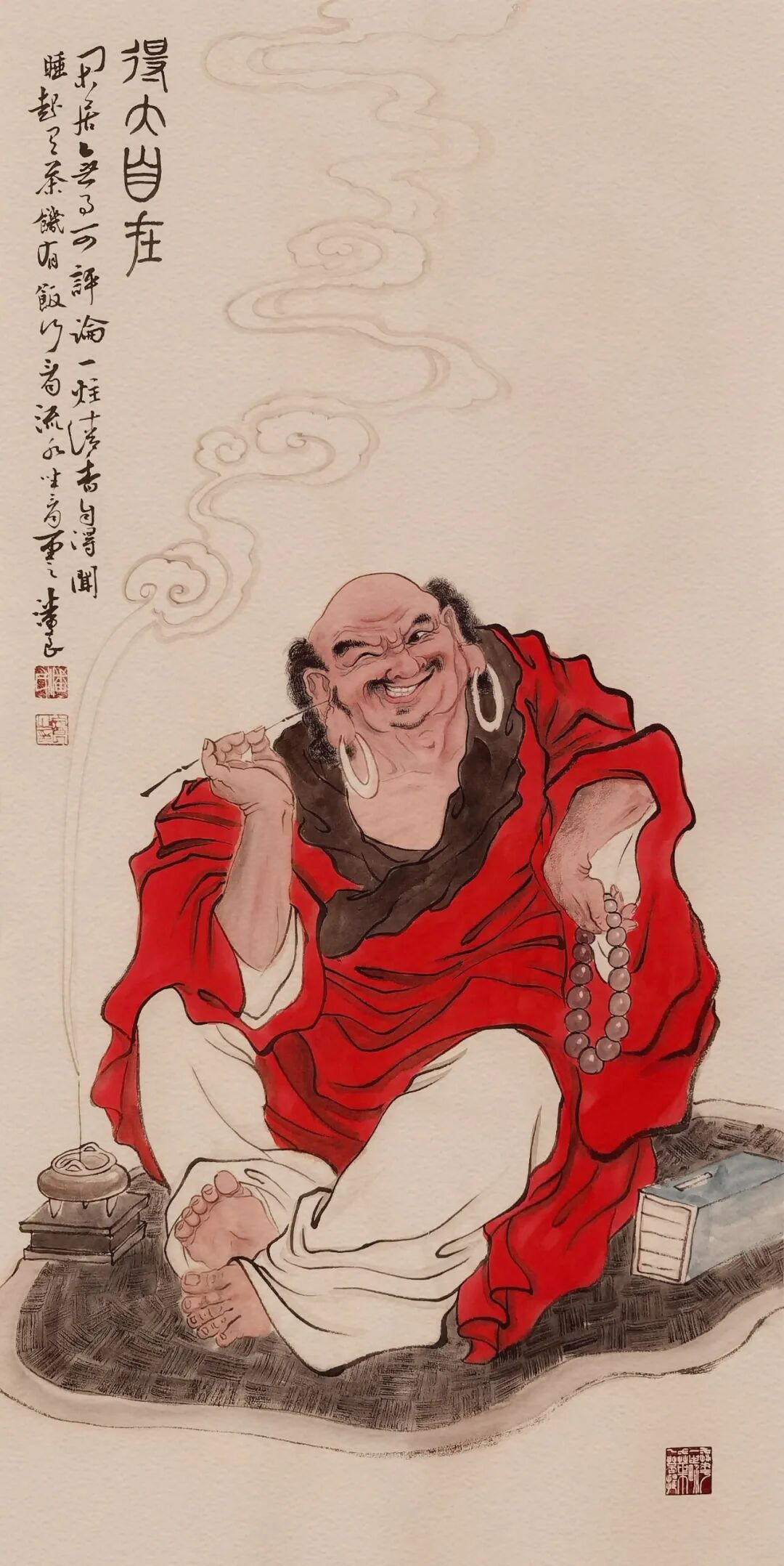 画中人物衣纹飘逸,神态自若,背景与人物浑然一体,既有古典题材的雅致,又赋予现代审美的表达。他的民俗人物画则充满生活气息,笔墨间流淌着浓郁的地域文化特色,令人回味无穷。