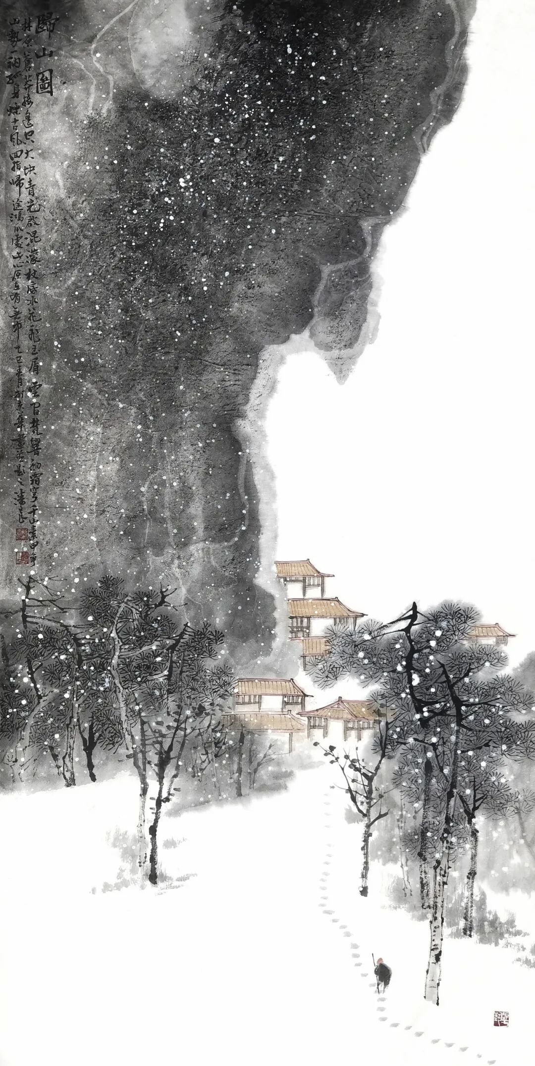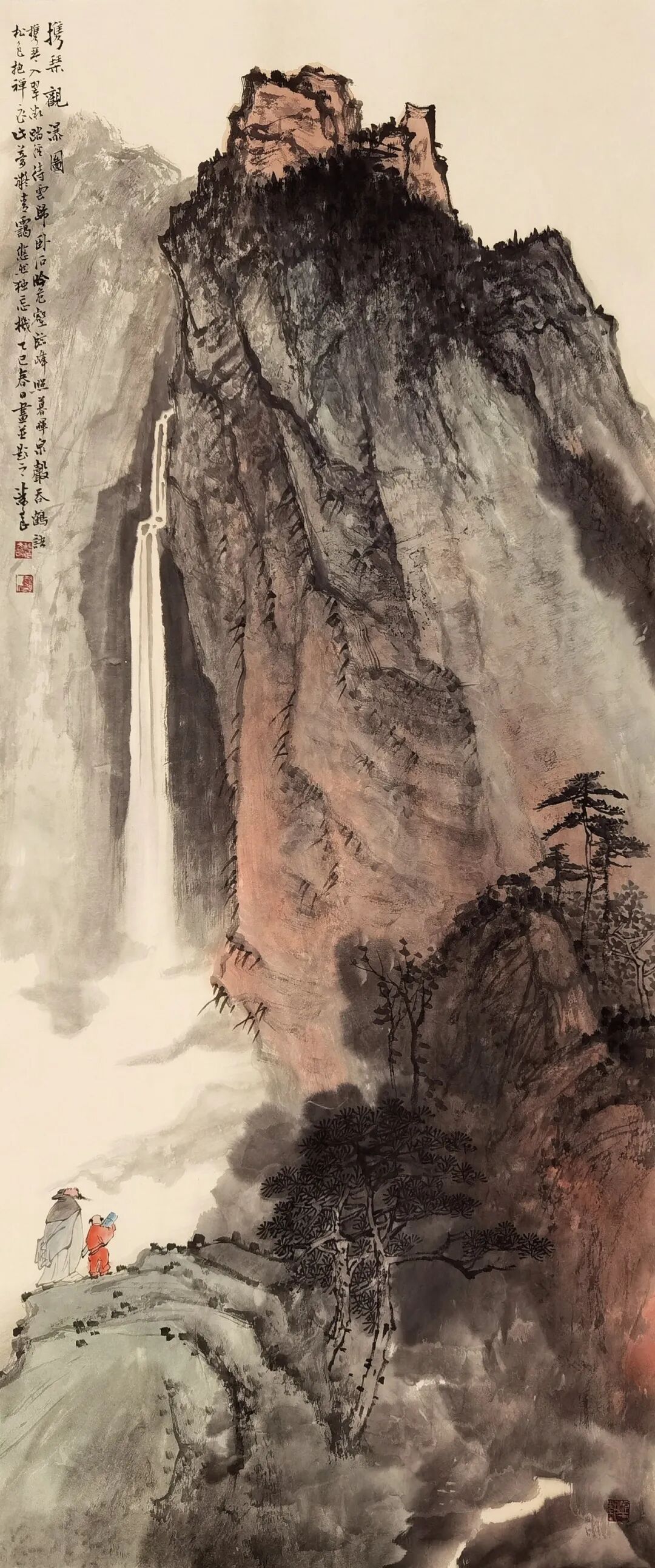 如《携琴观瀑图》,构图严谨,笔力遒劲,山石树木的勾勒皴染极具古意,而云雾流水的处理则充满现代水墨的流动感。观其山水,既能感受到传统文人的隐逸情怀,又能领略到当代艺术家对自然与人文的深刻思考。