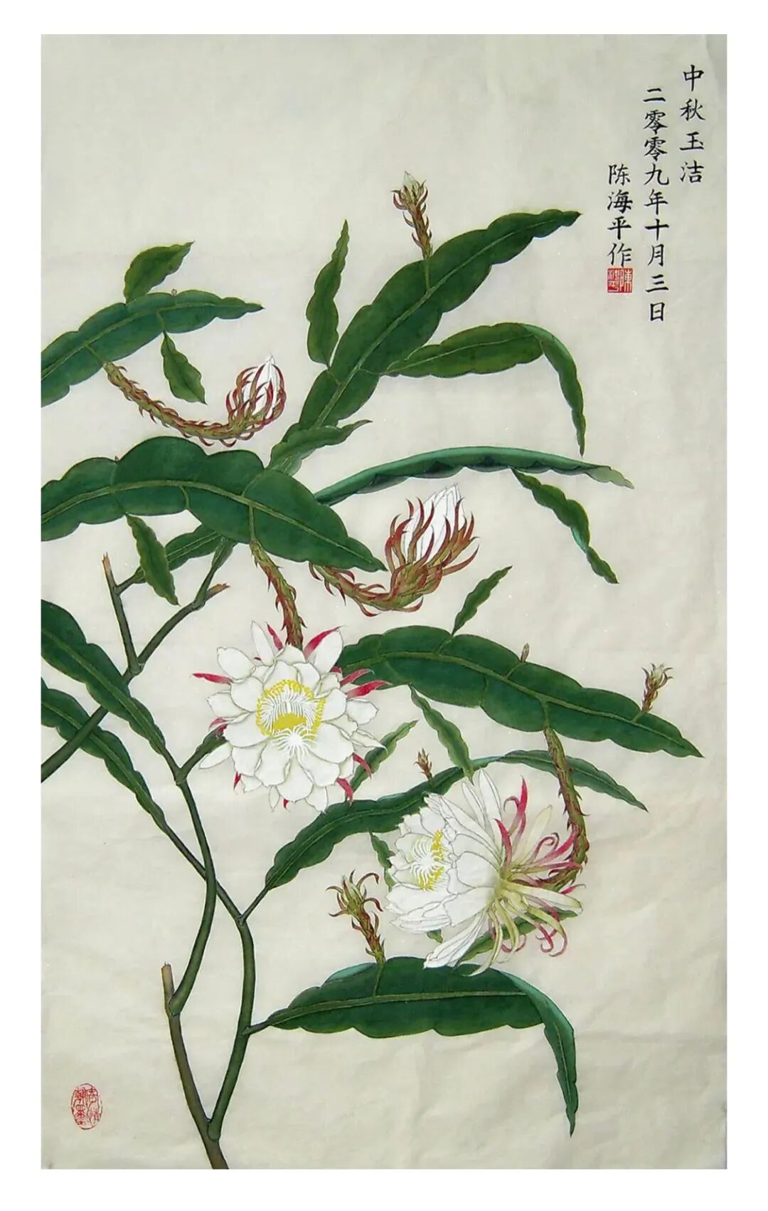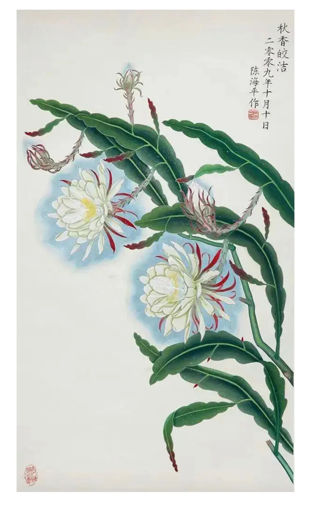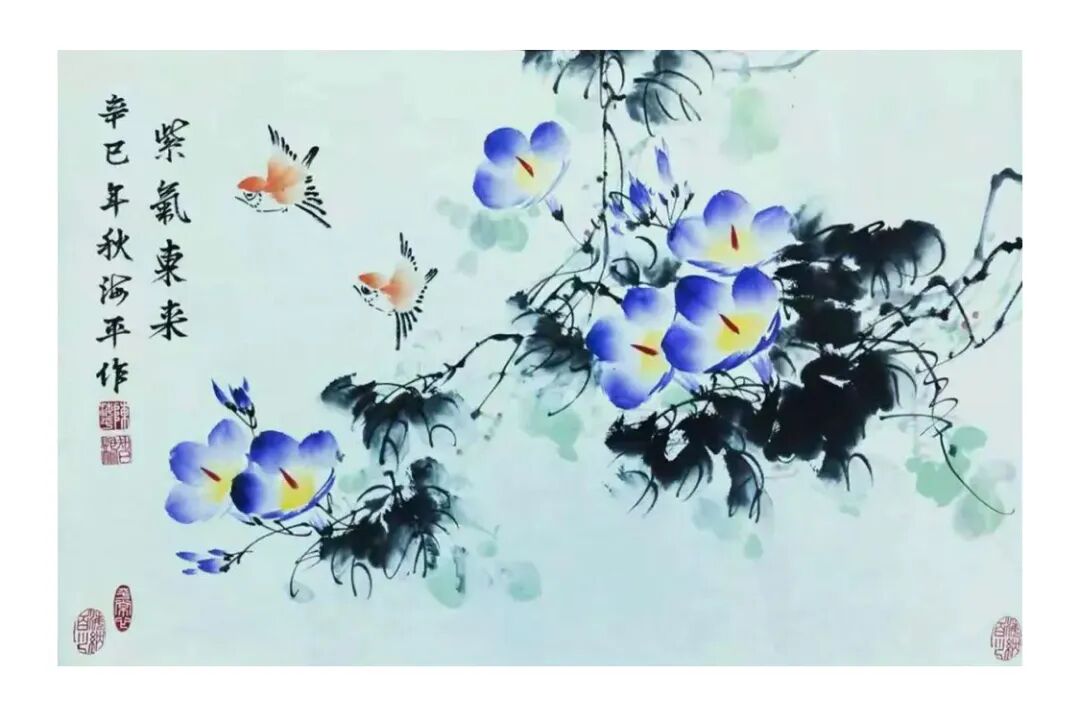 画花卉全以得势为主,此为先贤画论之妙谛。而陈海平先生于花鸟取势,也是自有一番妙趣可察。一幅牡丹佳作,花团锦簇而不失章法,华艳天香中自见秩序,枝叶间或宜隐藏,或宜显露,总之皆是各得其宜,而非一味填塞的匠俗手段。又有《中秋玉洁》、《秋香皎洁》一系列画作,也是尽显花木真形,姿态或宜于承露、或宜于迎曦,布置之法,势如勾股,一花一叶,正可谓主宾分明也!换句话说,陈海平先生是很擅长在章法上做文章,大小疏密相生,虚实层次分明,在他的画中都是可以一目了然,而这也是充分证明了陈海平先生“立意定景”的深厚功夫!