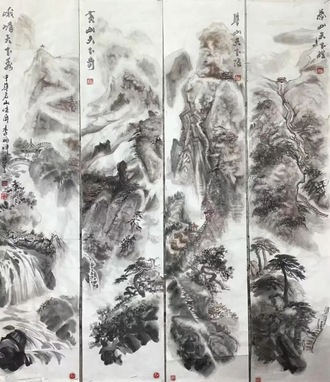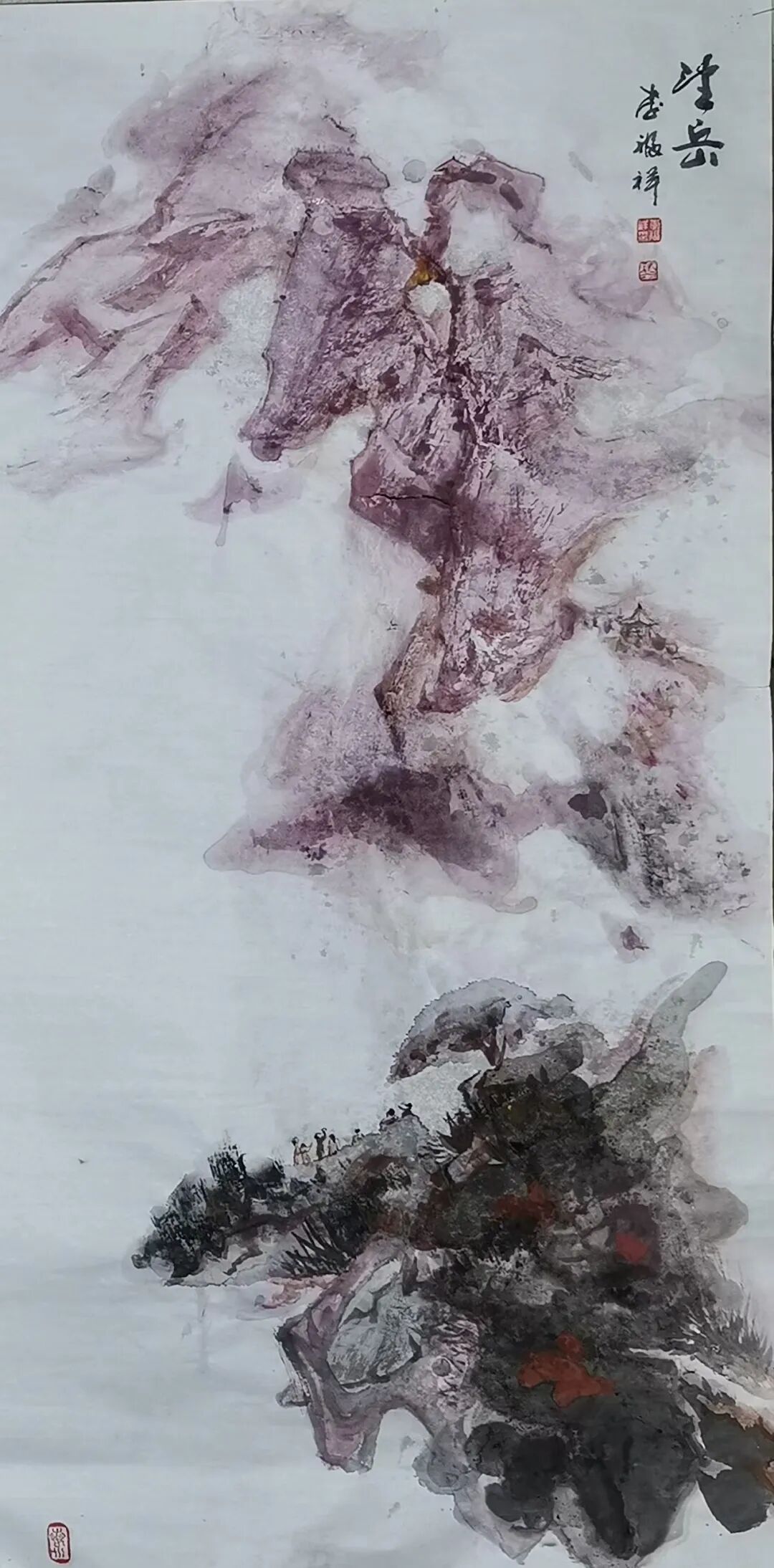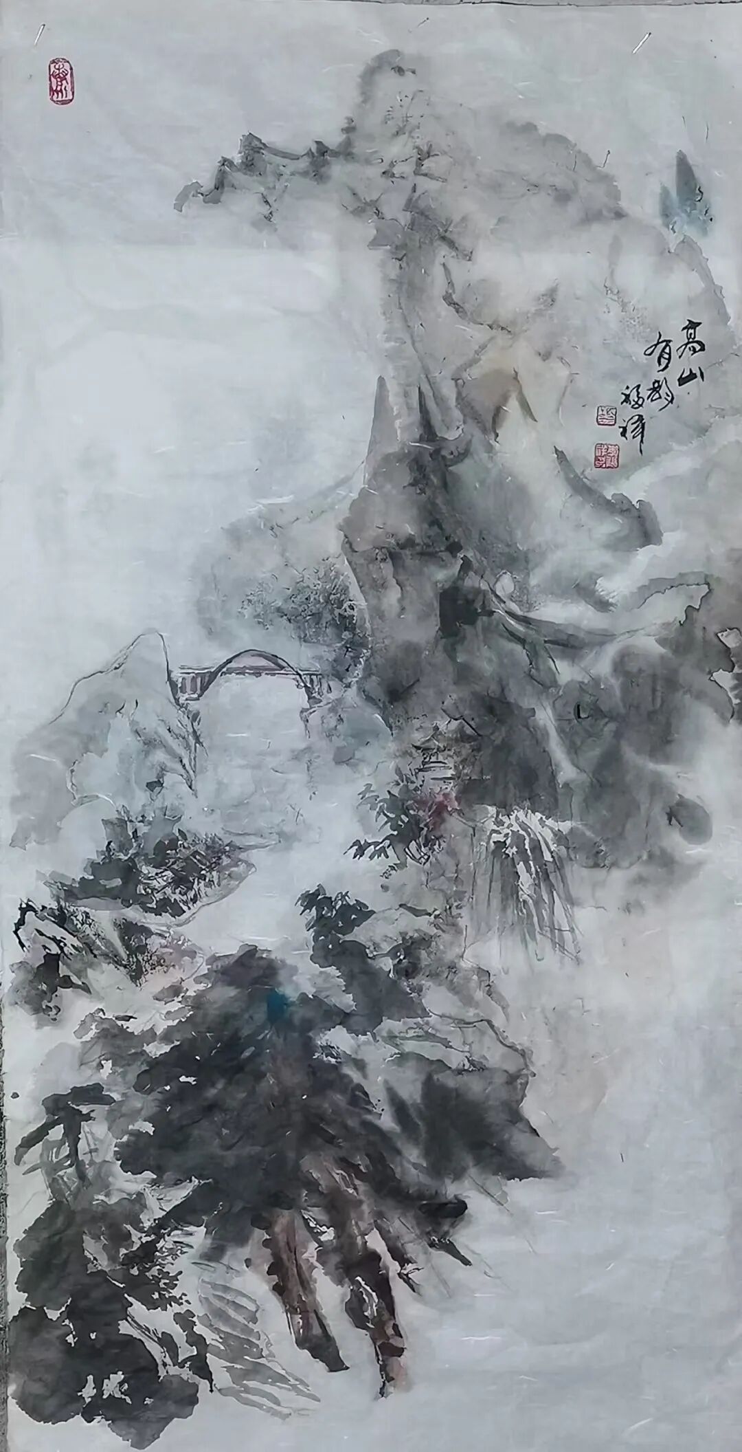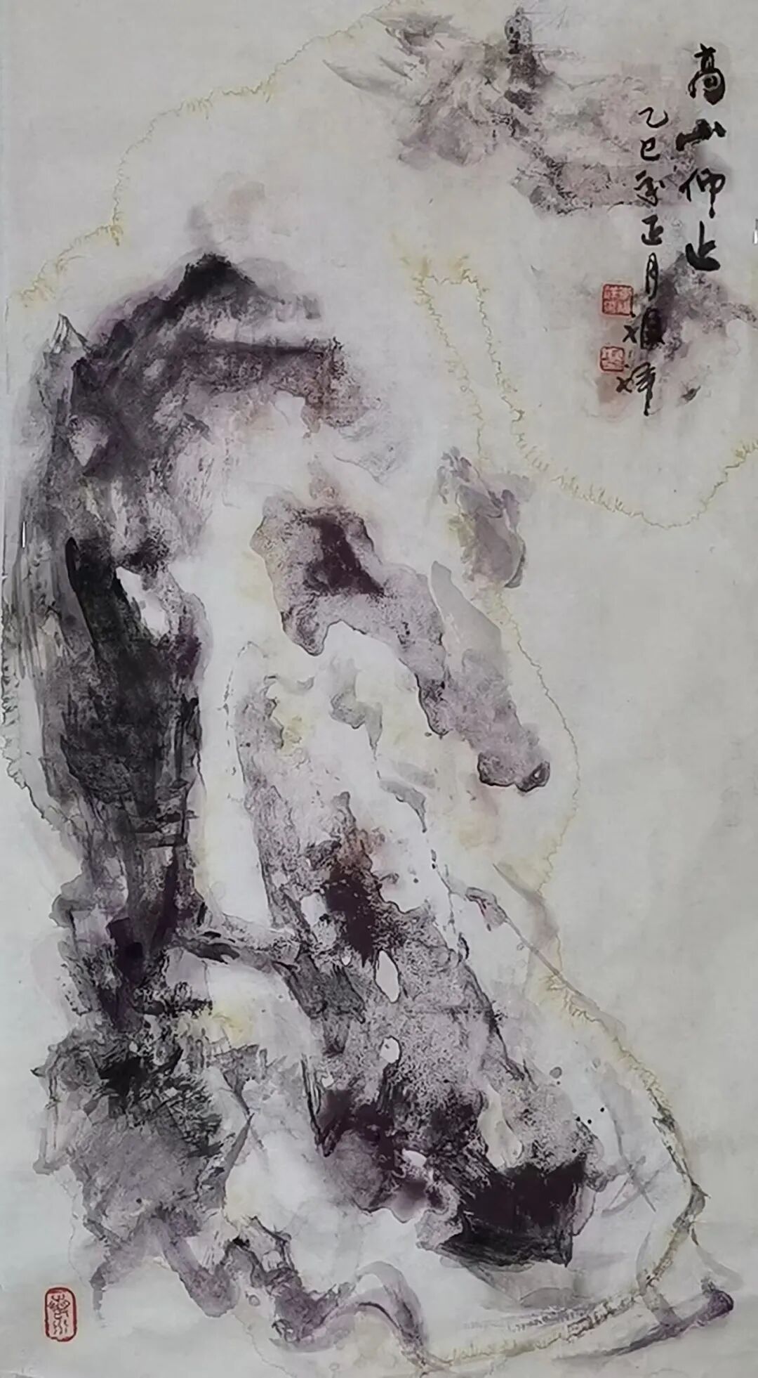 从中国画艺术的角度来看,传统山水的皴法是表现山水的基础,对于这些,李福祥先生自然也是了然于心。但作为新时代山水画家,久久摹取自然不是立意之道,惟有“笔墨当随时代”,方才是正道。当然,这并不代表是要抛弃传统,而是对传统加以变化,就像李福祥先生的山水笔墨,从中你所能看到的,绝不是一家一派的笔墨风格,而是属于化古今用的集众之境。就比如这幅《高山仰止》,底蕴始终还是中国文人画"以形传韵"的美学血液。山峦用淡墨渲染,水墨在徐徐澹染而又层层推远,实乃缣素本色萦拂以淡水而痕之,既取森森之气,又得穆穆之容,直令观者飘然有霞举之思也!