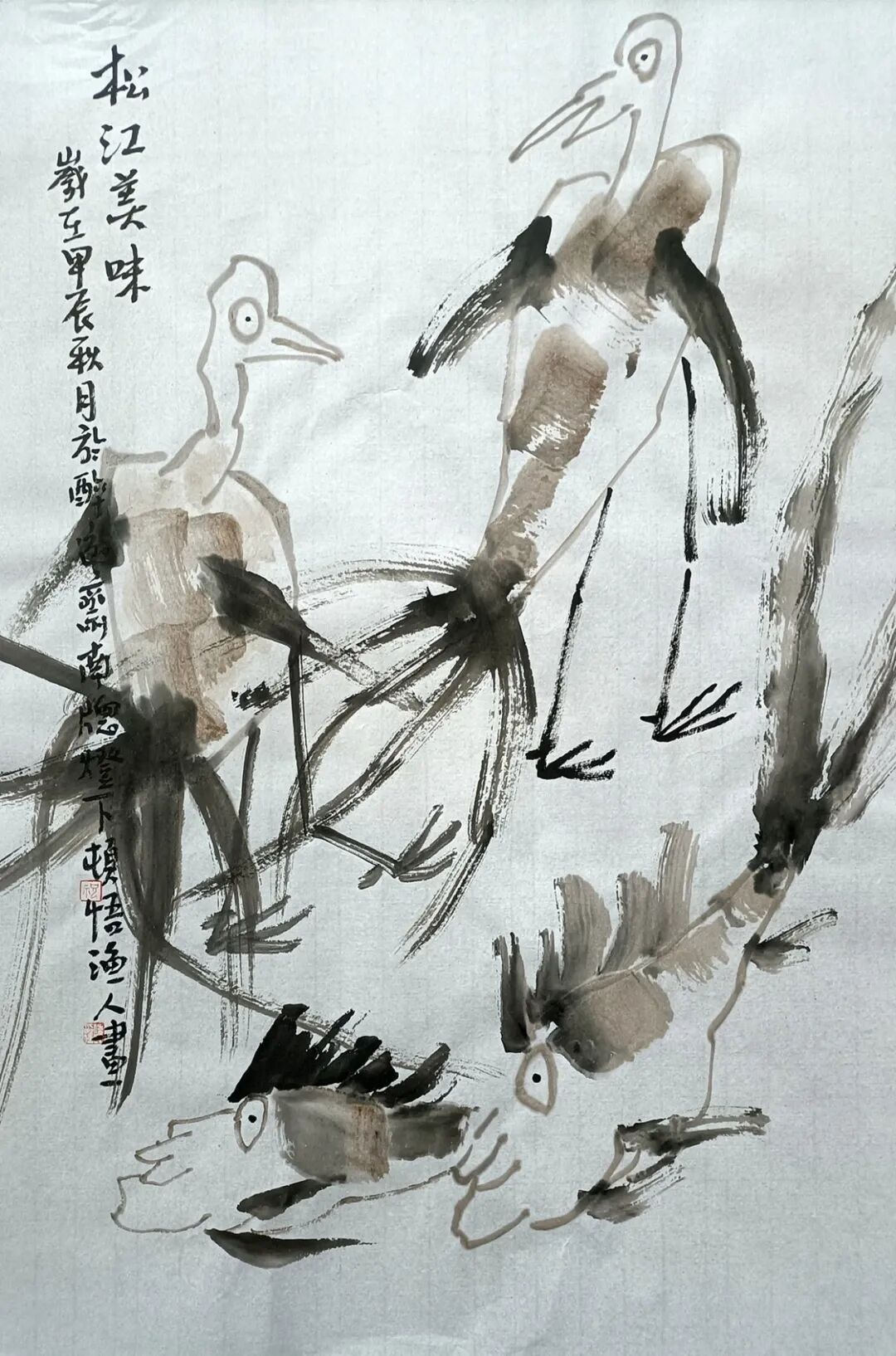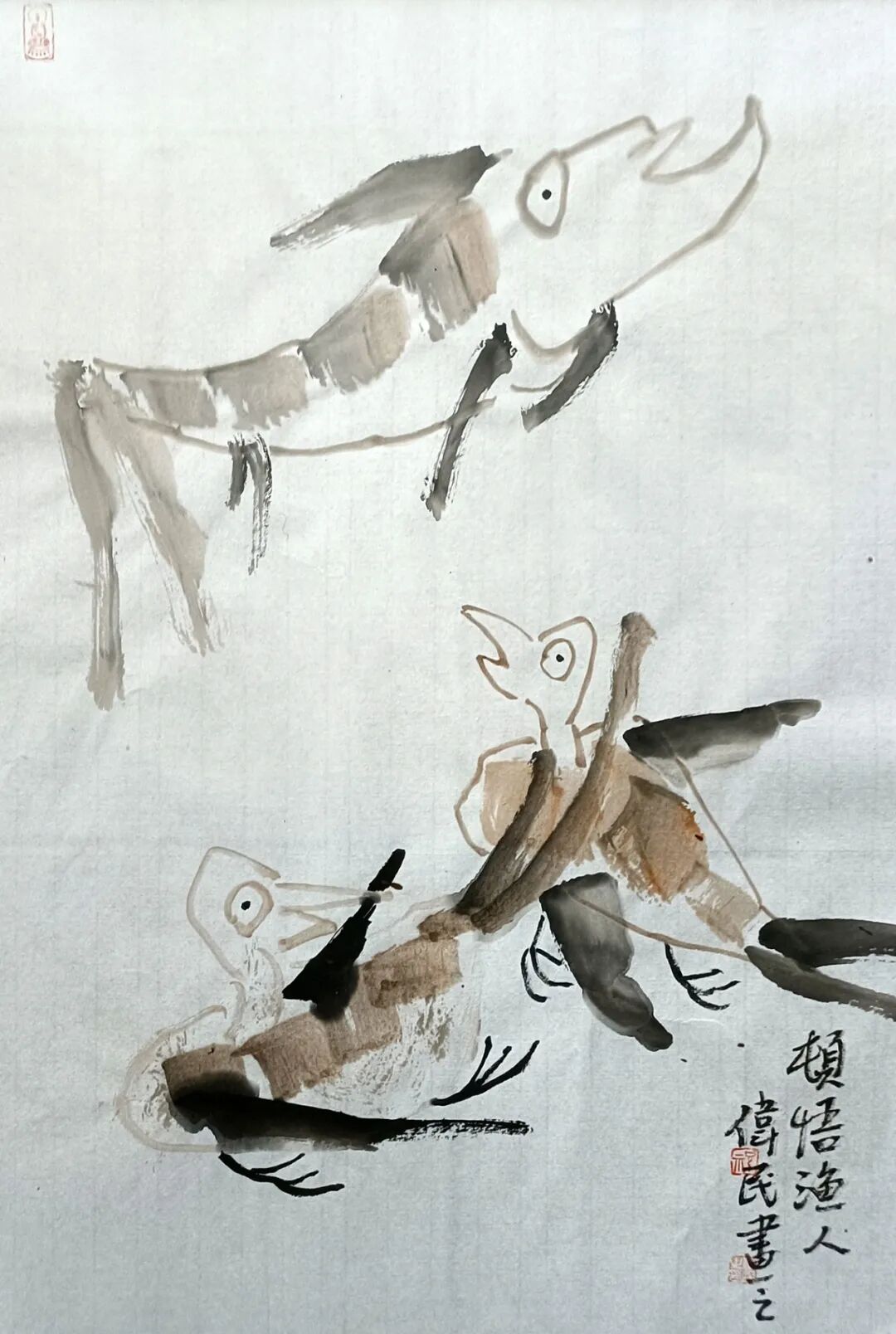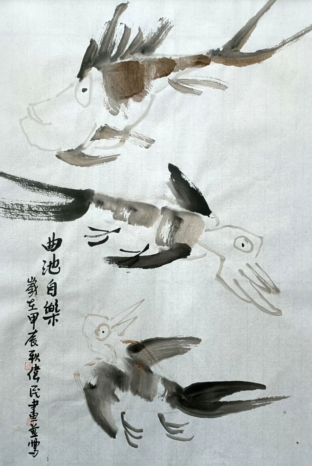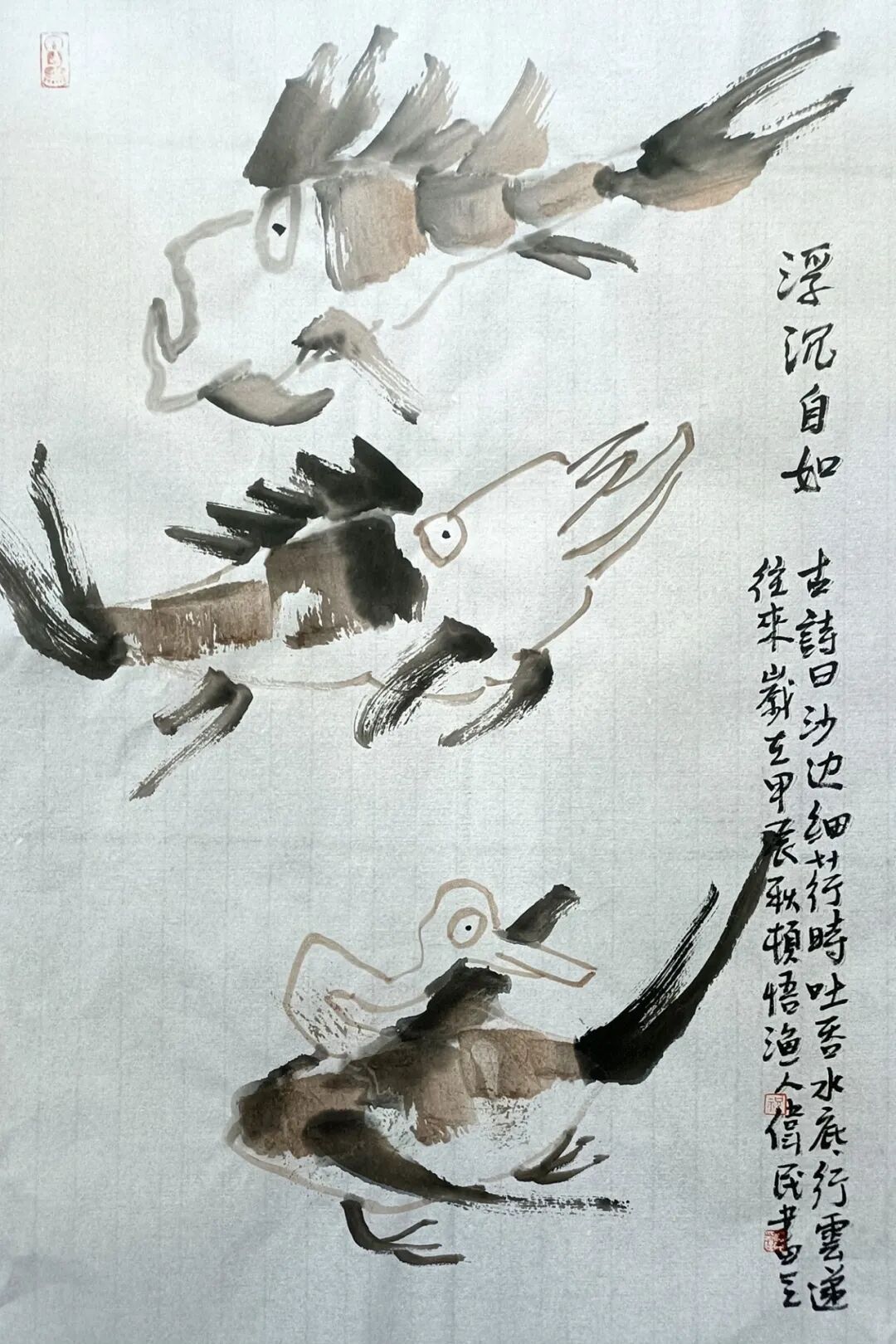 祝伟民先生的水墨大写意鱼也颇具韵味,常以简洁豪放的笔墨勾勒鱼的形态,寥寥数笔抓住鱼的神韵,墨色干不枯,淡而润,浓淡变化间展现鱼的灵动活泼。构图群鱼错落有致,营造鲜活的生态氛围,让大写意专注重意境与神韵传达,这是画家对水墨特性的熟练驾驭和独特的艺术表达结果。