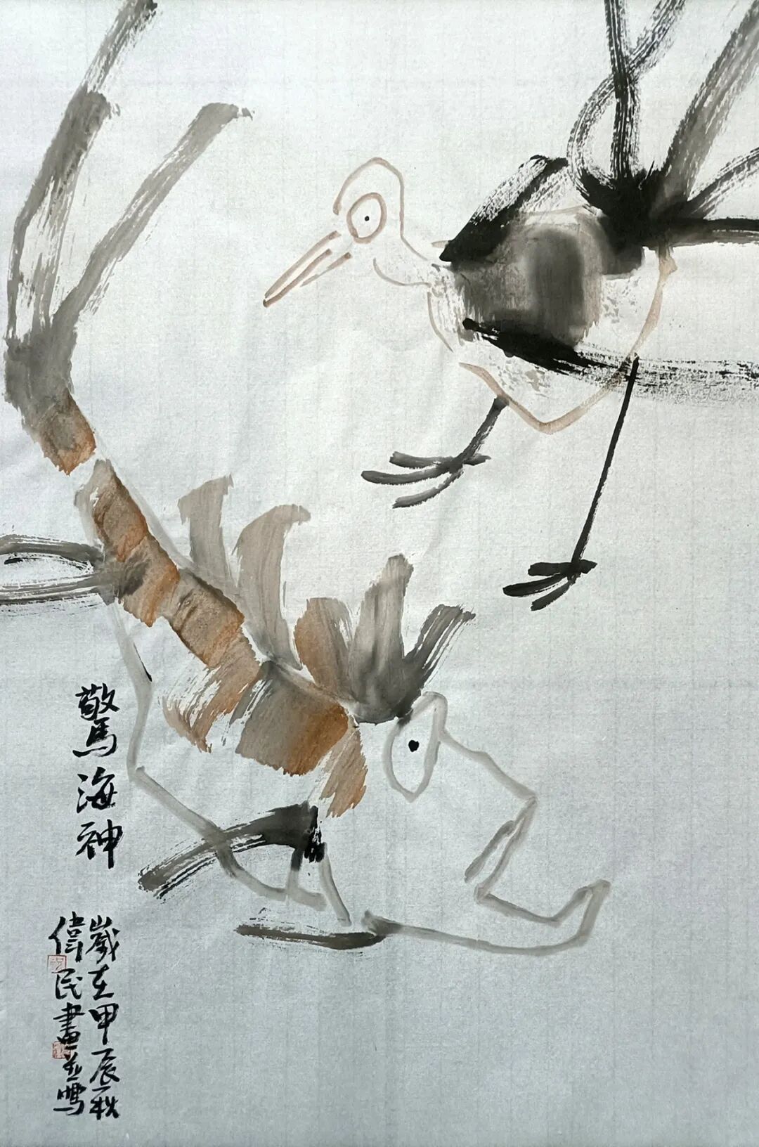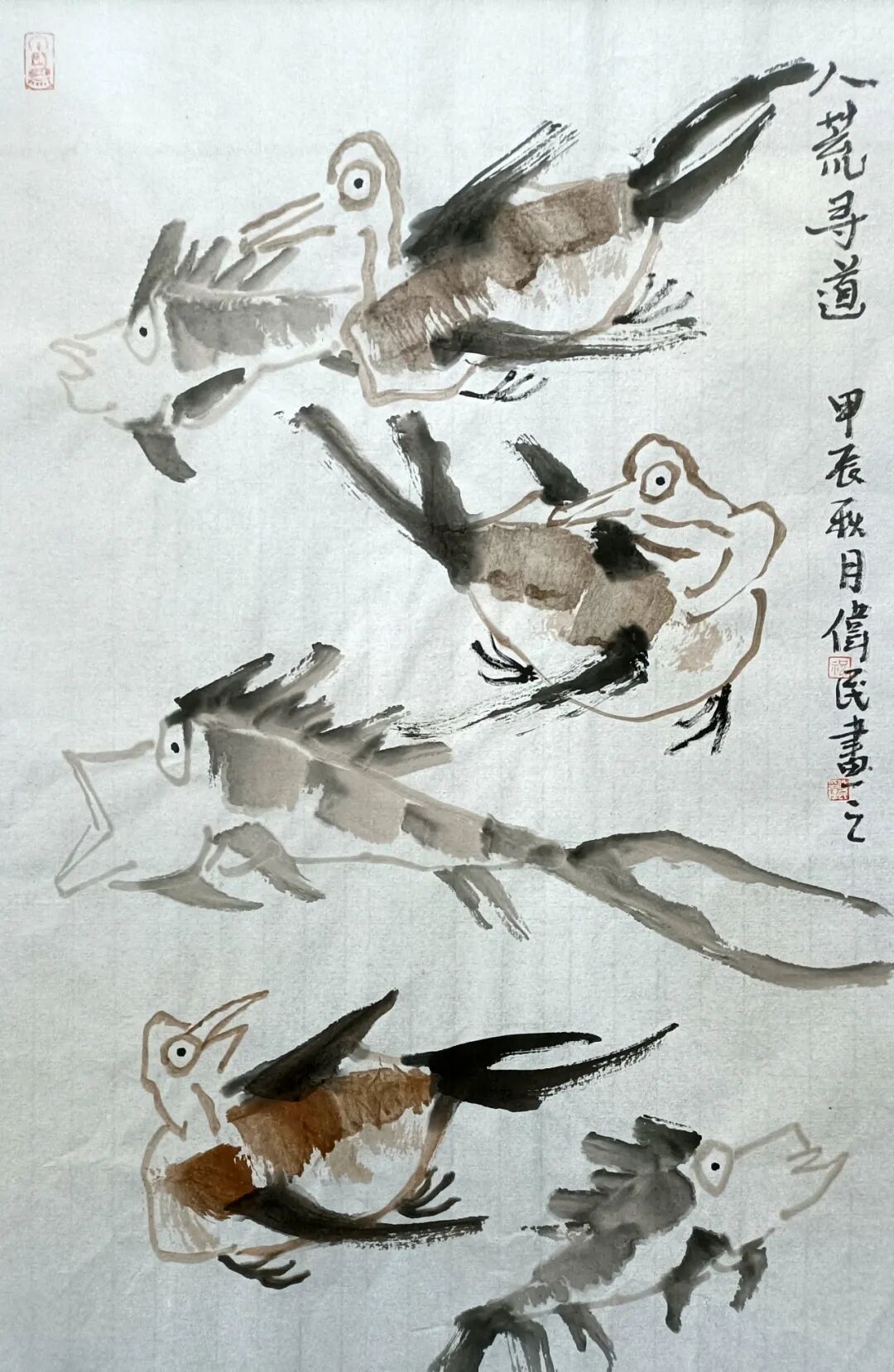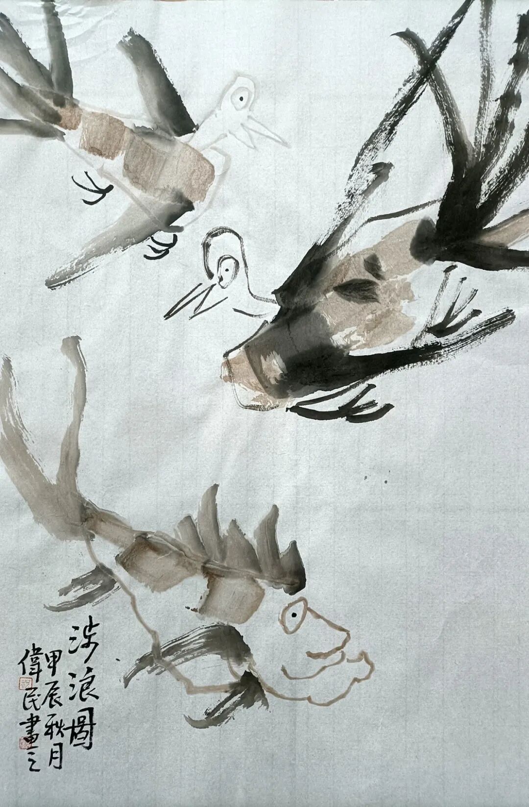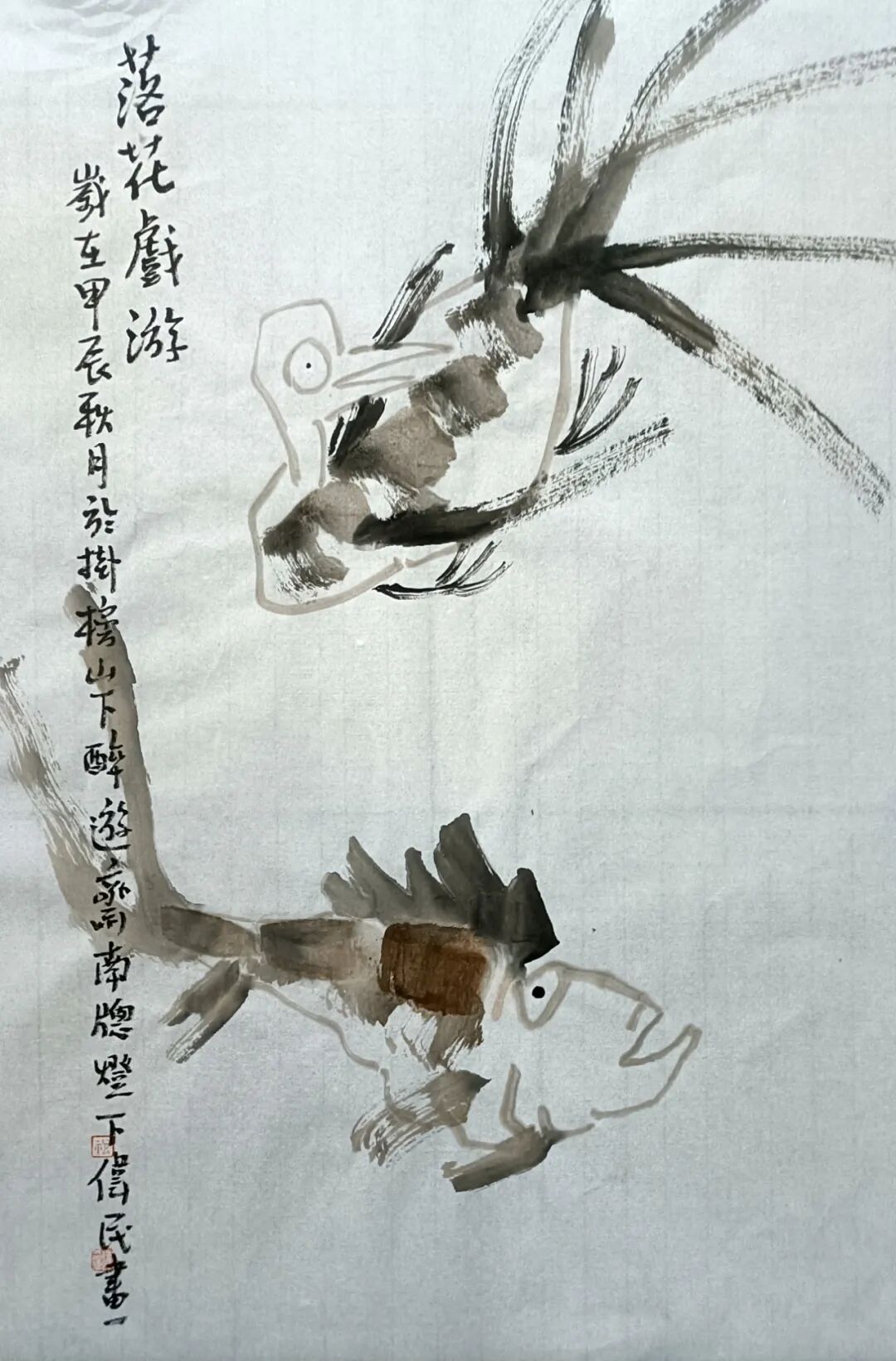 祝伟民先生的水墨大写意鱼也颇具韵味,常以简洁豪放的笔墨勾勒鱼的形态,寥寥数笔抓住鱼的神韵,墨色干不枯,淡而润,浓淡变化间展现鱼的灵动活泼。构图群鱼错落有致,营造鲜活的生态氛围,让大写意专注重意境与神韵传达,这是画家对水墨特性的熟练驾驭和独特的艺术表达结果。