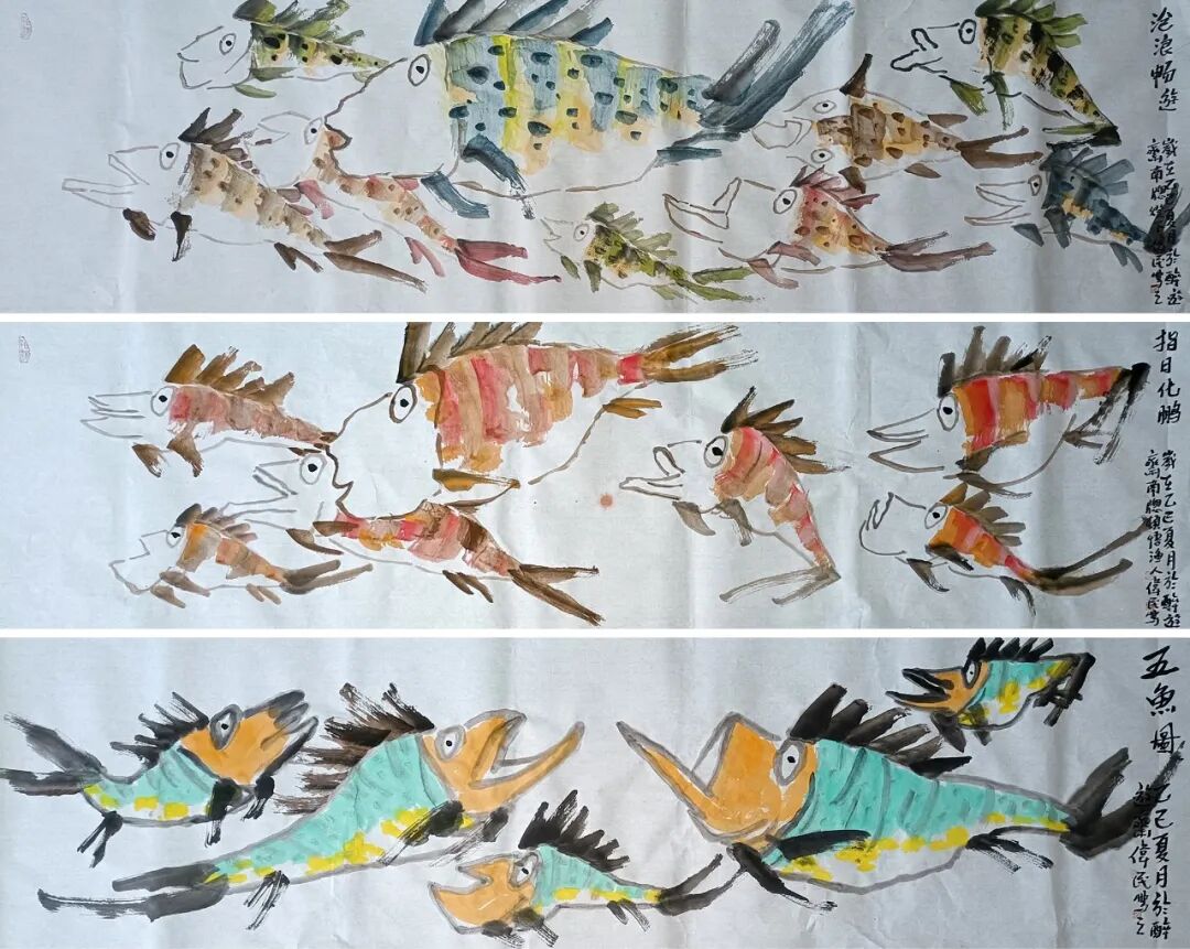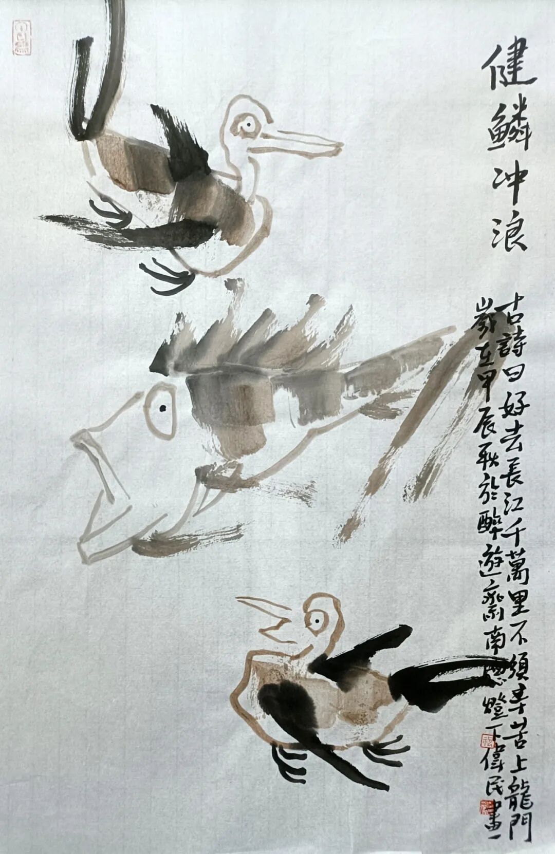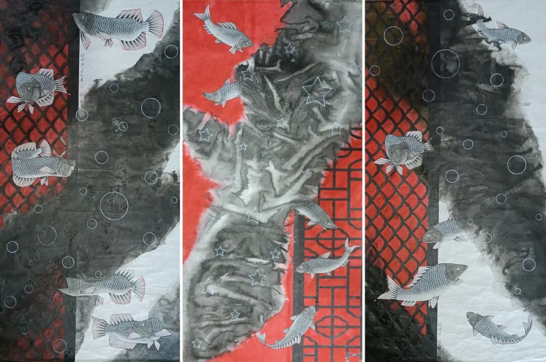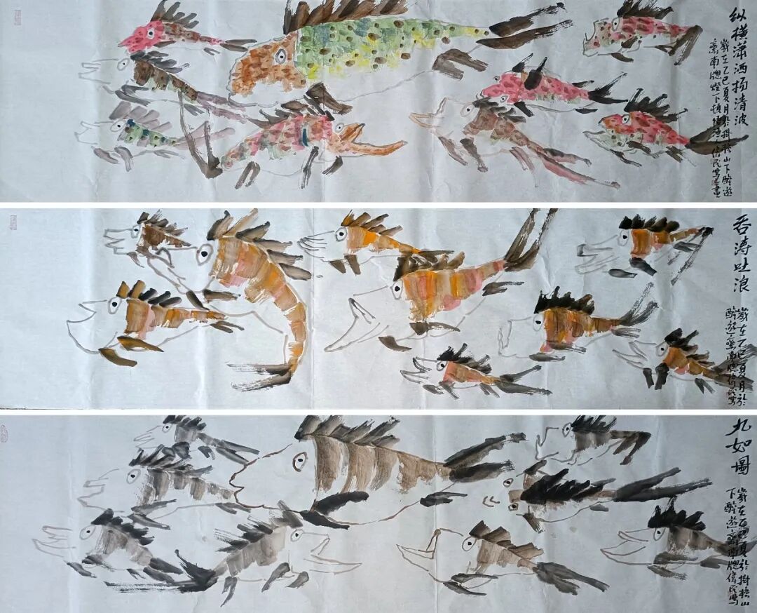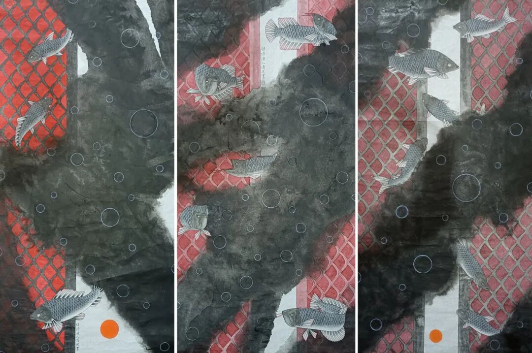 九州博大丹青遥,江南鱼王功正劲。他的写意画鱼,非常擅长迅疾的勾线和快意的水墨点染,往往是即刻入境,一点神睛,率直的线条,准确的墨韵,在形简意赅的构造中,尽显写意功法的奔放自如,这是对传统的继承,也是技法创建的功成:简笔速染,不但切合了天然鱼的生态品质,也切合了文化鱼的意境品位,依快而神,在鱼的动态中,似乎拔划出水的声韵,他的笔墨以有形且有声为艺术特点,开启了审美新境界的笔墨范式,为鱼题专绘创造出更为奇绝的艺术语言,形韵齐享。工笔鱼画示其技法为正宗,写意鱼画示其功法为创新,在工笔与写意全能才华的支撑下,他得遇江南鱼王心服赞叹,恰是大师当受,受之无愧!
