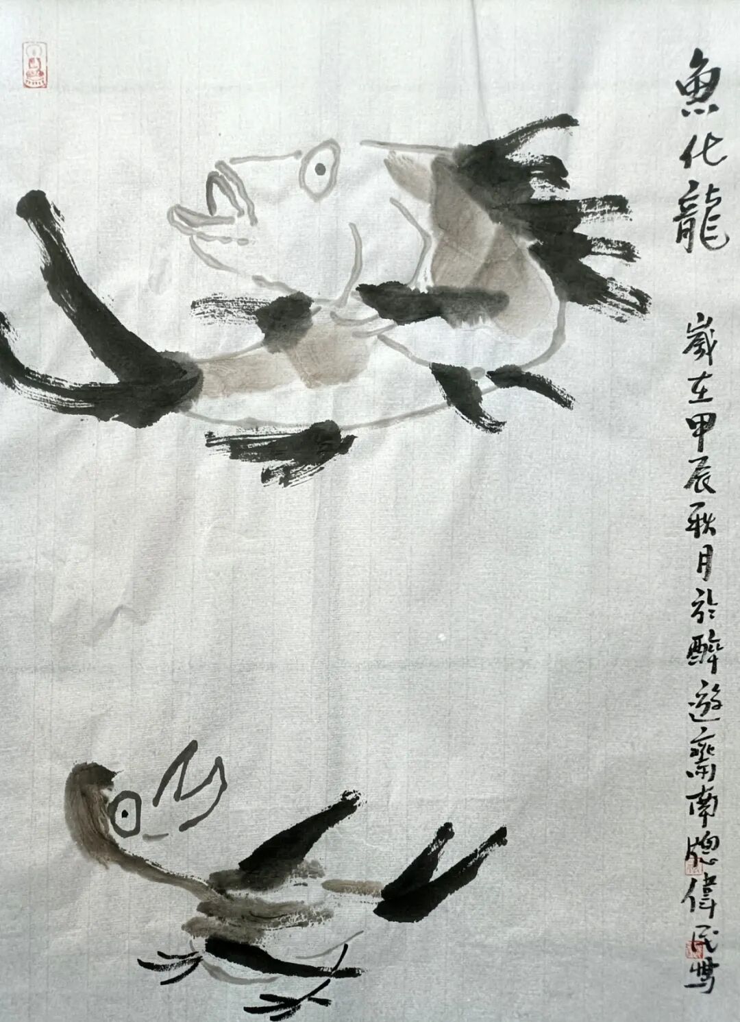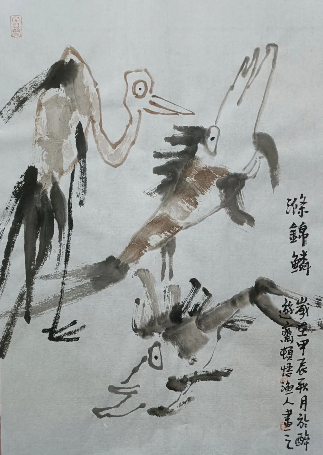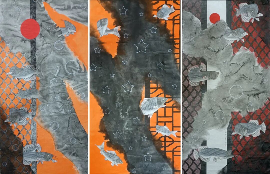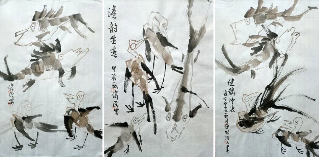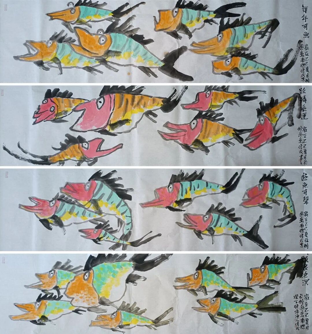 九州博大丹青遥,江南鱼王功正劲。他的写意画鱼,非常擅长迅疾的勾线和快意的水墨点染,往往是即刻入境,一点神睛,率直的线条,准确的墨韵,在形简意赅的构造中,尽显写意功法的奔放自如,这是对传统的继承,也是技法创建的功成:简笔速染,不但切合了天然鱼的生态品质,也切合了文化鱼的意境品位,依快而神,在鱼的动态中,似乎拔划出水的声韵,他的笔墨以有形且有声为艺术特点,开启了审美新境界的笔墨范式,为鱼题专绘创造出更为奇绝的艺术语言,形韵齐享。工笔鱼画示其技法为正宗,写意鱼画示其功法为创新,在工笔与写意全能才华的支撑下,他得遇江南鱼王心服赞叹,恰是大师当受,受之无愧!