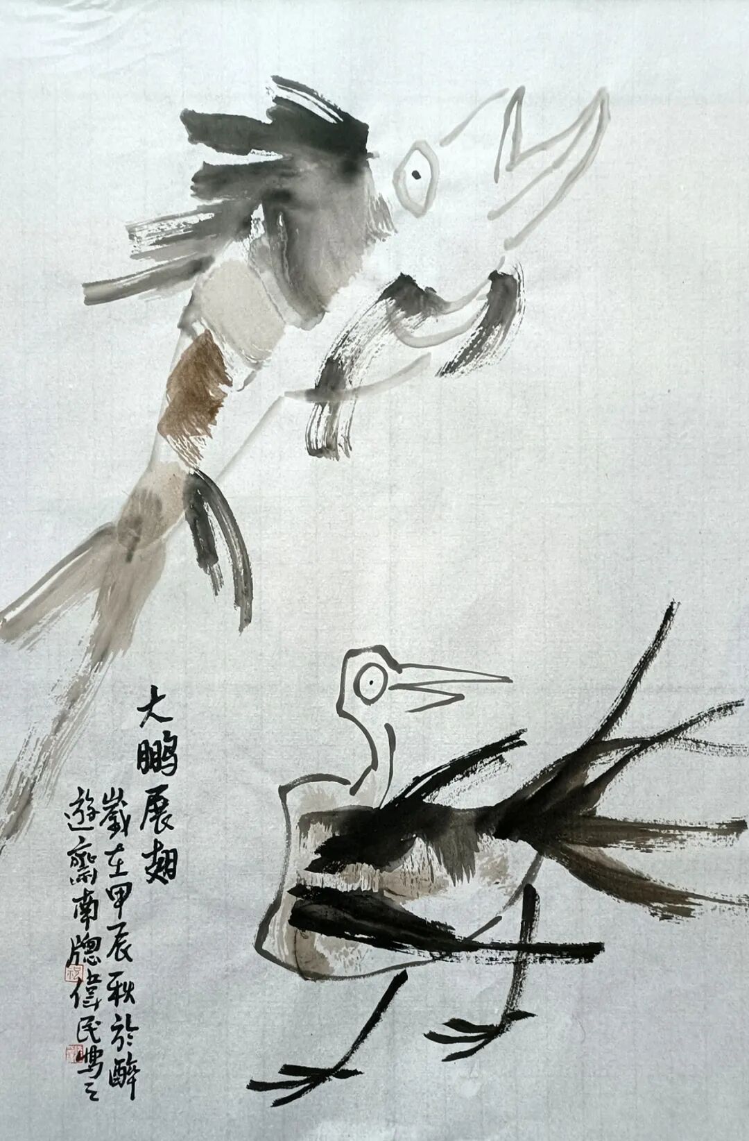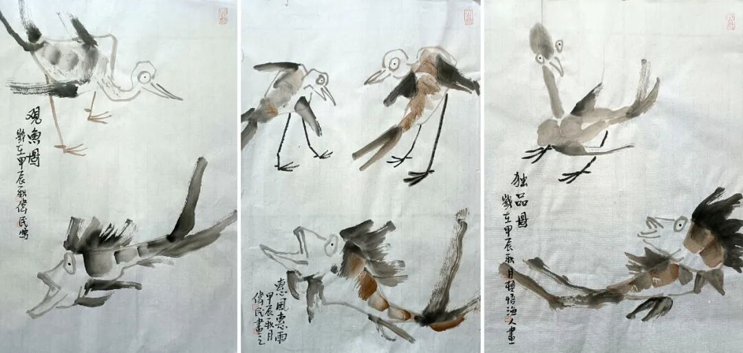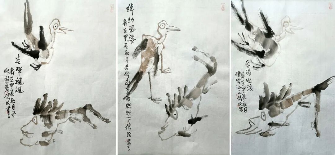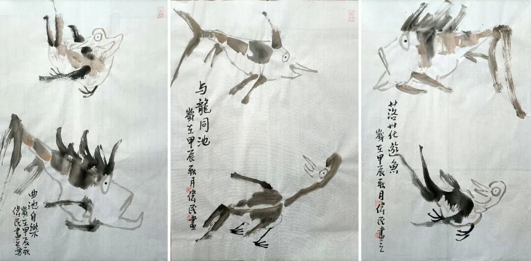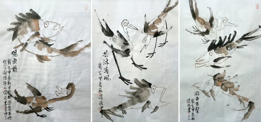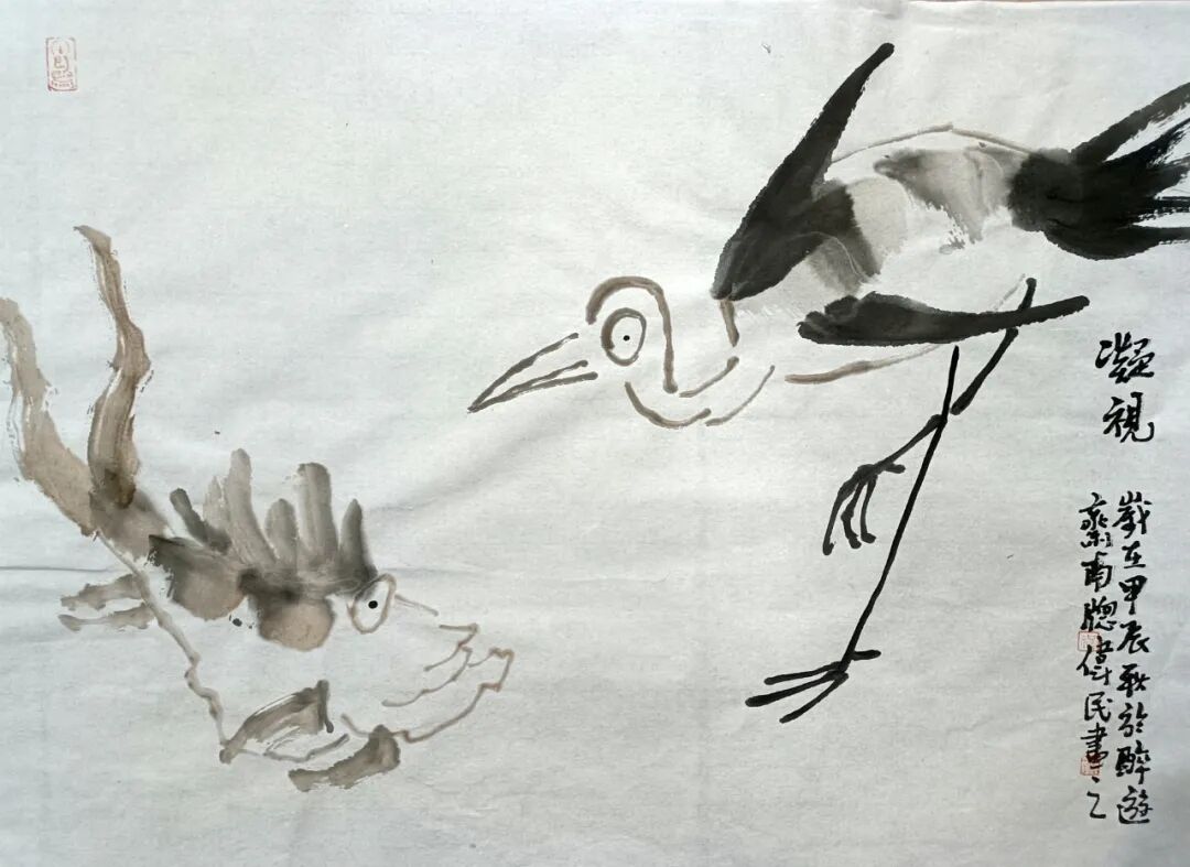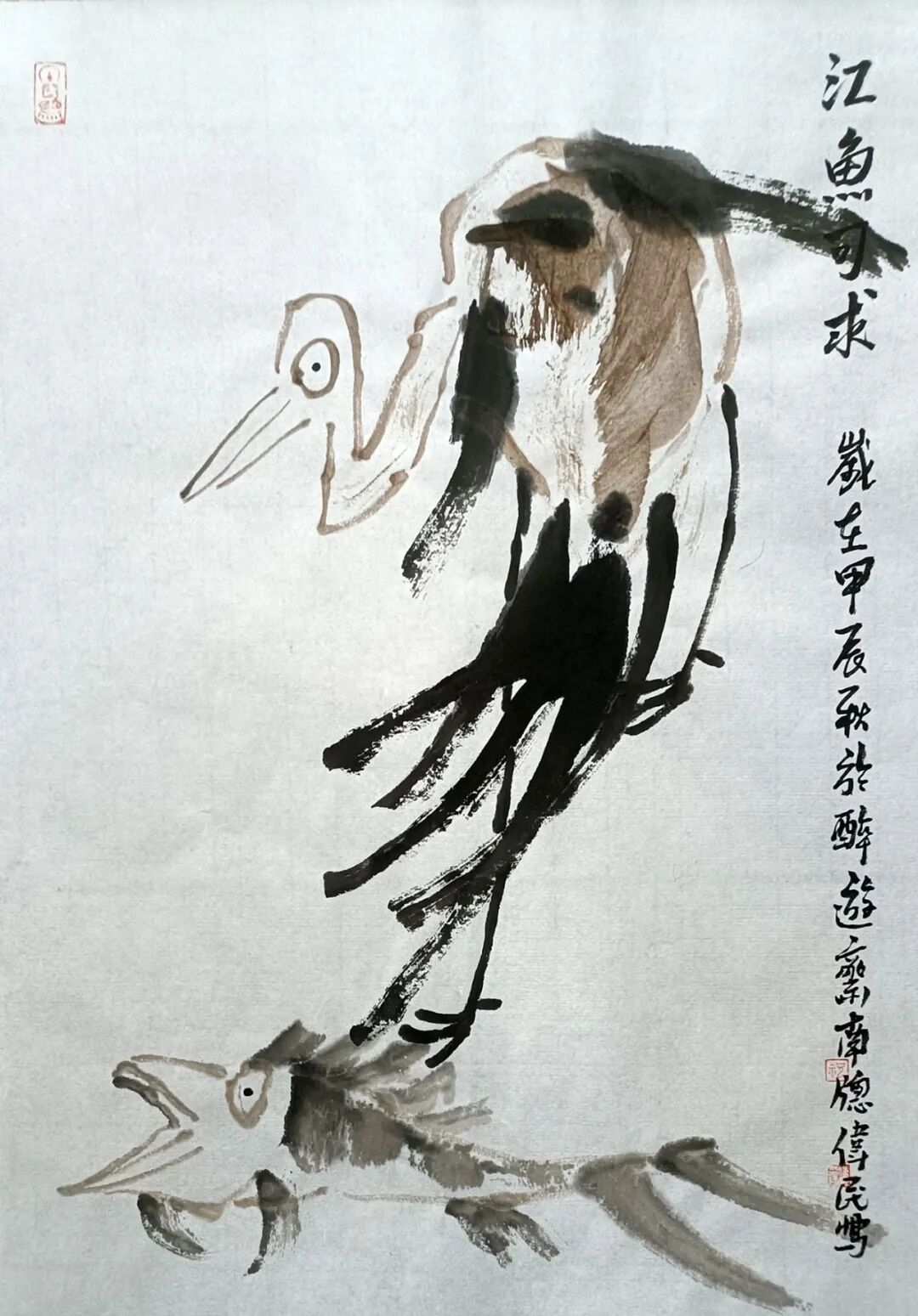九州博大丹青遥,江南鱼王功正劲。他的写意画鱼,非常擅长迅疾的勾线和快意的水墨点染,往往是即刻入境,一点神睛,率直的线条,准确的墨韵,在形简意赅的构造中,尽显写意功法的奔放自如,这是对传统的继承,也是技法创建的功成:简笔速染,不但切合了天然鱼的生态品质,也切合了文化鱼的意境品位,依快而神,在鱼的动态中,似乎拔划出水的声韵,他的笔墨以有形且有声为艺术特点,开启了审美新境界的笔墨范式,为鱼题专绘创造出更为奇绝的艺术语言,形韵齐享。工笔鱼画示其技法为正宗,写意鱼画示其功法为创新,在工笔与写意全能才华的支撑下,他得遇江南鱼王心服赞叹,恰是大师当受,受之无愧!