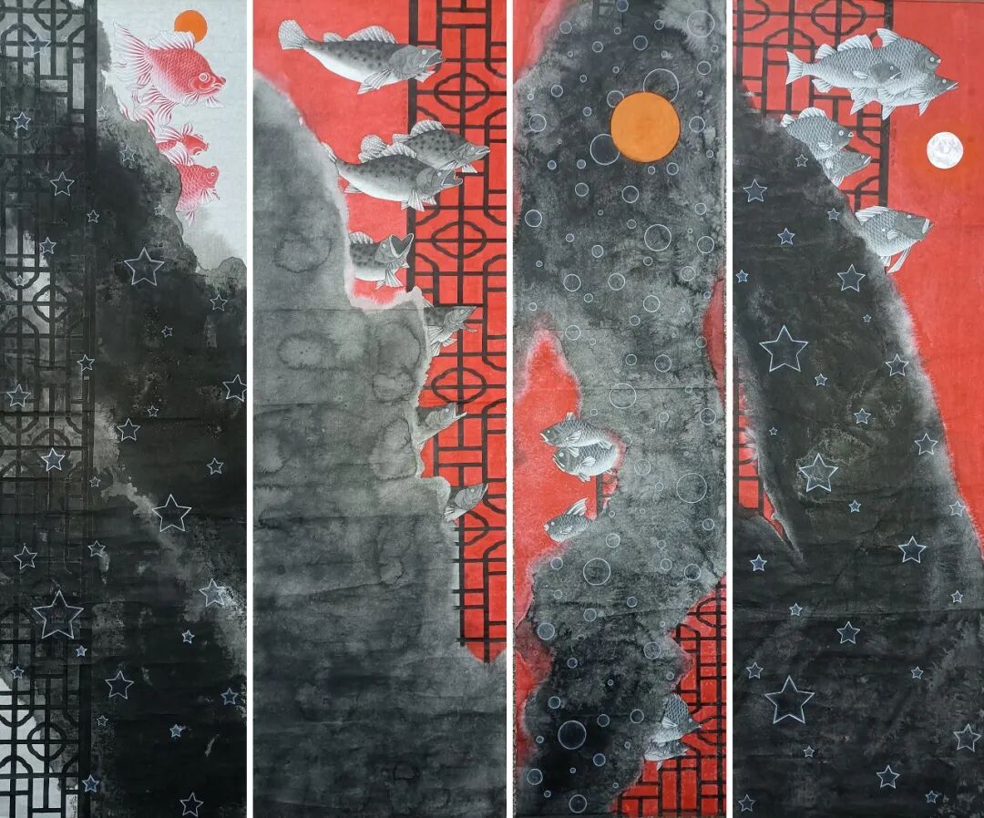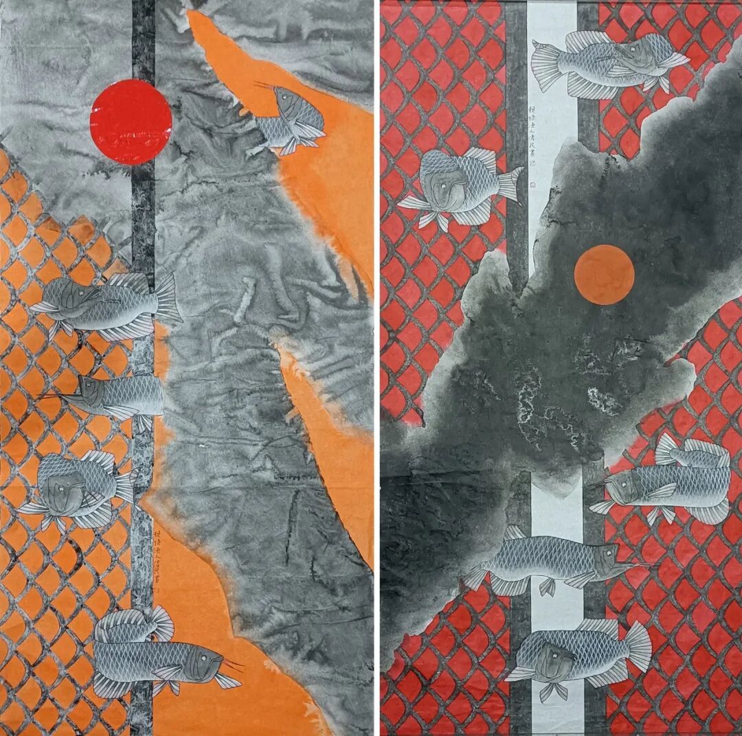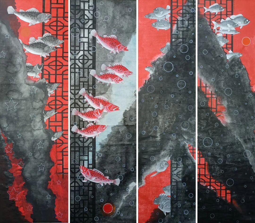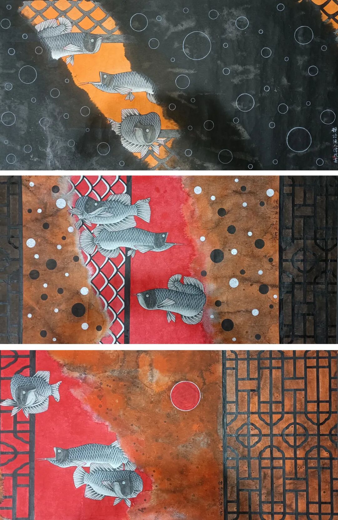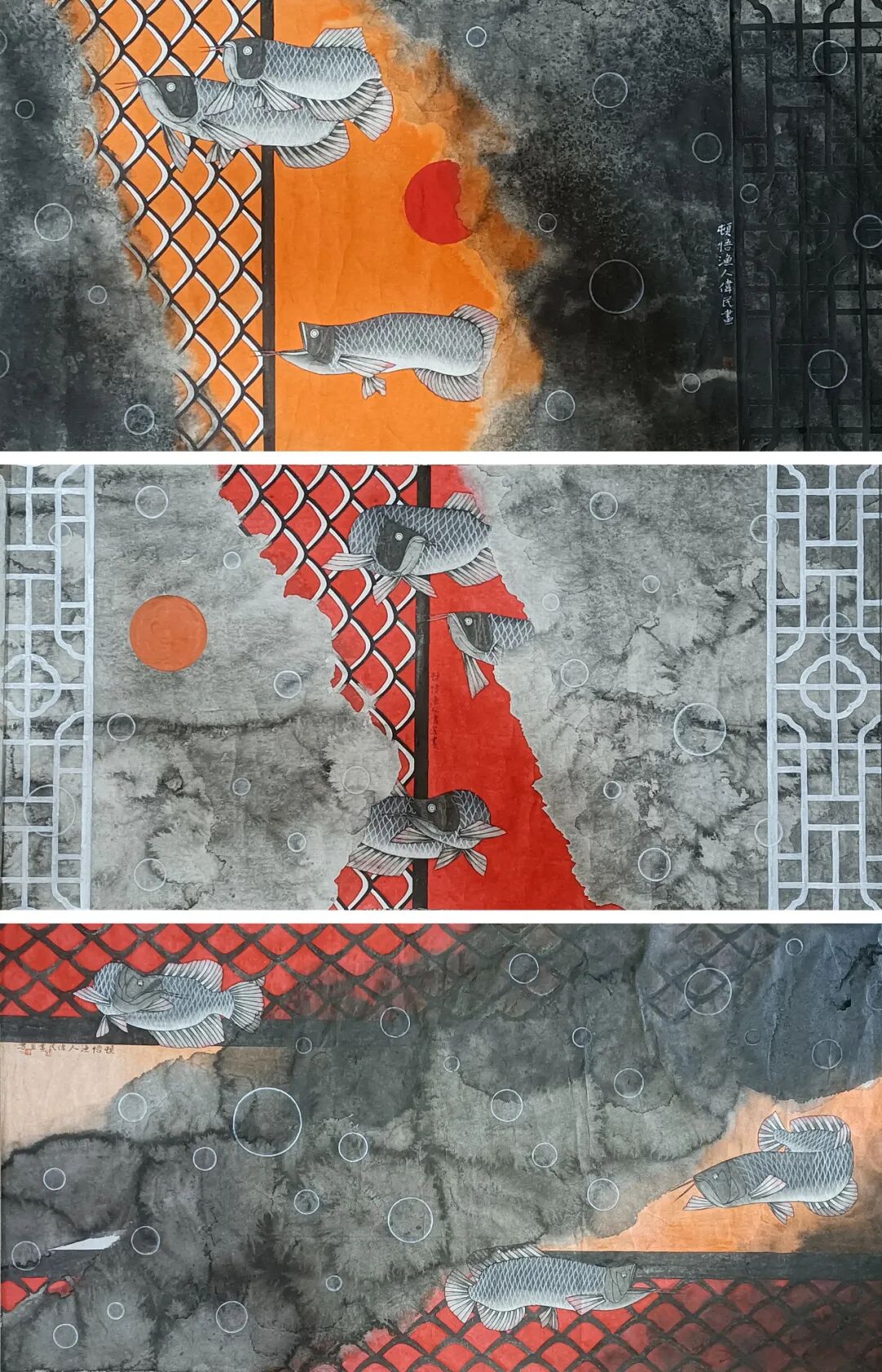 细勾金鳞游碧水,绢素妙意夺天工。鱼在中国传统文化中,是自在与超脱的象征。而祝伟民先生以游鱼入画,实则也就是绘写此间真谛!即以鱼之淡然悠游,映照人心之宁静致远。工笔写意之妙,在乎其外,澄明淡泊之心,则在乎其内!并且众幅画面,也是常以屏风式构图作为背景呈现,以此在典雅含蓄的画面中,透露出几分文人特有的清雅气质。换句话说,这种艺术境界,其实也是祝伟民先生对如今浮躁世风的一种温和抵抗。在他这里,没有功利与纷争,只有游鱼自在的和谐身影,以及那份不染尘俗的涤心画意……