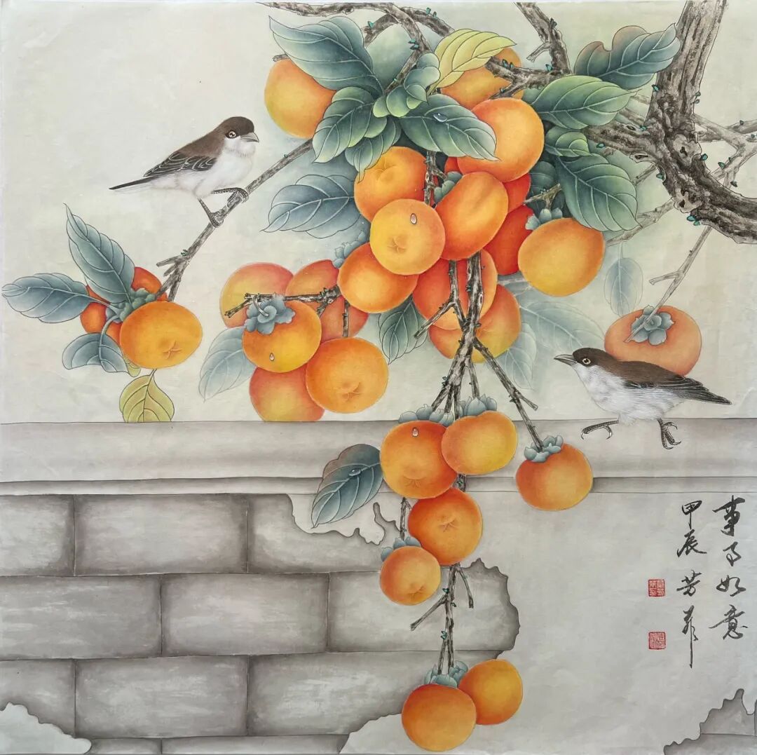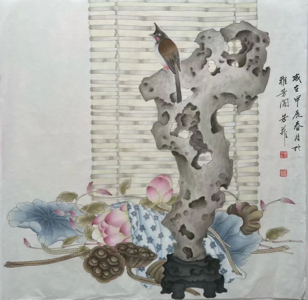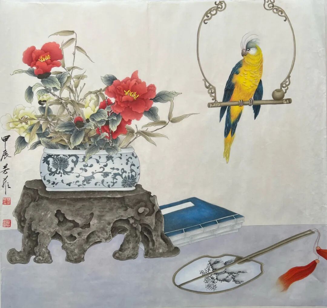 她的美术创作主张以心观物,在工笔的严谨中透出写意的洒脱。花卉的枝叶或繁或简,皆以自然生趣为本;禽鸟的姿态或静或动,尽显生命律动之韵。画面参意光影的巧妙运用,虚实相生的布局,令人在静观中感受时空的流动。这种工写交融的技法,既延续了传统花鸟画的精微气象,又以开放包容的姿态拥抱现代艺术的多元表达,成为时代美学的领路者。