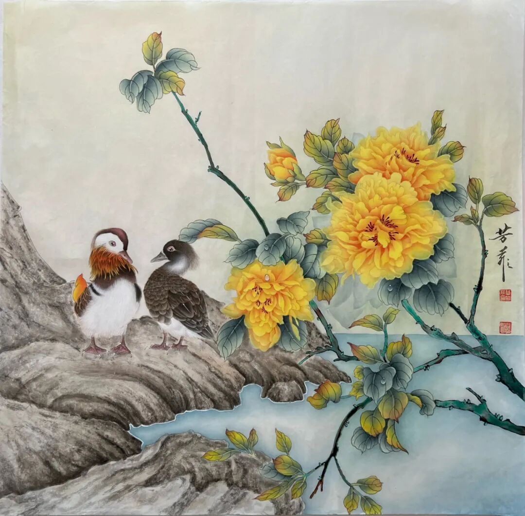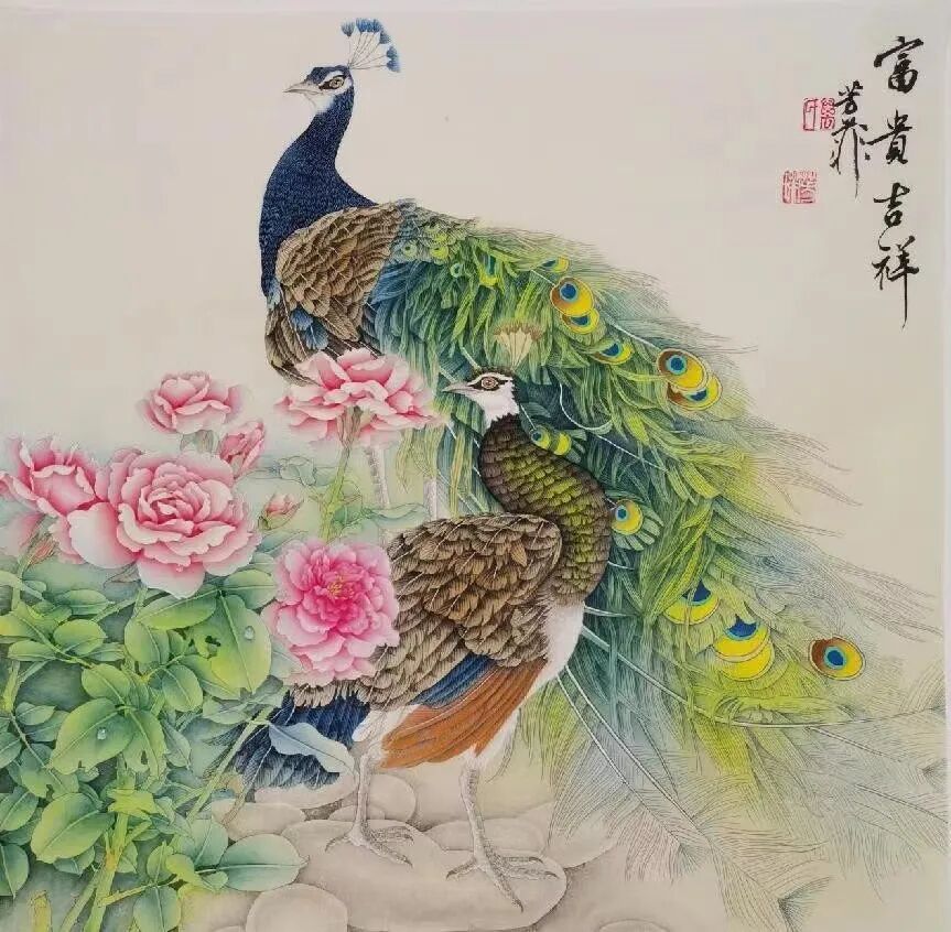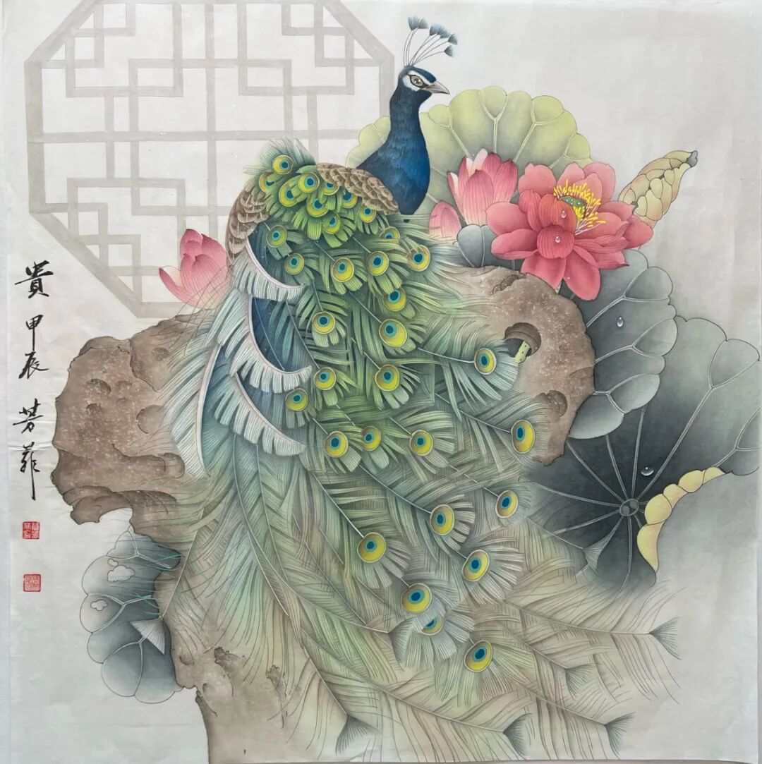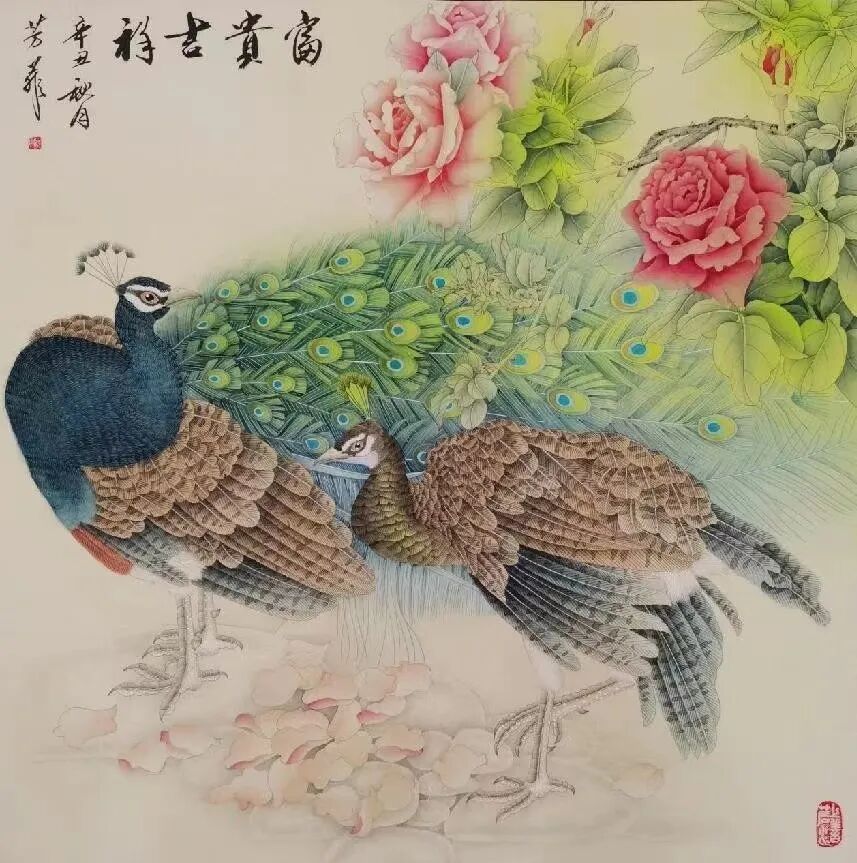 万芳菲女士的花鸟画是形神兼备的艺术典范,她的工笔技法深得宋代院体画精髓,线条细腻如丝,设色明丽而不失雅致,花卉翎羽的刻画中可见千年文脉的传承。笔墨当随时代,她并非止步于古法,更将时代气息融入笔端。画面中传统意象与现代审美相得益彰,以时代美学的格局渲染作品的灵动,对照留白勾勒意境的空灵,赋予古典题材以鲜活的现代美术生命力,笔下牡丹雍容华贵而不媚俗,孔雀翎羽华美中见沉静,极好地承袭借物寄情的东方哲思,又以大方利落的构图与色彩语言回应当代人的审美需求,深受欢迎,大得瞩目。