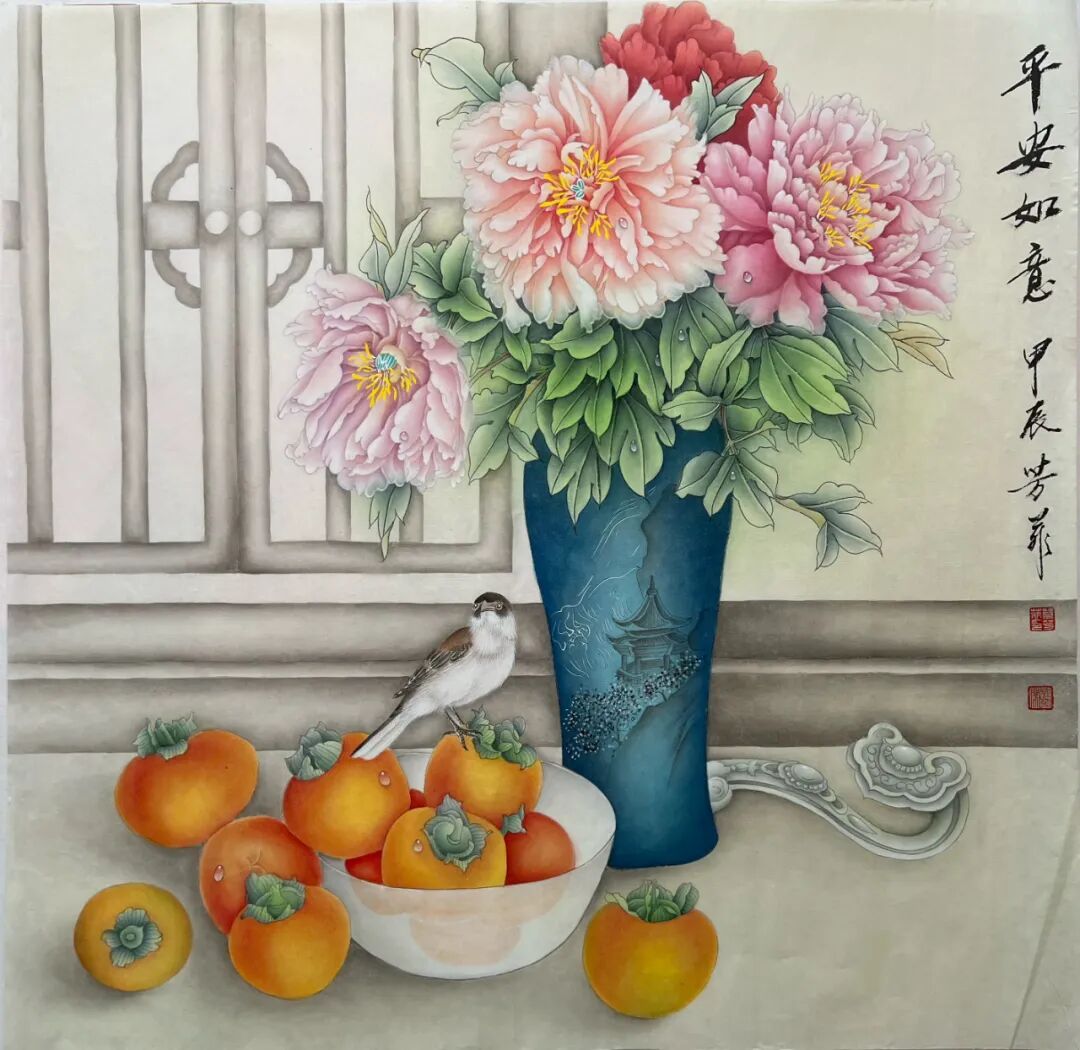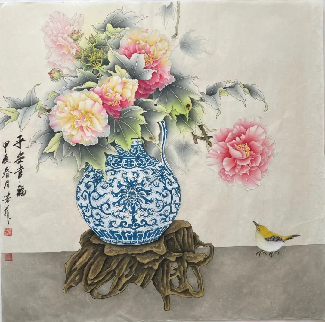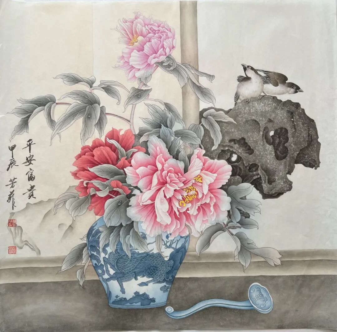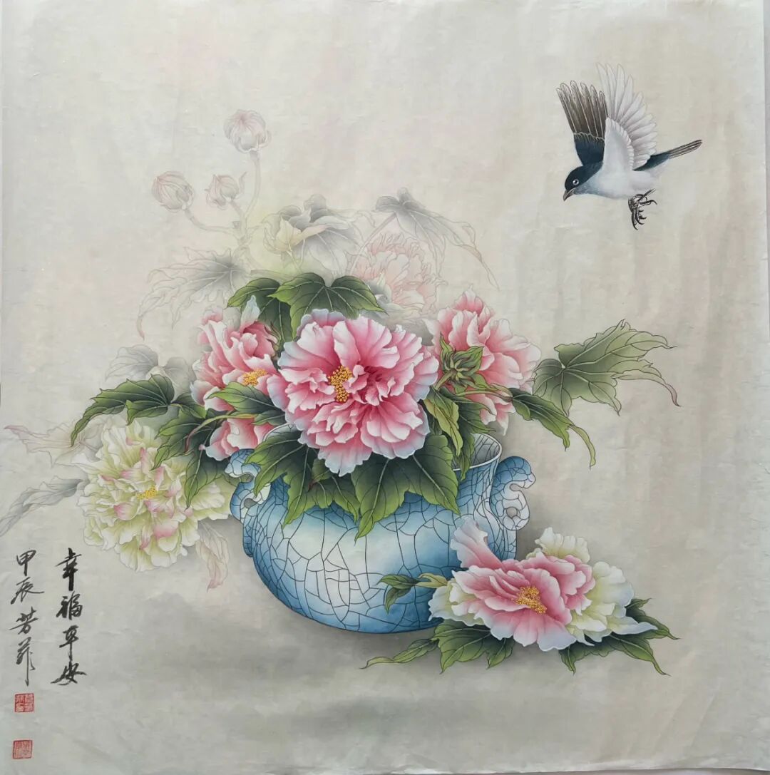 万芳菲女士的花鸟画是形神兼备的艺术典范,她的工笔技法深得宋代院体画精髓,线条细腻如丝,设色明丽而不失雅致,花卉翎羽的刻画中可见千年文脉的传承。笔墨当随时代,她并非止步于古法,更将时代气息融入笔端。画面中传统意象与现代审美相得益彰,以时代美学的格局渲染作品的灵动,对照留白勾勒意境的空灵,赋予古典题材以鲜活的现代美术生命力,笔下牡丹雍容华贵而不媚俗,孔雀翎羽华美中见沉静,极好地承袭借物寄情的东方哲思,又以大方利落的构图与色彩语言回应当代人的审美需求,深受欢迎,大得瞩目。