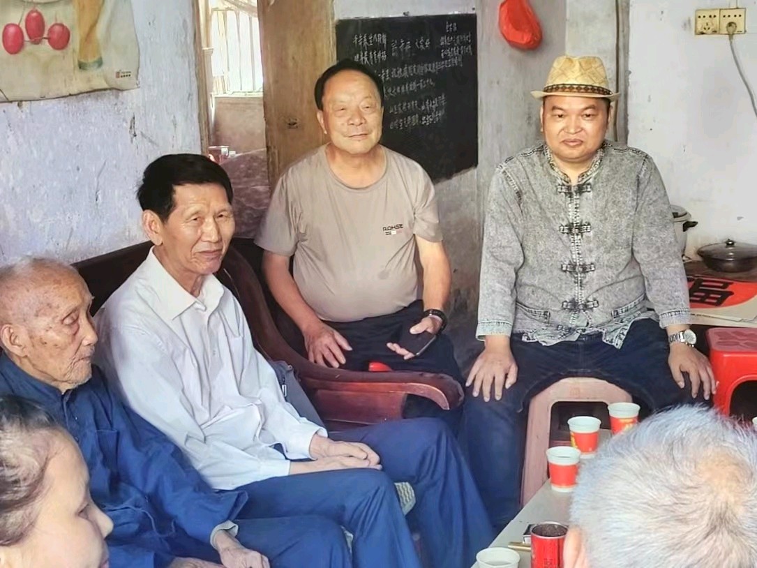 此刻梁耀琦老人在简背村老房子的客堂屋里,他与我们一一握手,指节上的老茧依然带着农耕文明的硬度,掌心却暖得像春日阳光。落坐后对着我说“你父亲是个好人啦,当年在你家吃的客家酿豆腐,我还惦记着呢!”老人的笑纹里,嵌着岁月酿的米酒香,那些年在我家里共用午餐的时光,突然变得鲜活——他总爱用青瓷杯斟自泡的米酒,喝到兴头便唱山歌,喉结在苍老的脖颈上上下滚动,像田埂间跳跃的蚱蜢。可惜我的老父亲在那年疫情期间离开了人世,享年88岁。如今要是还活着的话,让两位百岁老人对坐品茗,聊聊天也许会留下佳话。