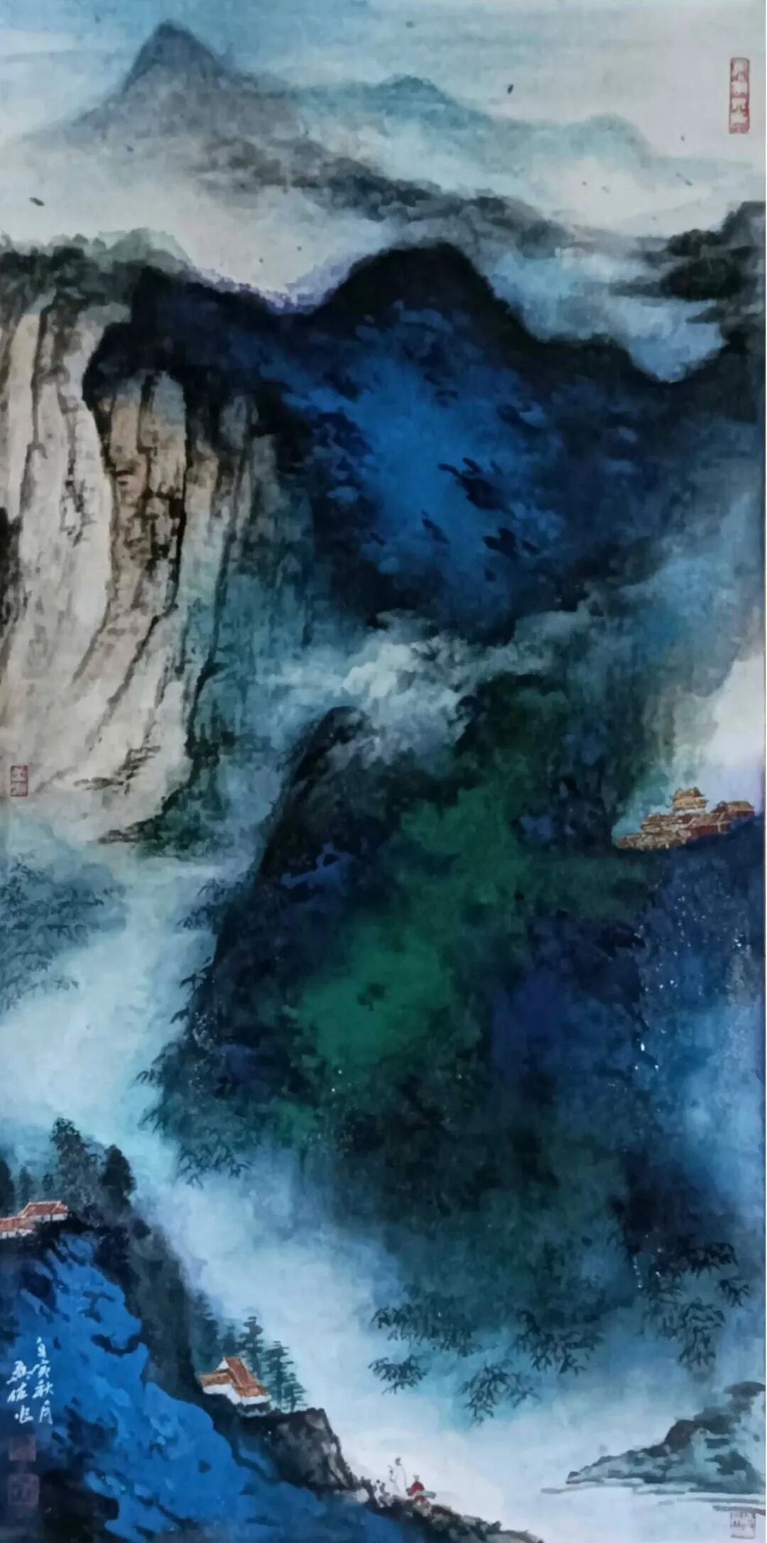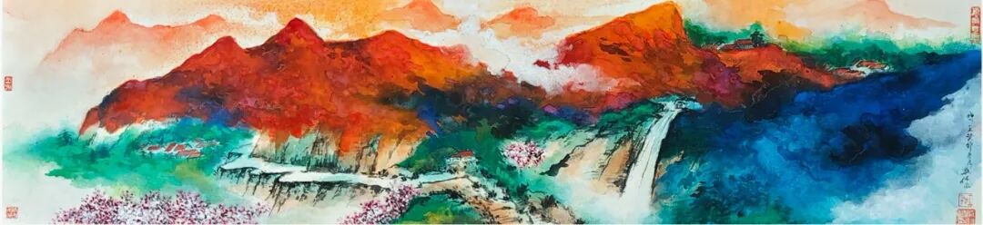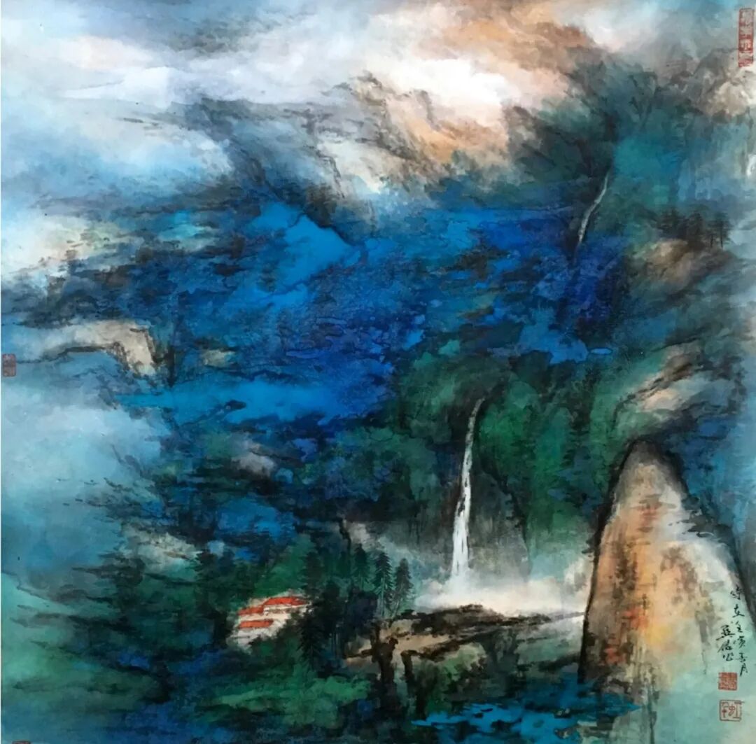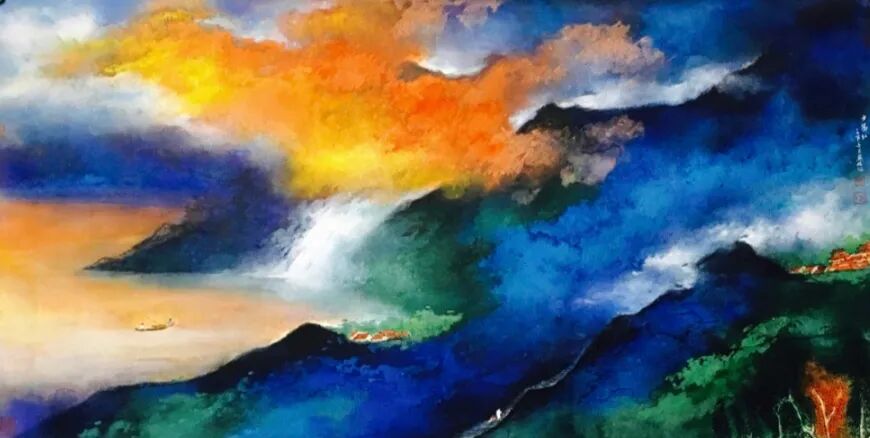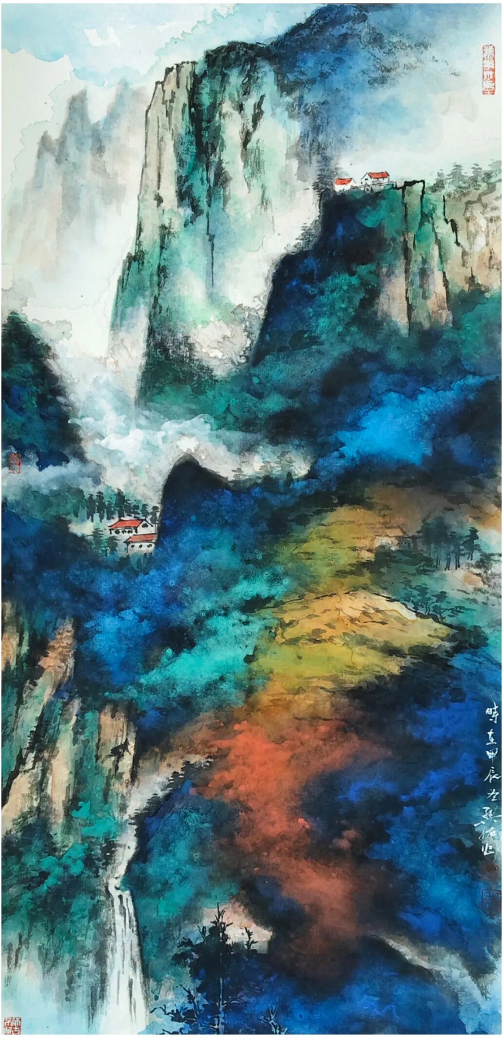 首先他依仗过去所学、所感、所想,开始着眼于中国传统笔墨。他顺着李可染上追黄宾虹、顺着齐白石取法吴昌硕,并取法乎上,探索墨分五彩的笔墨表达方式,然后,他把西方油画的色彩、日本唯美主义的用色方法,以及中国画的墨分五彩统统笼于笔下,进行情景合一的酝酿。与此同时,他在不自觉之间把中国画的具象与意象,把西方油画的写实与抽象结合起来,让具象、意象、写实、抽象在微妙的色彩中各得其真,各得其所,从而使他的泼彩世界晓烟交碧,晨光欲动,骄阳初蒸,崇山如翠。画面之中,具象、意象、写实、抽象,乍合乍离,或聚或散,物态欣愉,神妙如动,既有着中国传统文化与中国山水审美的品位,又有着西方表现主义的浪漫情怀、印象主义的丰富和谐;既带着浓郁的传统文化熏染出来的意境、空间与趣味,又有着向现代审美形态发展的前瞻性。呈现出雄阔、壮美、浑厚、博大、精深的艺术境界,彰显着胸次、学养、才情、功力各臻其妙的艺术状态。