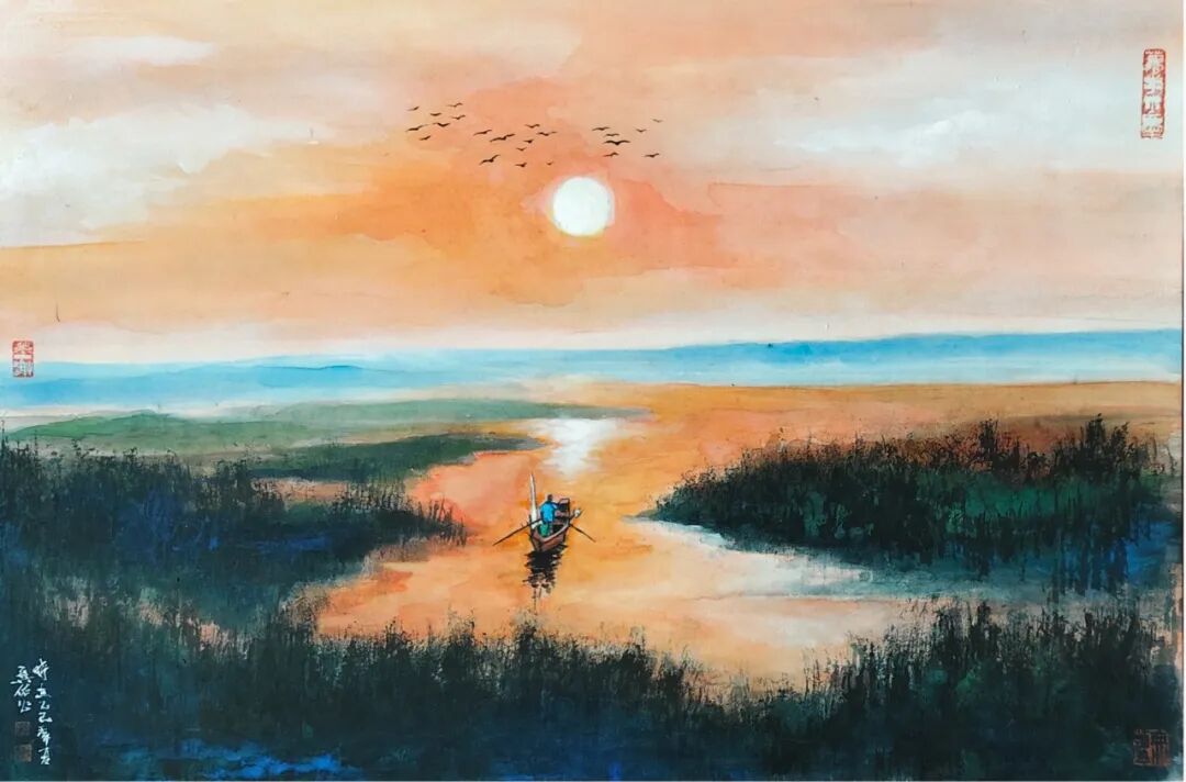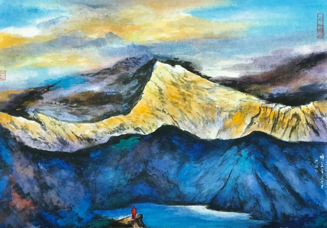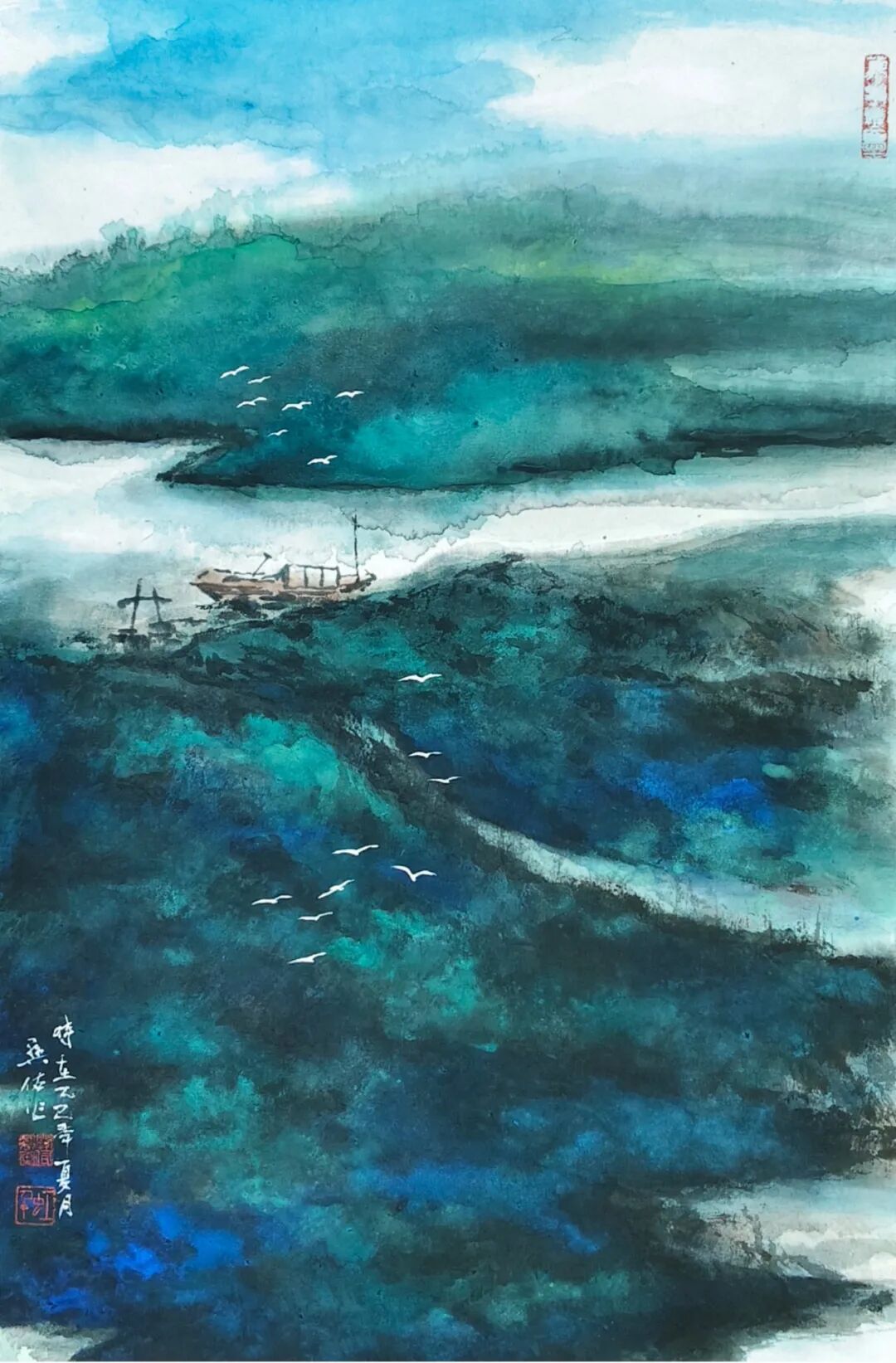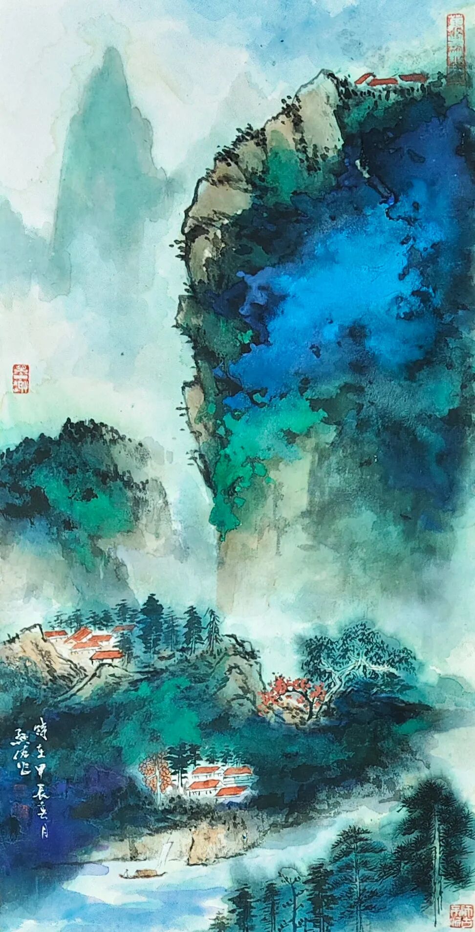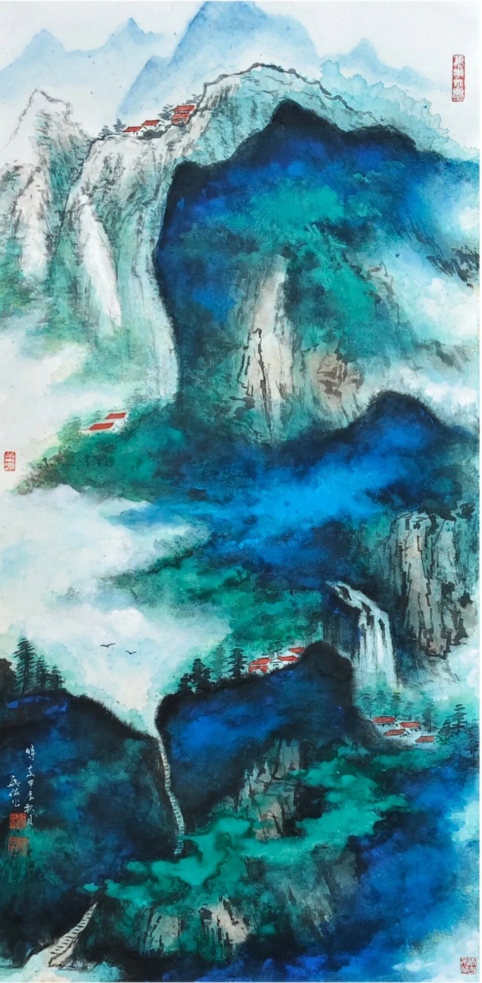 首先他依仗过去所学、所感、所想,开始着眼于中国传统笔墨。他顺着李可染上追黄宾虹、顺着齐白石取法吴昌硕,并取法乎上,探索墨分五彩的笔墨表达方式,然后,他把西方油画的色彩、日本唯美主义的用色方法,以及中国画的墨分五彩统统笼于笔下,进行情景合一的酝酿。与此同时,他在不自觉之间把中国画的具象与意象,把西方油画的写实与抽象结合起来,让具象、意象、写实、抽象在微妙的色彩中各得其真,各得其所,从而使他的泼彩世界晓烟交碧,晨光欲动,骄阳初蒸,崇山如翠。画面之中,具象、意象、写实、抽象,乍合乍离,或聚或散,物态欣愉,神妙如动,既有着中国传统文化与中国山水审美的品位,又有着西方表现主义的浪漫情怀、印象主义的丰富和谐;既带着浓郁的传统文化熏染出来的意境、空间与趣味,又有着向现代审美形态发展的前瞻性。呈现出雄阔、壮美、浑厚、博大、精深的艺术境界,彰显着胸次、学养、才情、功力各臻其妙的艺术状态。