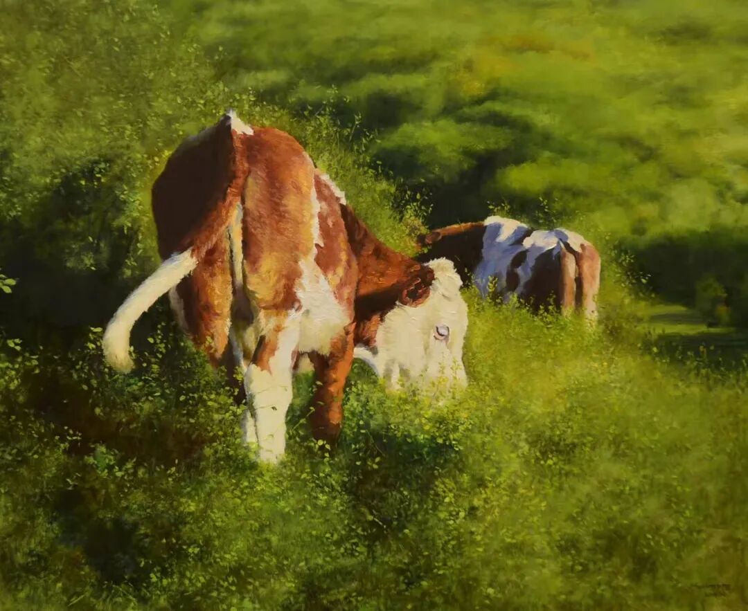 胡苍鹰画画有一个特点,就是不会取巧,前几年看他的画就有这个感觉,构图和造型都很实在,笨笨的牛、羊•••••,完全是生活中的样子,树木、河流、渔船等场景也不修饰,但画得严严实实,好像是人来到现场。是看得到,摸得到的东西。就艺术而言,真正的真实是不存在的,即使是如实的刻画,也是以真实的个人体验为基础,在真实与体验之间的孰重孰轻往往决定真实的变形程度,或主观与客观的比例程度,传统绘画是理性与感性的完美结合。胡苍鹰的风景画作品正是他本人价值取向的选择。他画的题材,分明是让人不注意的房屋、角落、野草、旧渔船、海鸟等。
