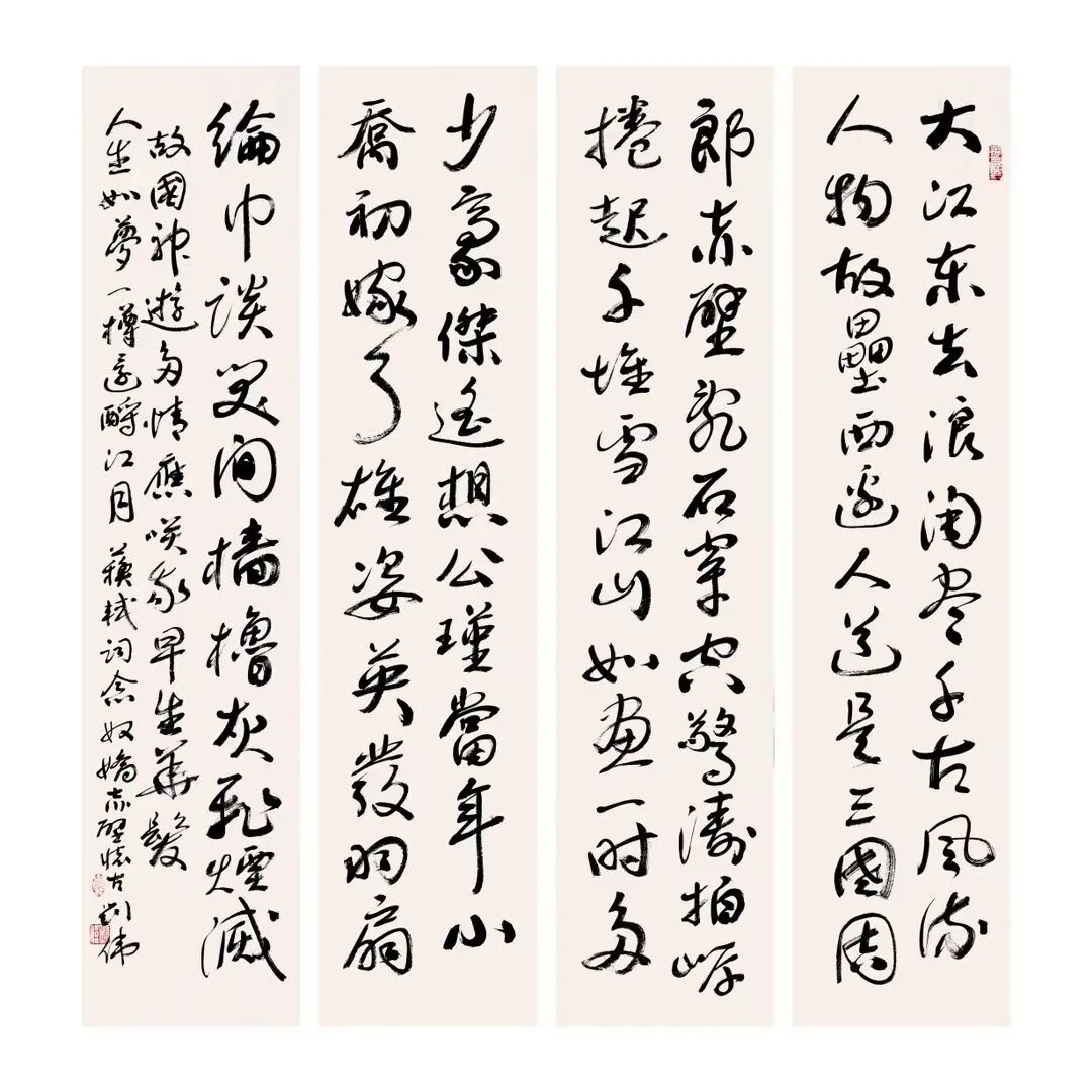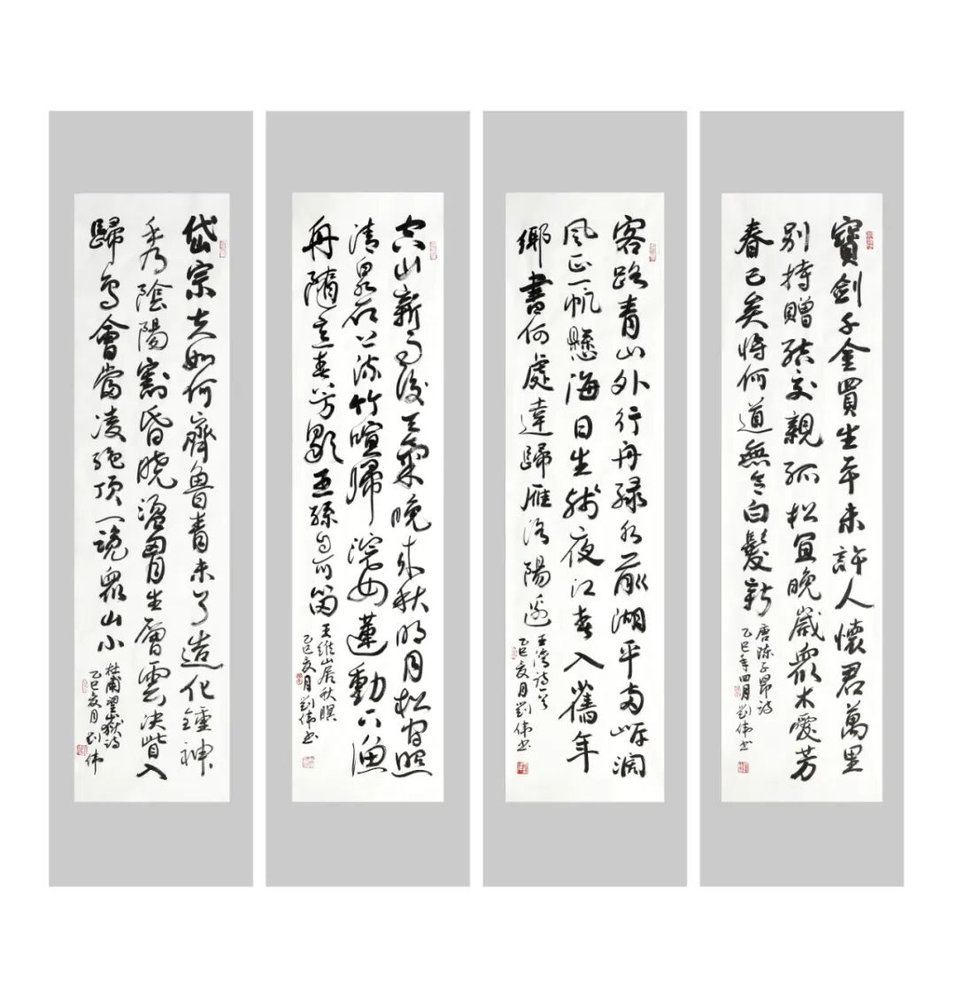 昔关中大贤于右任者,髯翁也。髯翁挥毫,引碑入草。朝临石门铭,暮写二十品,熔北碑雄峻于南帖风流,创“标准草书”以济天下。其道尊“易识、易写、准确、美丽”四纲,以魏碑筋骨注草书血脉,遂开三百年新境,世人誉曰“当代草圣”。碑学自清季中兴,至此方得飞腾之势,如白虹贯日,光照翰苑。然薪火相传,岂乏嗣响?陈州刘伟先生,七二高龄而墨魂愈炽,执于氏法乳五十春秋,今观其草书四屏,方知薪尽火传之妙!