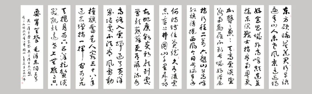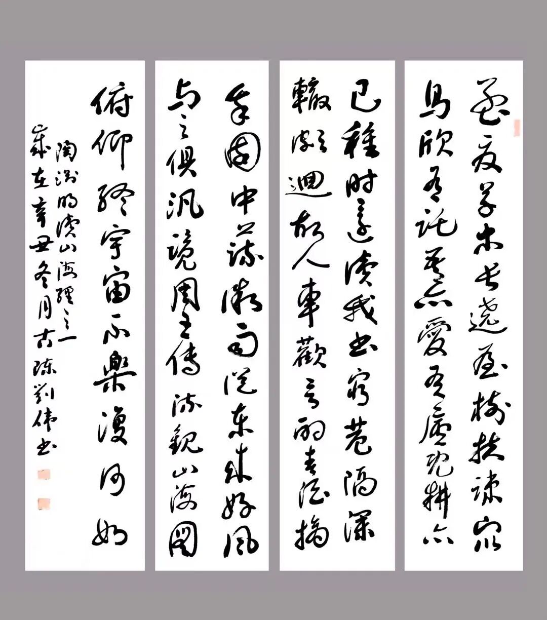 先生作书,深得髯翁笔力雄强、无拘无束之三昧。四条屏展卷,但见陈子昂“宝剑千金买”句如戈戟森列,撇捺似剑锋劈空;王湾“客路青山外”行舟之态,以渴笔飞白作江涛起伏;王维“空山新雨后”用墨浑穆,若夜色沁纸;杜甫“岱宗夫如何”则中锋直下,具泰山压轴之势。四屏血脉贯通,行气如飞瀑泻玉,虽分而合,虽断犹连,此非深谙于体“标准草书”之连绵使转者不能为!