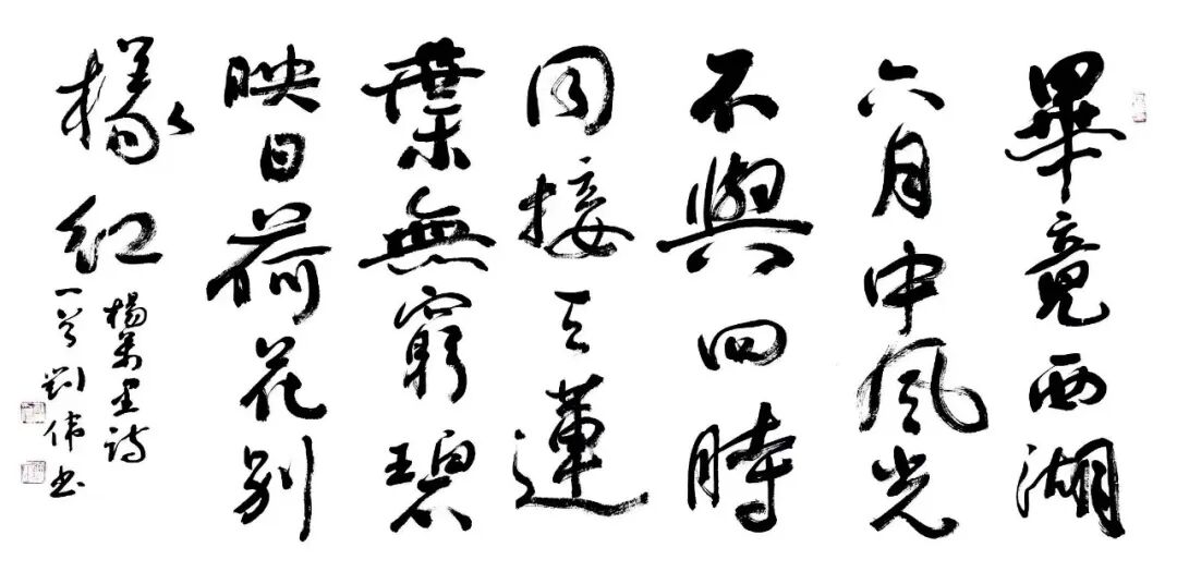 然先生岂囿于形骸哉?其老辣厚重处,正见生命淬炼之功。昔髯翁书道:“笔涌江山气,文张雅颂音”,今观刘公运笔:渴墨似虬枝盘空,涨墨如云山叠嶂,枯润之间隐现金石铿锵。尤可贵者,更融汉隶之朴茂、章草之古拙于狂草奔放之中。王维“莲动下渔舟”之“莲”字,忽显曳舟之态,顿生顿挫之趣;杜甫“岱宗夫如何”之“岱”字,取汉隶方劲,如断崖勒马。此等碑帖交融手法,非但承于氏遗风,更见汲古开新之魄力。