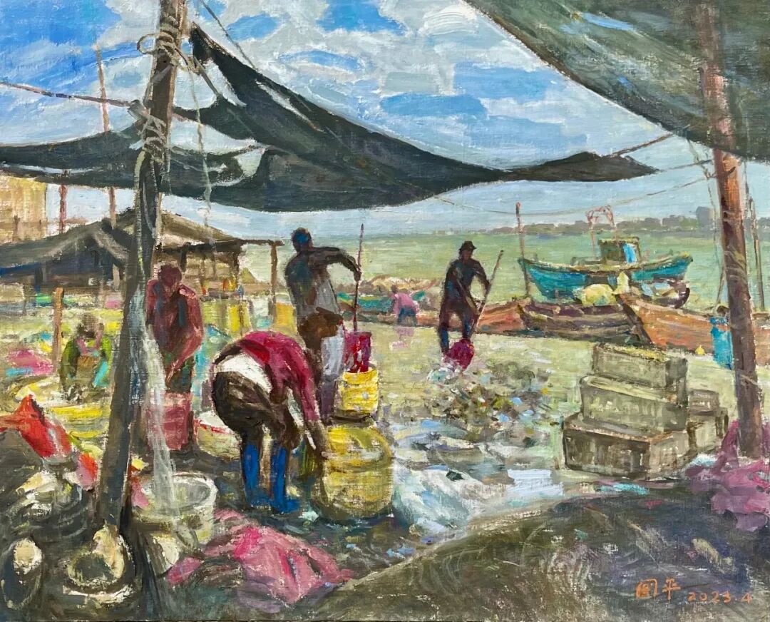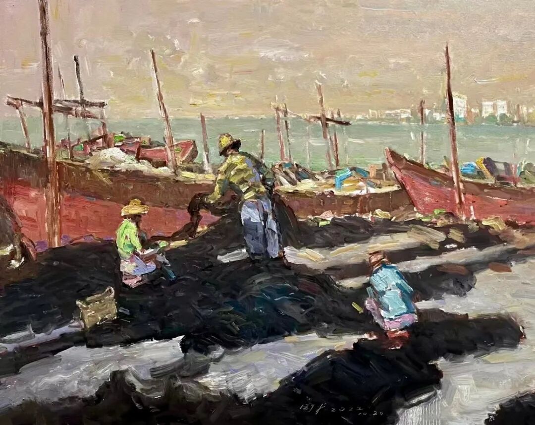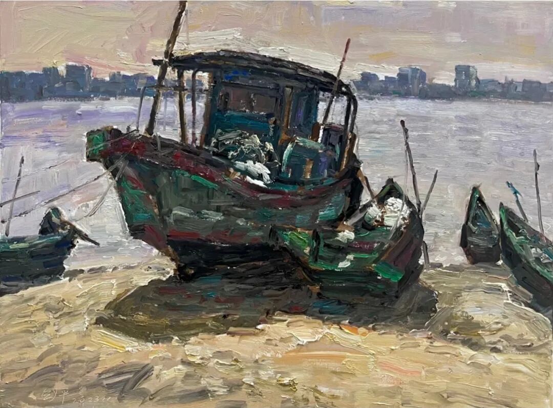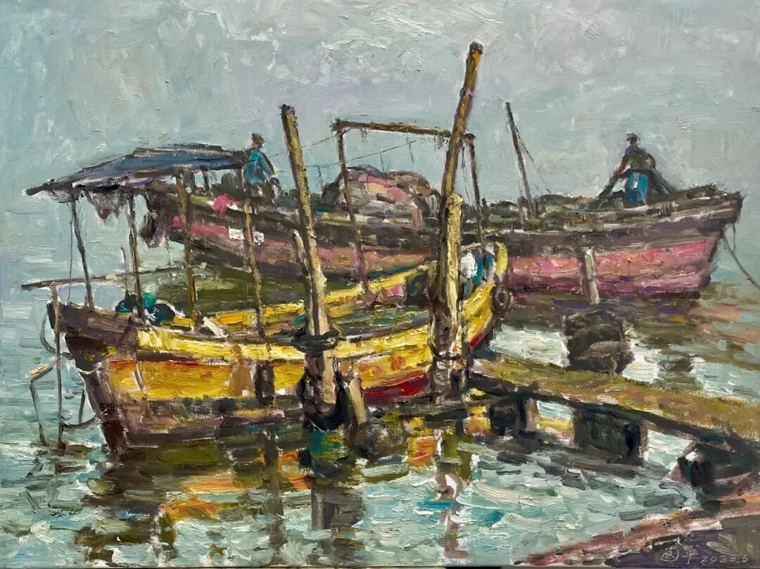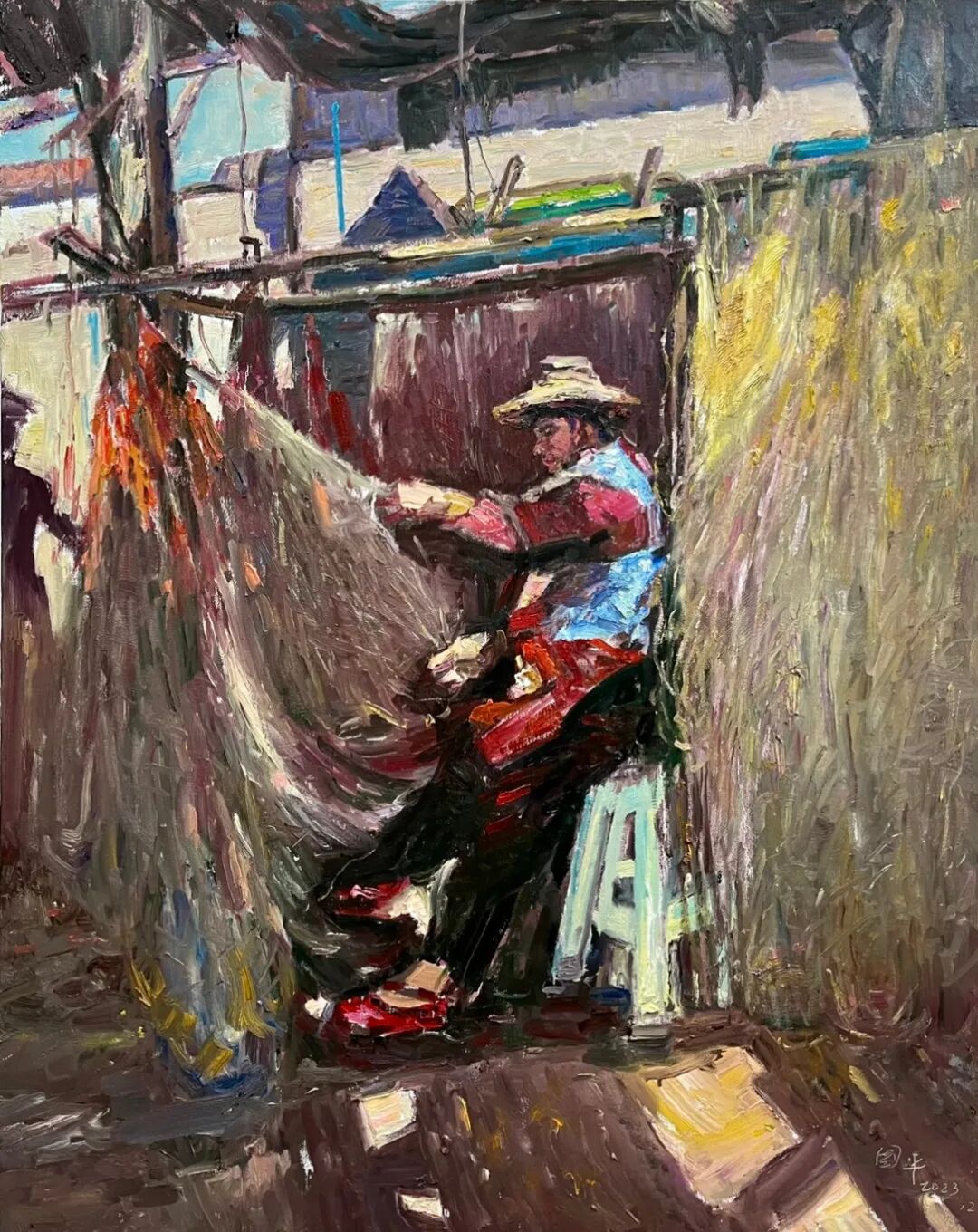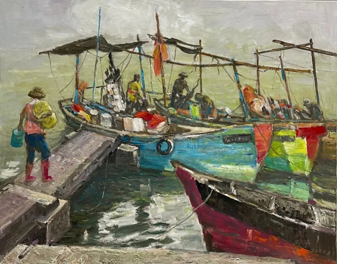 符国平的作品题材广泛,涉及人物、静物、市井风情、渔船码头等各类风景多个方面。他以敏锐的观察力和深厚的生活底蕴,将这些题材生动地展现在画布上。在他的市井风情画中,我们仿佛置身于街头巷尾的生活场景中,感受到浓浓的人间烟火气。那些平凡的人物、普通的生活场景,在他的笔下却变得鲜活而生动。这种广泛的题材选择,充分展示了符国平的绘画技巧和艺术才华,也体现了他对生活的热爱和对社会的关注。符国平的油画作品具有写意和抒情性,同时又具有现代风格的特点和创新精神。他在传统的油画技法基础上,不断尝试新的表现手法,使作品更具时代感和创新性。这些创新之举,使他的作品在传统与现代之间找到了完美的平衡,既传承了油画艺术的精髓,又展现了时代的风貌。
