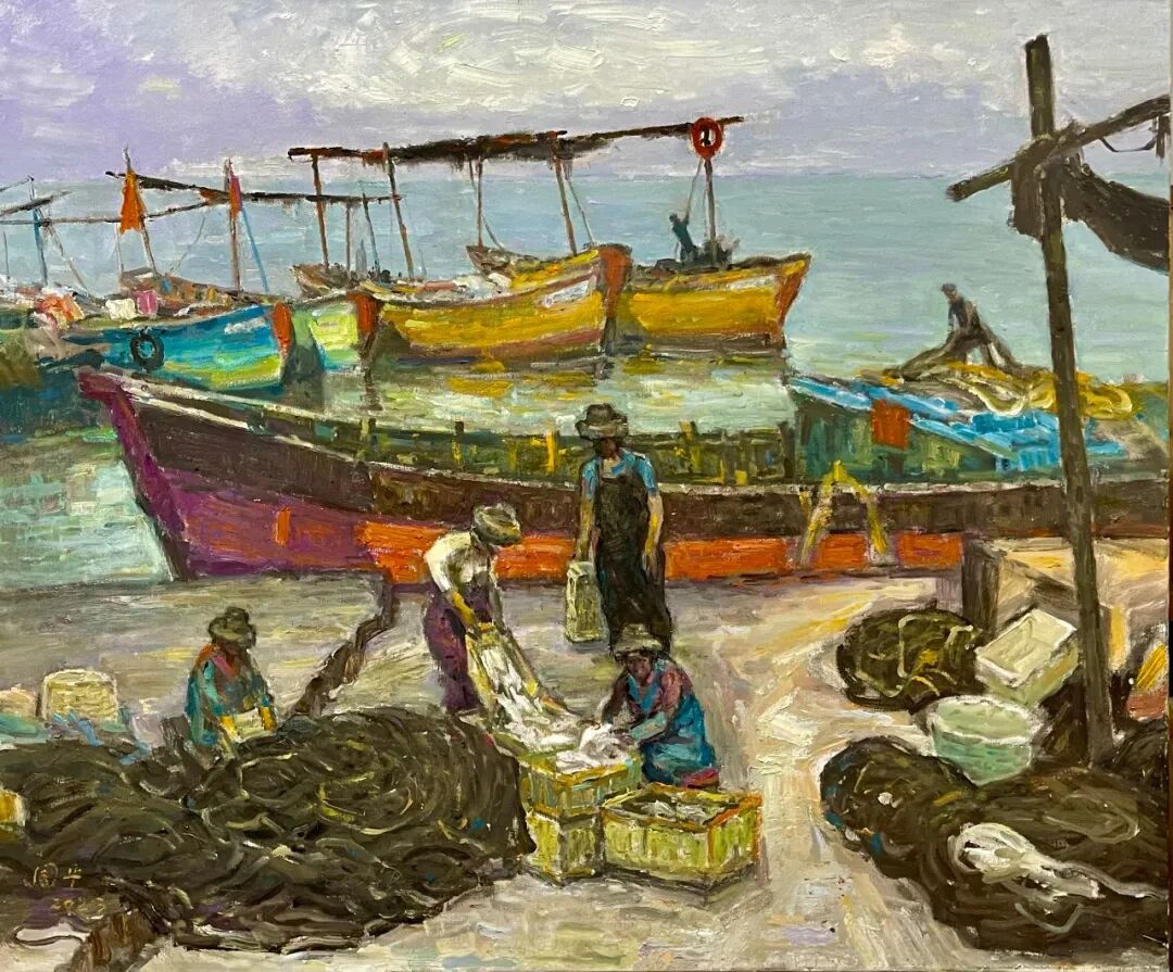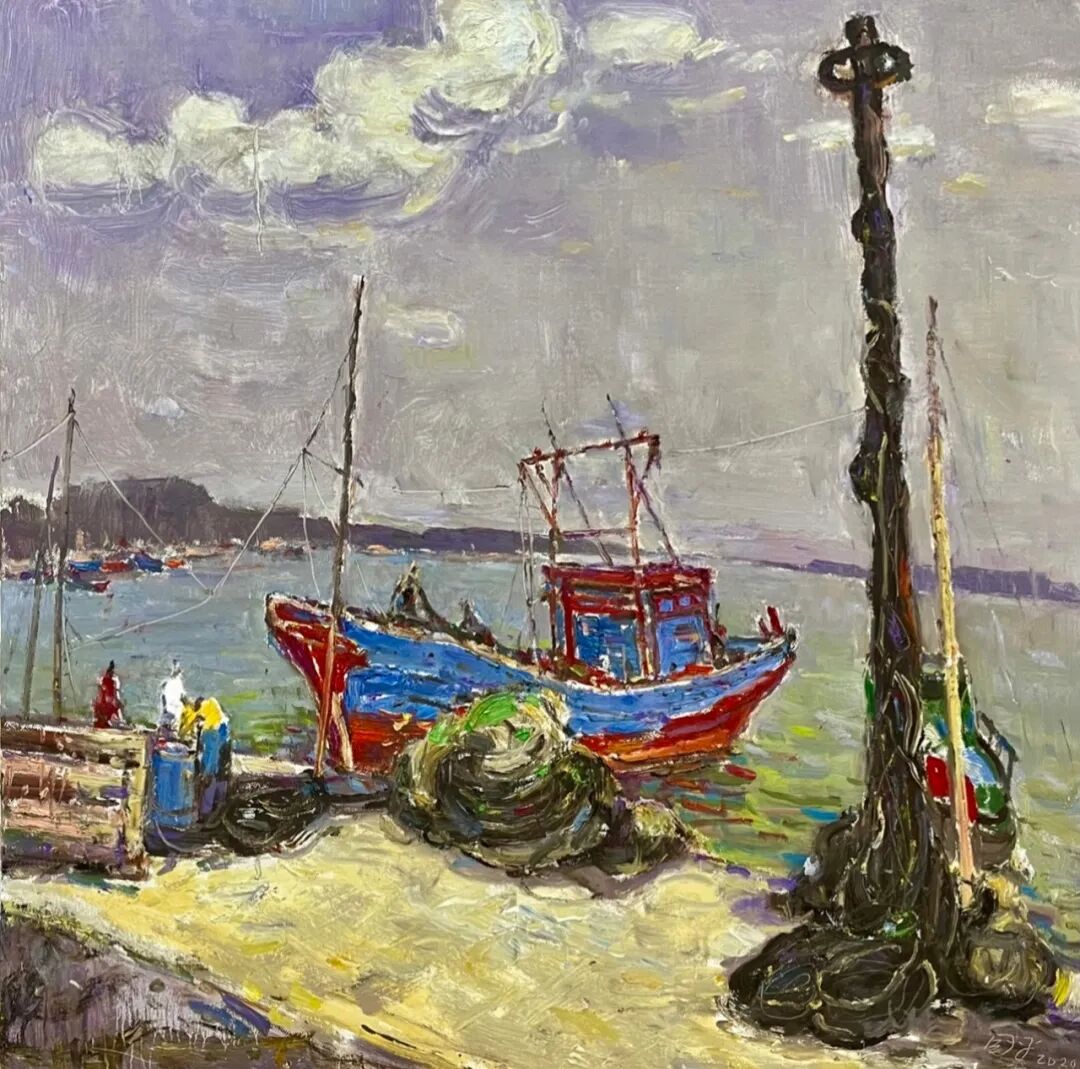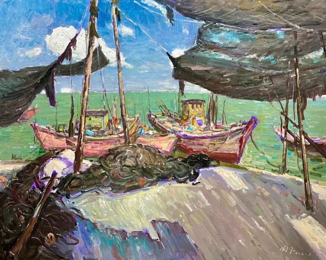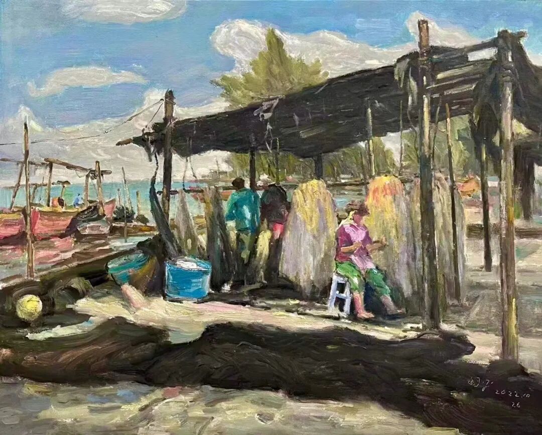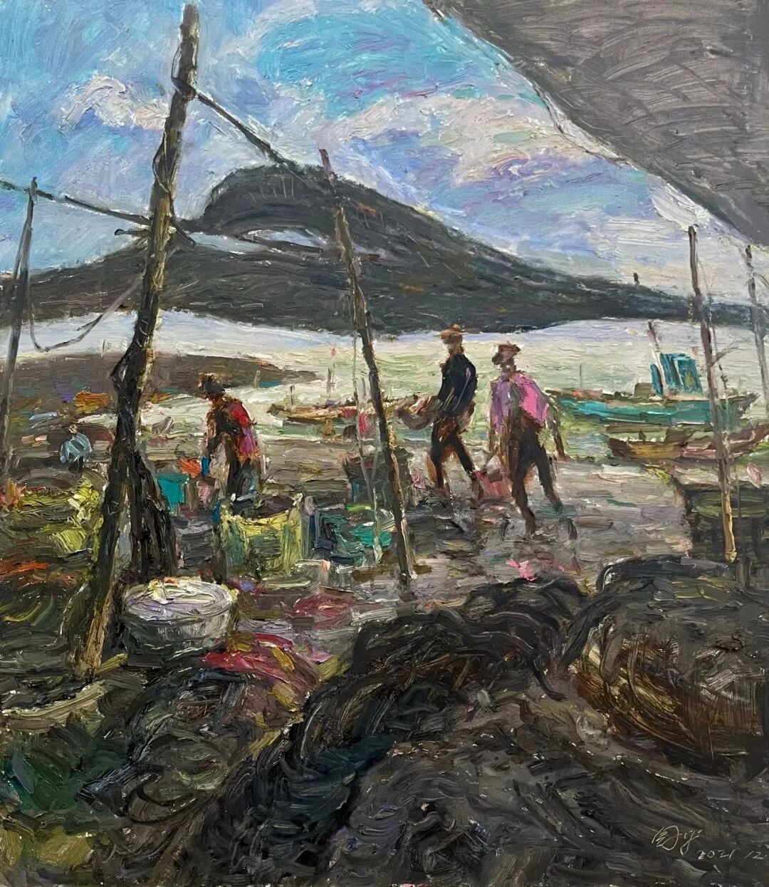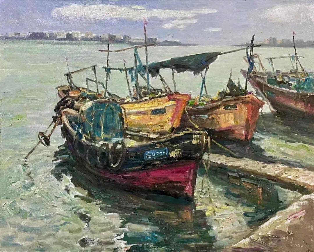 符国平的作品题材广泛,涉及人物、静物、市井风情、渔船码头等各类风景多个方面。他以敏锐的观察力和深厚的生活底蕴,将这些题材生动地展现在画布上。在他的市井风情画中,我们仿佛置身于街头巷尾的生活场景中,感受到浓浓的人间烟火气。那些平凡的人物、普通的生活场景,在他的笔下却变得鲜活而生动。这种广泛的题材选择,充分展示了符国平的绘画技巧和艺术才华,也体现了他对生活的热爱和对社会的关注。符国平的油画作品具有写意和抒情性,同时又具有现代风格的特点和创新精神。他在传统的油画技法基础上,不断尝试新的表现手法,使作品更具时代感和创新性。这些创新之举,使他的作品在传统与现代之间找到了完美的平衡,既传承了油画艺术的精髓,又展现了时代的风貌。