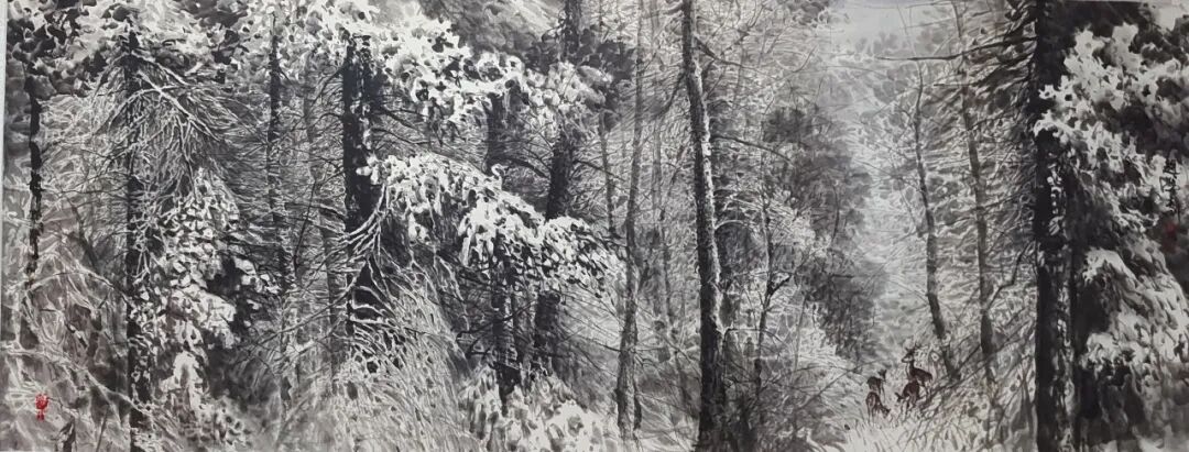 为充分表现北疆气象万千之雄浑与灵秀,赵吉刚先生在讲究笔墨传统根基之上,力行大胆尝试。他不拘一格,打破程式,将水法、墨韵、肌理制作乃至西画光影理念融汇贯通。这种兼收并蓄的创新,既拓展了冰雪画的表现维度,也形成了其独树一帜、极具辨识度的“白桦林”艺术语系。其创新,源于对传统精神的深刻理解,更源于对自然万象的深情体悟与胸襟涵纳。
