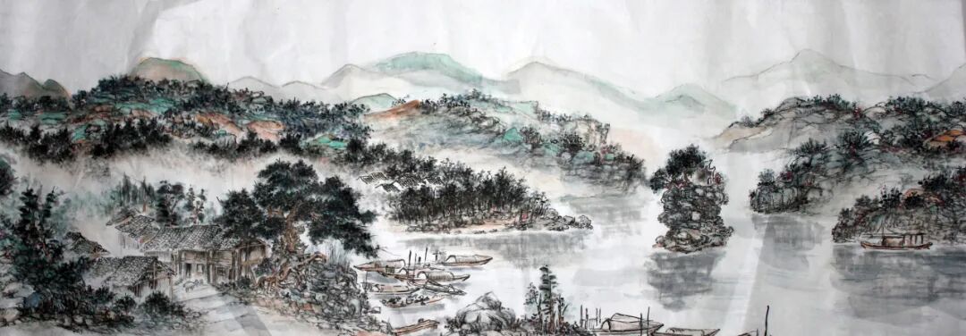 陈伍祥先生在《锦绣潇湘》中重铸青绿山水的灵魂基因,当十六米绢本在眼前徐徐展开,青绿交织的山水空间瞬间将观者纳入怀抱。先生以北宋"三远法"为基,重构时空维度:近景坡石嶙峋,松柏积墨成荫,营造出可驻足休憩的物理场域;中景层峦以石青石绿叠染,云气穿行山腰,形成可极目骋怀的视觉纵深;远景帆影隐现淡霭,引人神思远游。这种空间设计使观者既能"步步可观"苔点蕨草、双钩夹叶等精微细节,又能沉浸于山水环抱的整体意境。蜿蜒潇水如碧绦串联田畴村落,民居依山就势而筑。实现郭熙"可行可望可游可居"的美学理想。