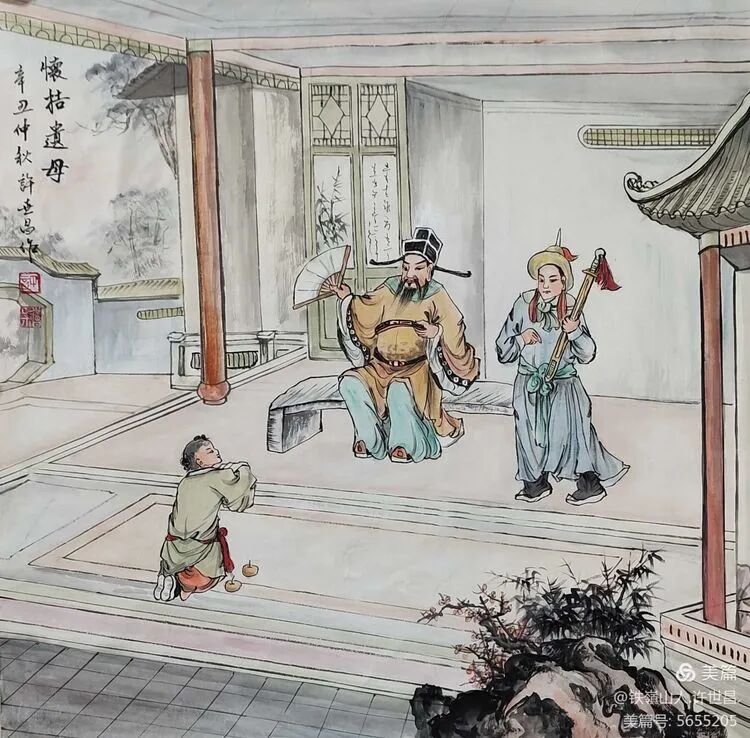陆绩,三国吳国人,六岁时,随父拜见袁术,袁术拿桔子招待他父子,陆绩多拿两个桔子藏于怀里,又掉下来,被袁术发现,袁术问道,为何要这样做?陆绩回答:我母親喜欢吃桔子,我想拿多两个孝敬我母親行吗?袁术念其是个孝子,也就不再追究了。后来陆绩也做了大官。