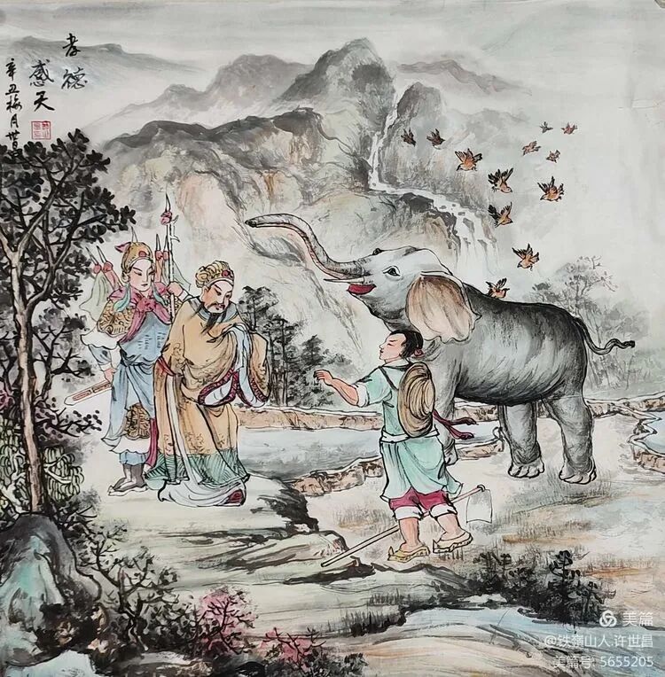 相传远古时代的舜帝,生母早丧,继母和同父异母的弟弟千方百计想加害他,都被他化解了,还不记恨继母和弟弟,并孝顺义母和爱护弟弟,一个人种了好多田地。他的孝德和勤耕感动天帝,派大象为他耕田,好多小鸟帮他除草。尧帝知悉后,经过观察,认为舜确有治理国家的能力,既把两个女儿嫁给舜,又把帝位传给舜。舜登帝位后,把国家治理得井井有条,成为文景之君,对父母孝顺,又封弟为侯,孝德为干古所传颂。