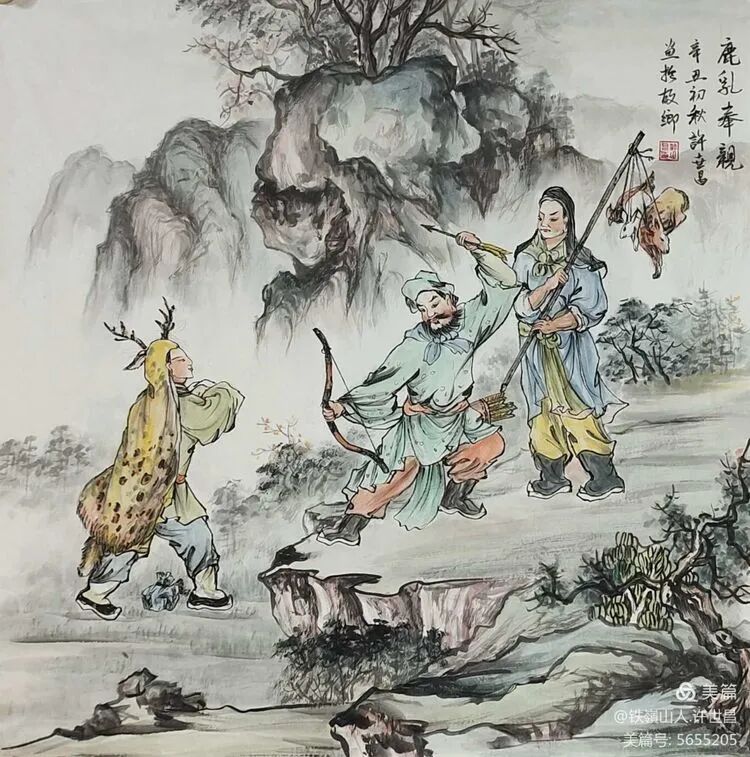 春秋时郯子,双親年老多病,需吃鹿乳,方能养好身体。故经常身披鹿衣,扮成鹿的模样,进山混进鹿群中挤取鹿乳。一次碰上猎人,已为母鹿,郯子大声呼叫,道明缘由,猎人受他孝心所感动,送他鹿乳带回家中奉养双親。