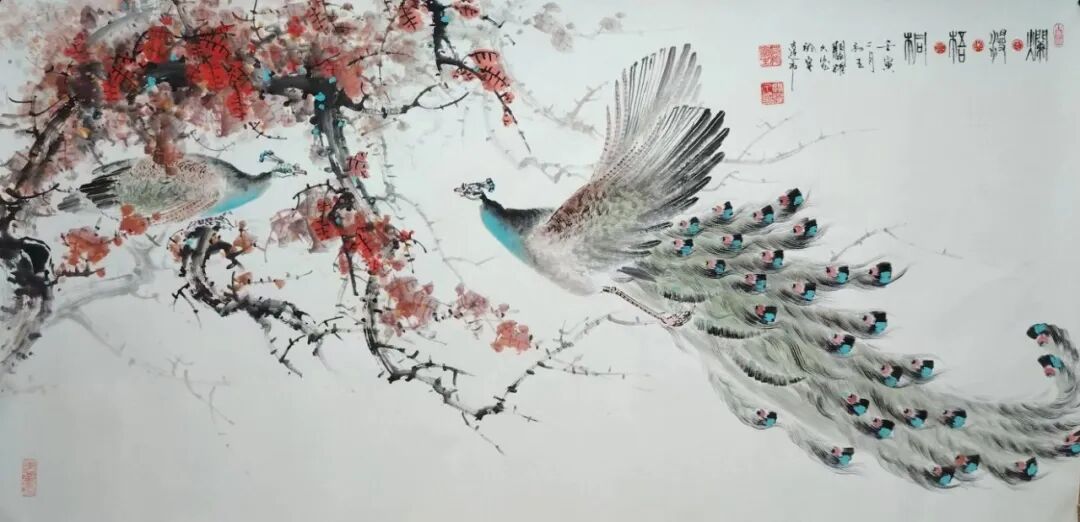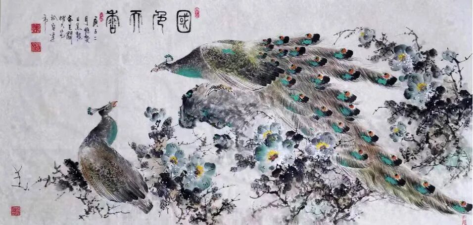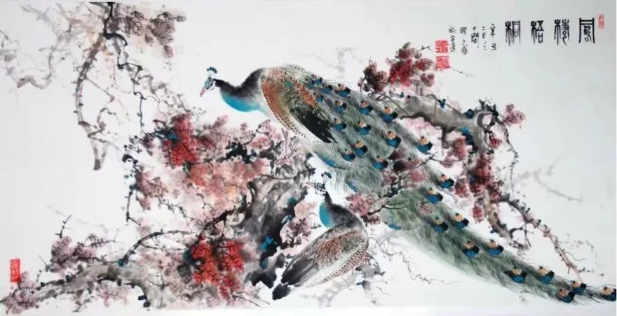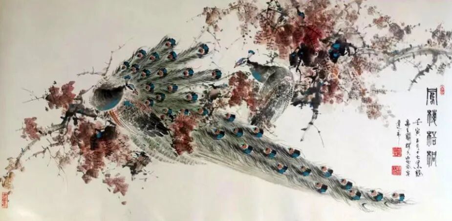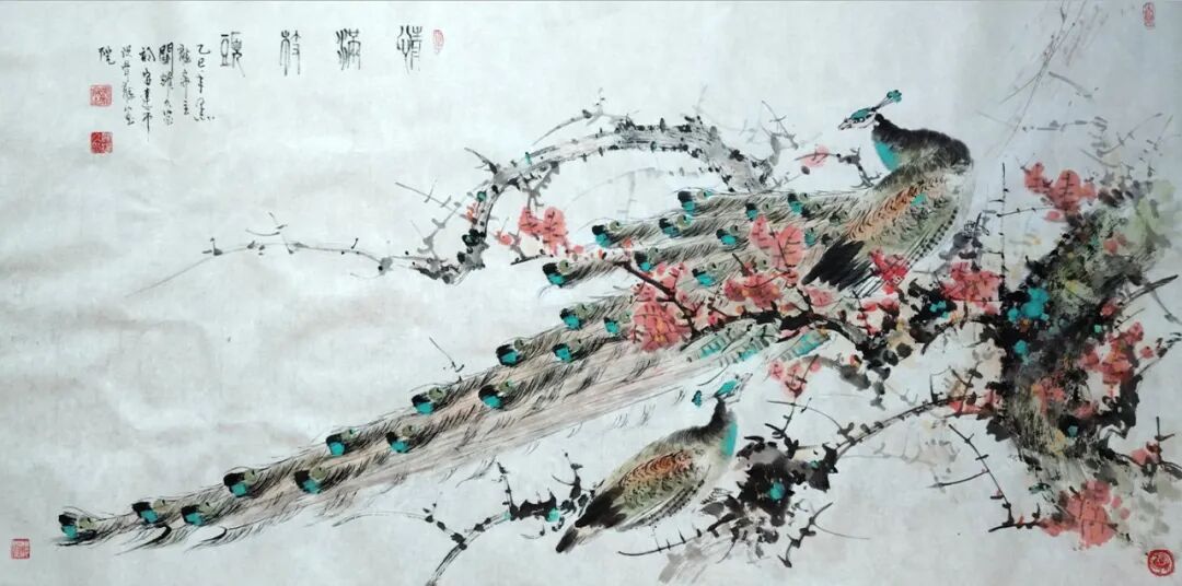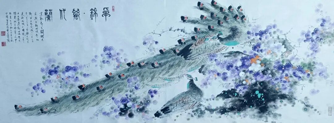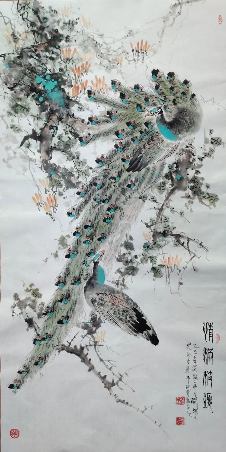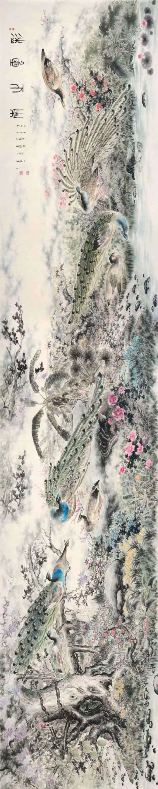 《彩云之南》(10米X2.6米,当今世界最大一幅以孔雀为主题的中国画(23天完成)为庆祝中国共产党建党90周念而专题创作于云南丽江。