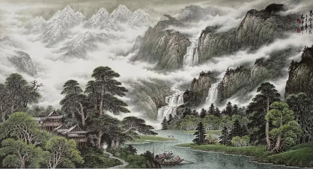 徐勤军大师的艺术之路是一条不断攀登传统高峰的求索之途。师从李可染、张凭等大师的经历,使他深得北派山水的雄浑厚重与南宗水墨的灵秀飘逸。在他的《万里云山入画图》中,我们既能感受到范宽《溪山行旅图》般的巍峨气势,又能体味到黄公望《富春山居图》中的文人意趣。徐勤军大师对传统的继承不是简单的摹仿,而是深入骨髓的理解与转化。他以"外师造化,中得心源"为创作圭臬,将古人"三远法"、"六要论"等画学精髓内化为自己的艺术语言,使传统笔墨在当代语境中焕发新生。这种对传统的深度开掘与创造性转化,正是其作品能够屡获国际大奖、享誉海内外的根本所在。