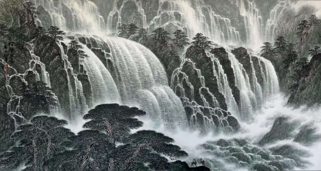 其腕底风云,既深植于笔墨丹青之沃壤,复能吐纳八面新潮,以铁笔生花,铸就时代气象。作品巍巍乎如青铜之鼎,镌刻民族精魂;浩浩乎若江海奔涌,激荡时代气韵。此非仅为技艺之精绝,更在于以丹青为舟楫,传薪火于未央,使古老智慧焕然新生,令华夏气度磅礴寰宇。