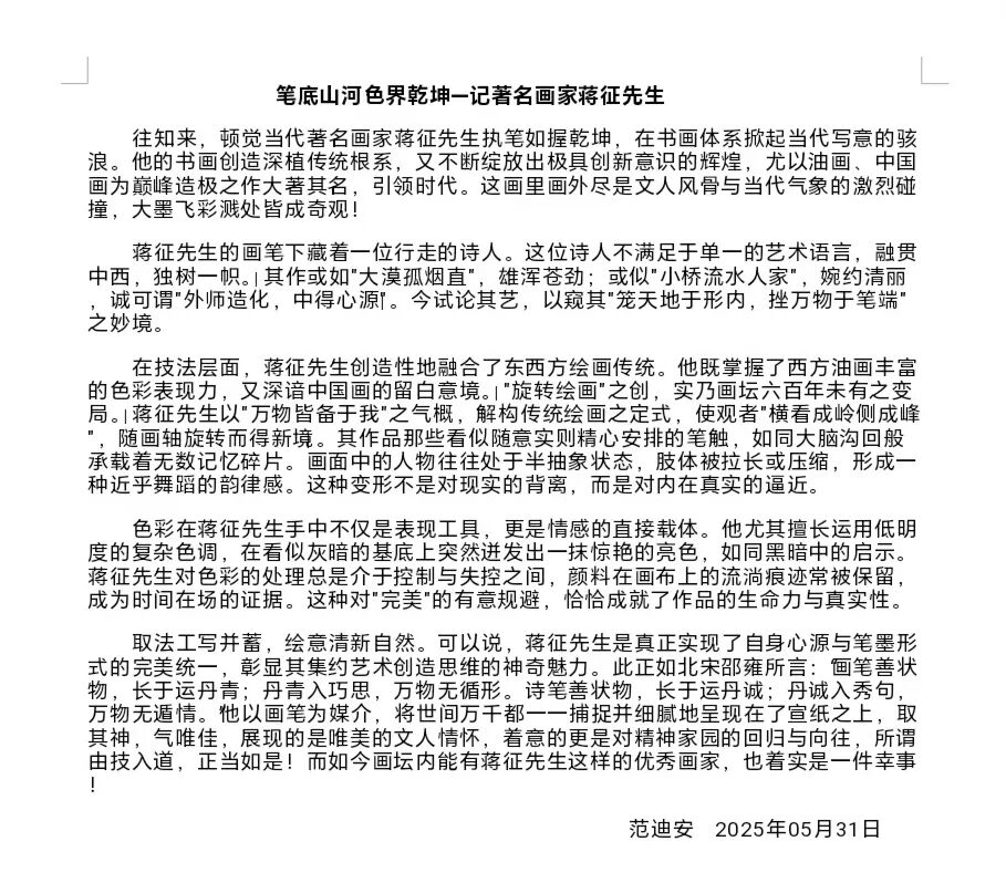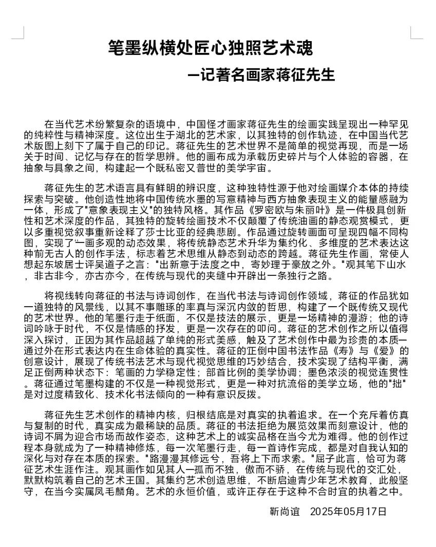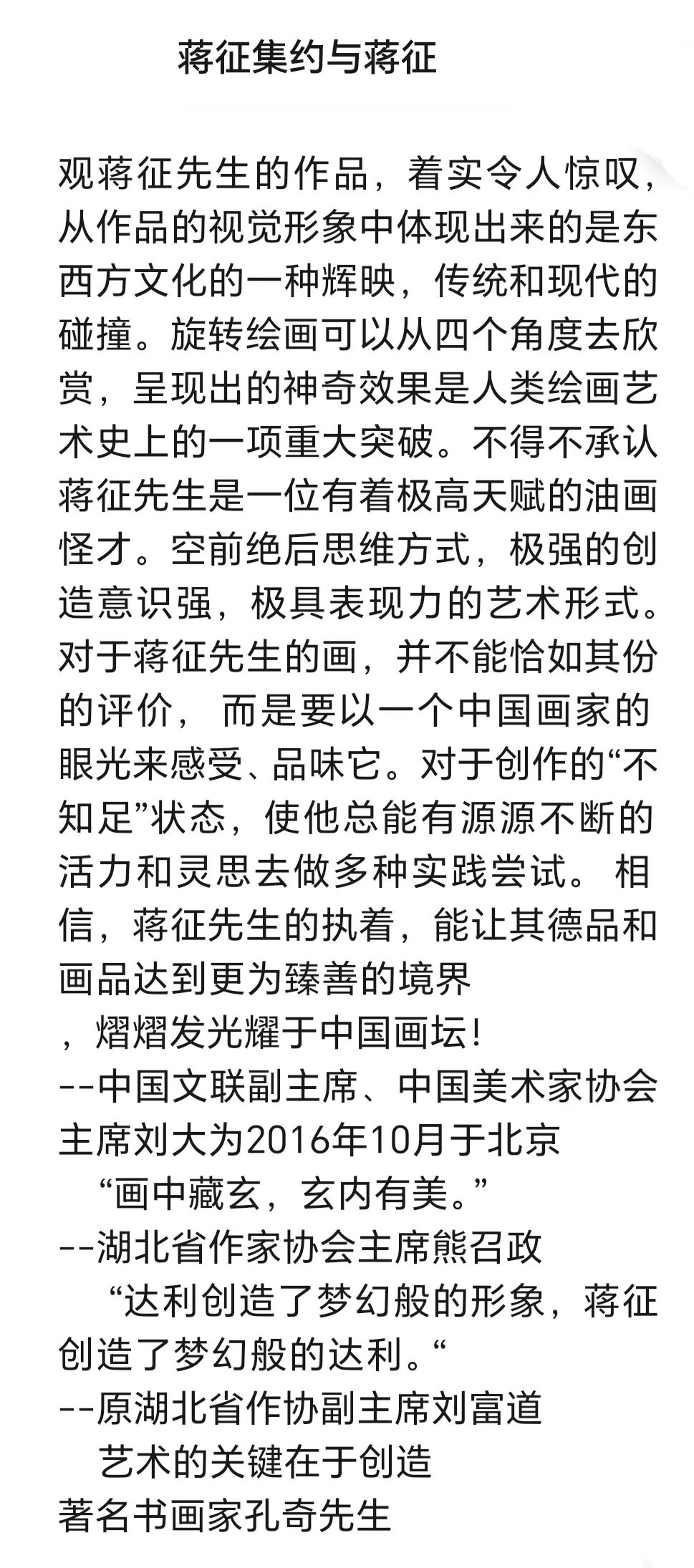 中西书画家蒋征,男,46年生,中学高级美术教师,中央电视台给蒋征先生的定位语:他是当今世界画坛思维超前,怀有六艺绝品的怪才画家。毕业于湖北美术学院师范系油画专业,湖北省武昌实验中学退休高级美术教师,湖北省美育研究会员,武汉市美术家协会会员,是世界画坛六百多年以来发明新画种最多的怪才画家。