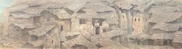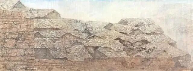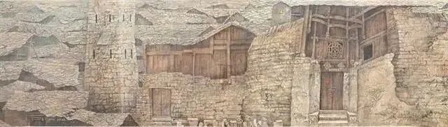 我的童年是在屯堡歌谣中度过的,父辈们讲述的调北征南和调北填南的故事,深深嵌入了我的脑海。当我流连于山清水秀的屯堡村寨时,总想去寻觅它的魂,探究它的根。 这一切,曾不止一次地激励我拿起画笔,去描绘这片将要逝去的屯堡村落,记录下这浓浓的乡愁家园。六百余年的沧桑变化 ,那些曾经造型各异的屯堡建筑及石器,随着社会的发展,已失去了原有的功能。不能满足现代生活居住的需要,越来越多的屯堡民居被闲置和荒弃。为了再现这片承载数百年风雨的历史文化建筑,唤醒更多的人们去认识和保护现有的地域文化,我历时数年,行走于安顺周边的屯堡村落,进行实地写生和考察,并着手进行这幅长卷的构思和创作。《屯堡一流逝的遗痕》终于如愿以偿,创作完成。整幅画卷长三十一米,高一米。主要采用中国传统绘画中散点透视的构图方式, 融入了中国画、岩彩画及自己新探索的技法。选用核桃油研礳矿石调制作颜料,以表现因长期风化的石材、木质等的沧桑岁月。画面中没有挑逗的色彩与笔触,只以一种纯朴而又微妙的冷暖变化,让人们随着画卷的展开和视线的移动渐渐地穿越六百余年的历史时空,去追溯、去沉思、去遐想……