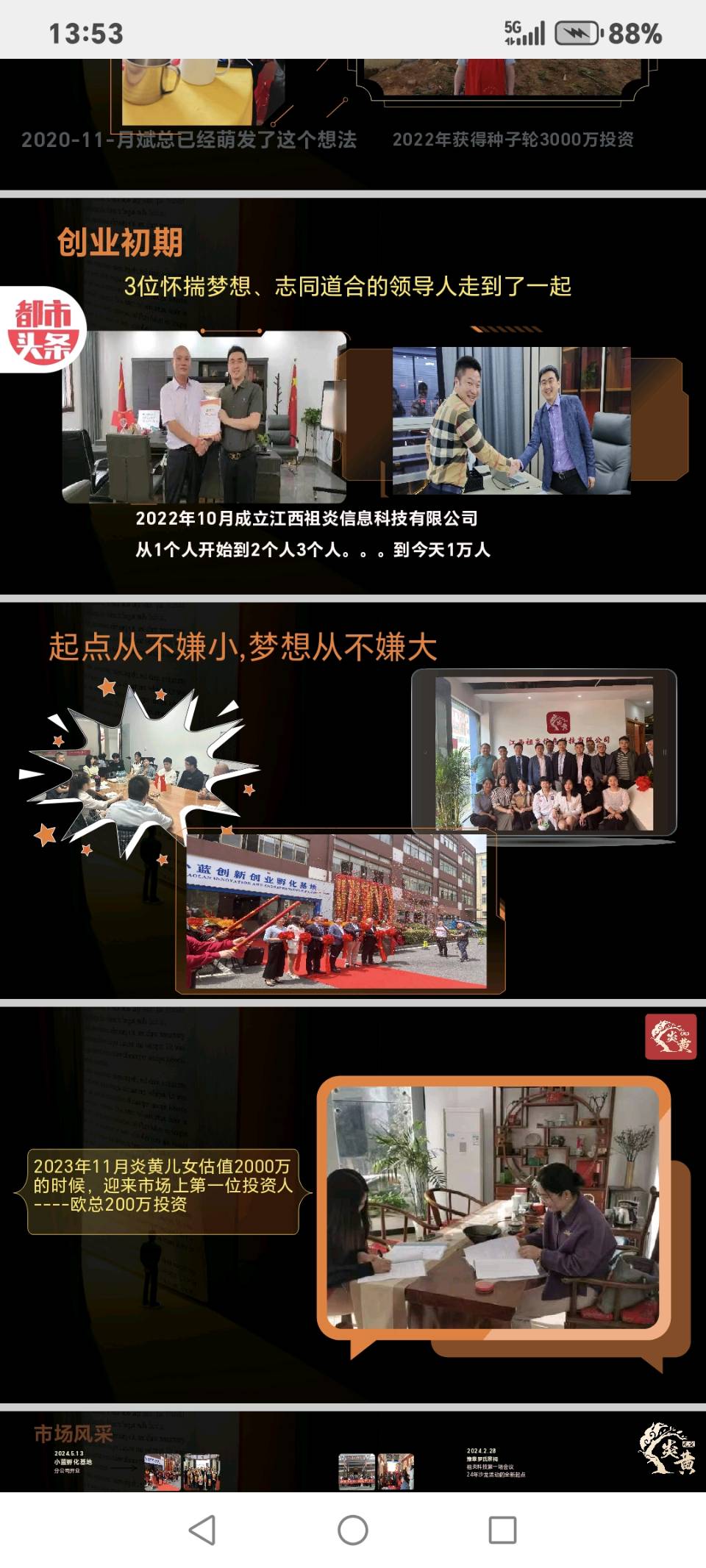 “起点从不嫌小,梦想从不嫌大”,这句箴言,是公司发展的生动注脚。无论是初创时的会议室研讨,还是企业化基地揭牌的热闹场景,亦或是团队合影里的灿烂笑容,都藏着对梦想的执着。2023 年 11 月,炎黄儿女估值 2000 万之际,第一位投资人欧总的 200 万投资,如同东风助力,让这艘逐梦之舟,在市场的海洋里,行得更稳、更远。