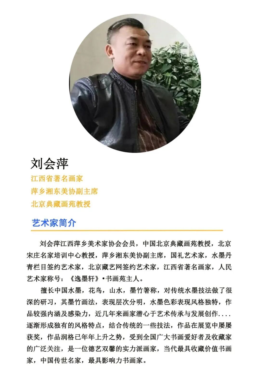 刘会萍江西萍乡美术家协会会员,中国北京典藏画苑教授,北京宋庄名家培训中心教授,萍乡湘东美协副主席,国礼艺术家,水墨丹青栏目签约艺术家,北京藏艺网签约艺术家,江西省著名画家,人民艺术家称号:《逸墨轩》·书画苑主人。
