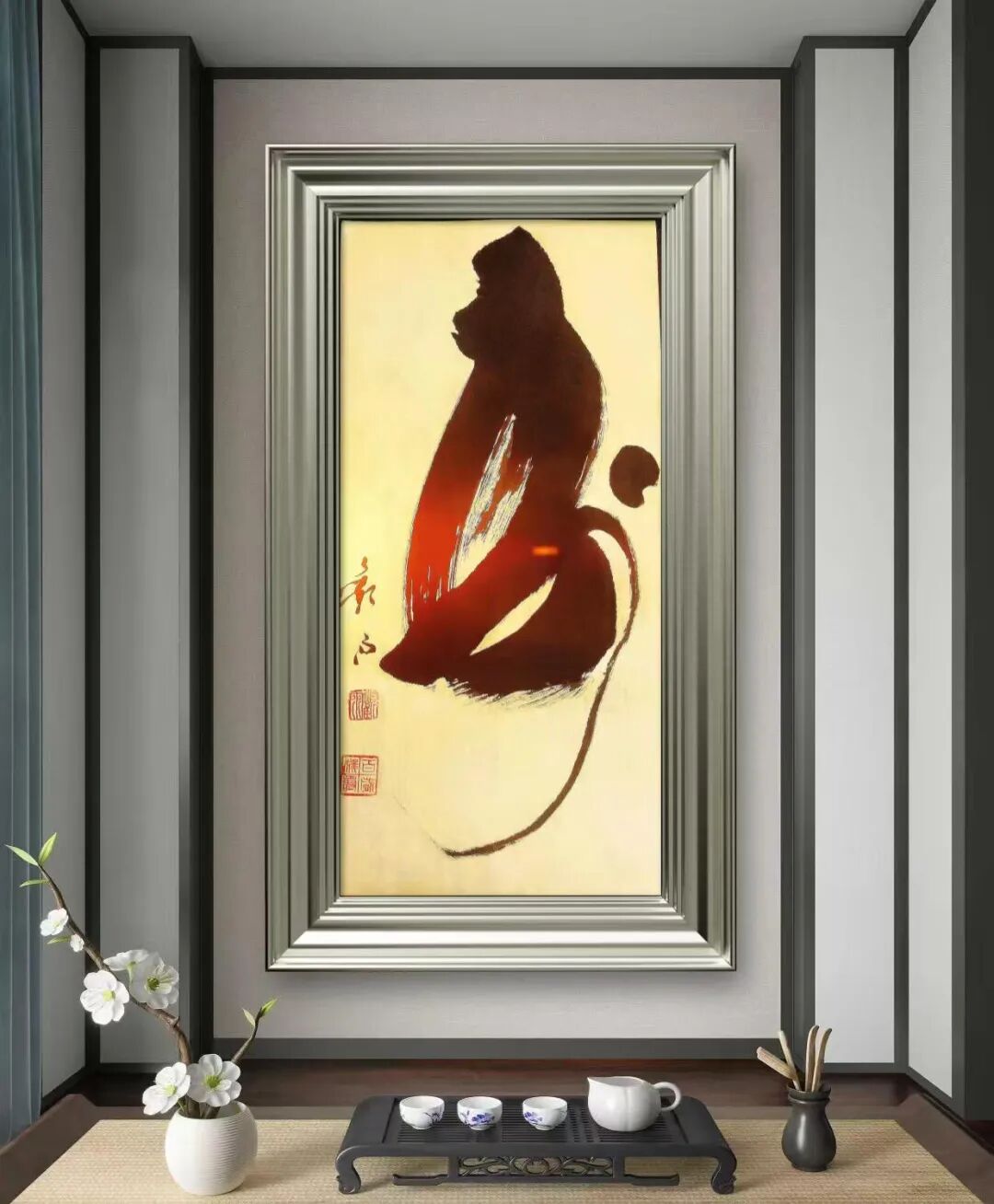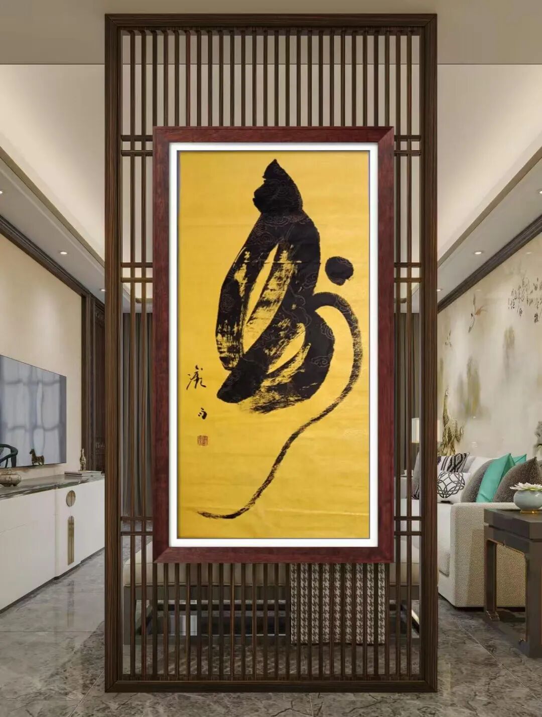 雅室添韵:无论是书房案头映着墨香,还是茶室角落伴着茶香,这幅字都带着山海的旷达与灵猴的机趣,让寻常空间多了份“游过名山大川,藏得一方福瑞”的雅致。