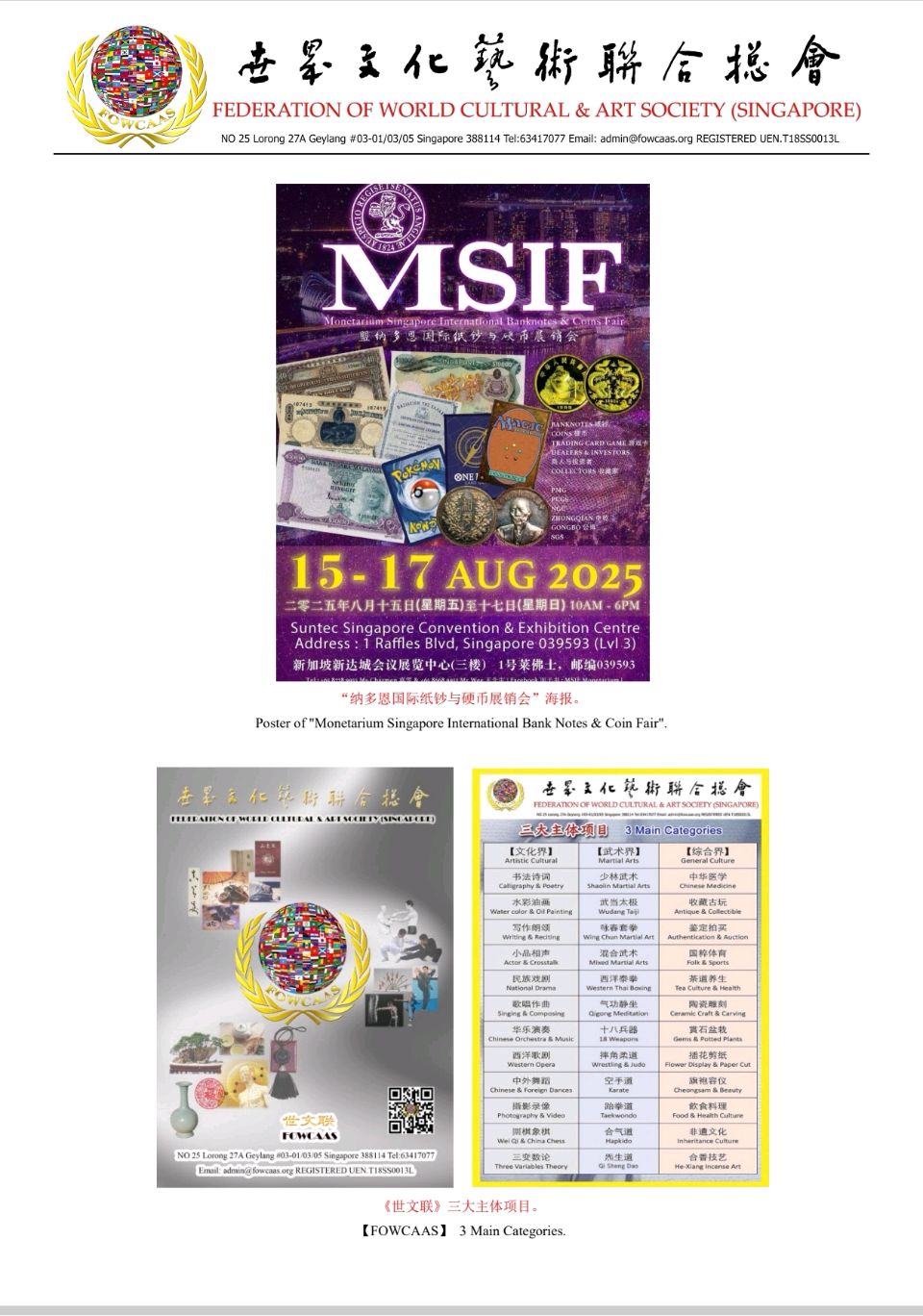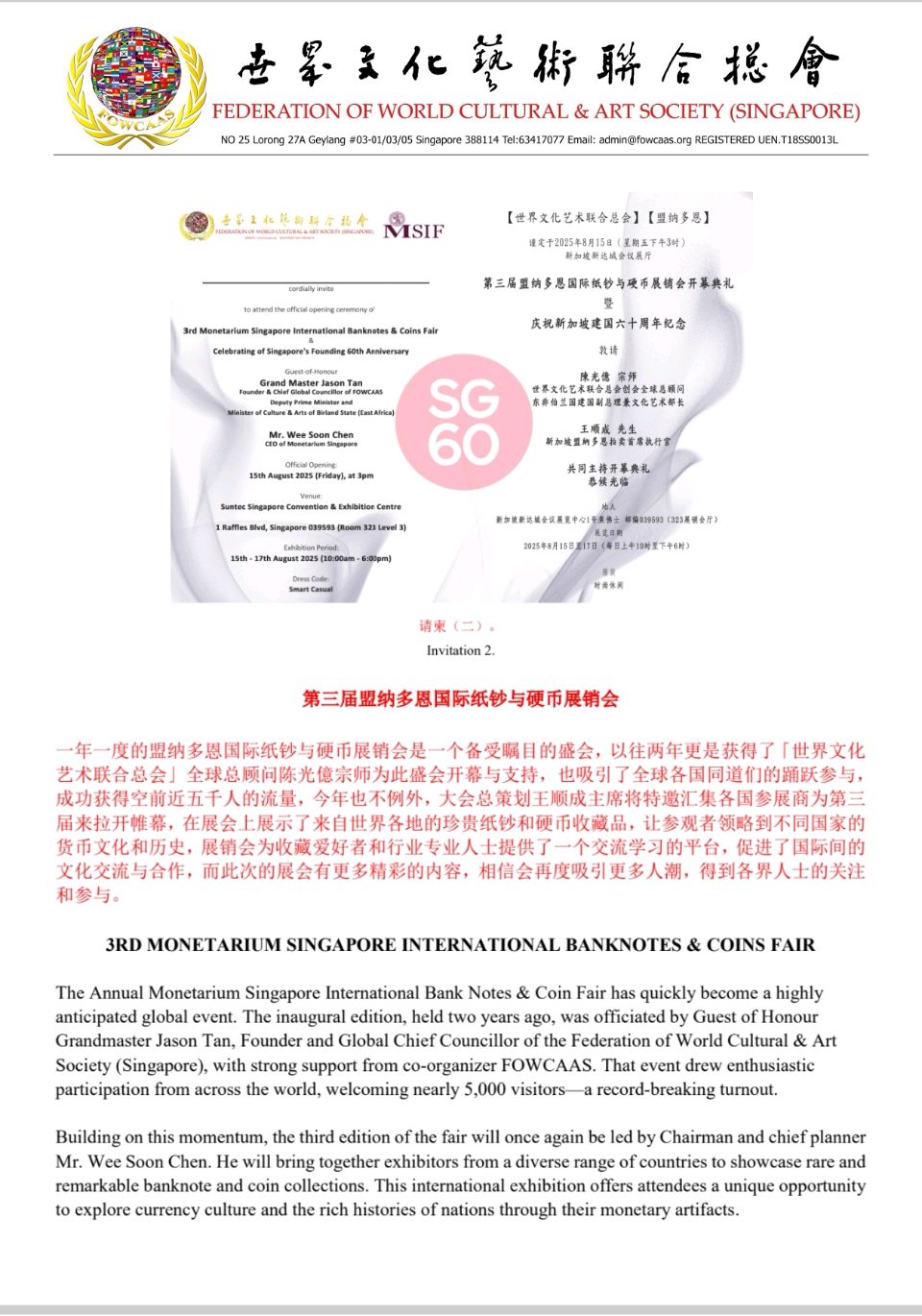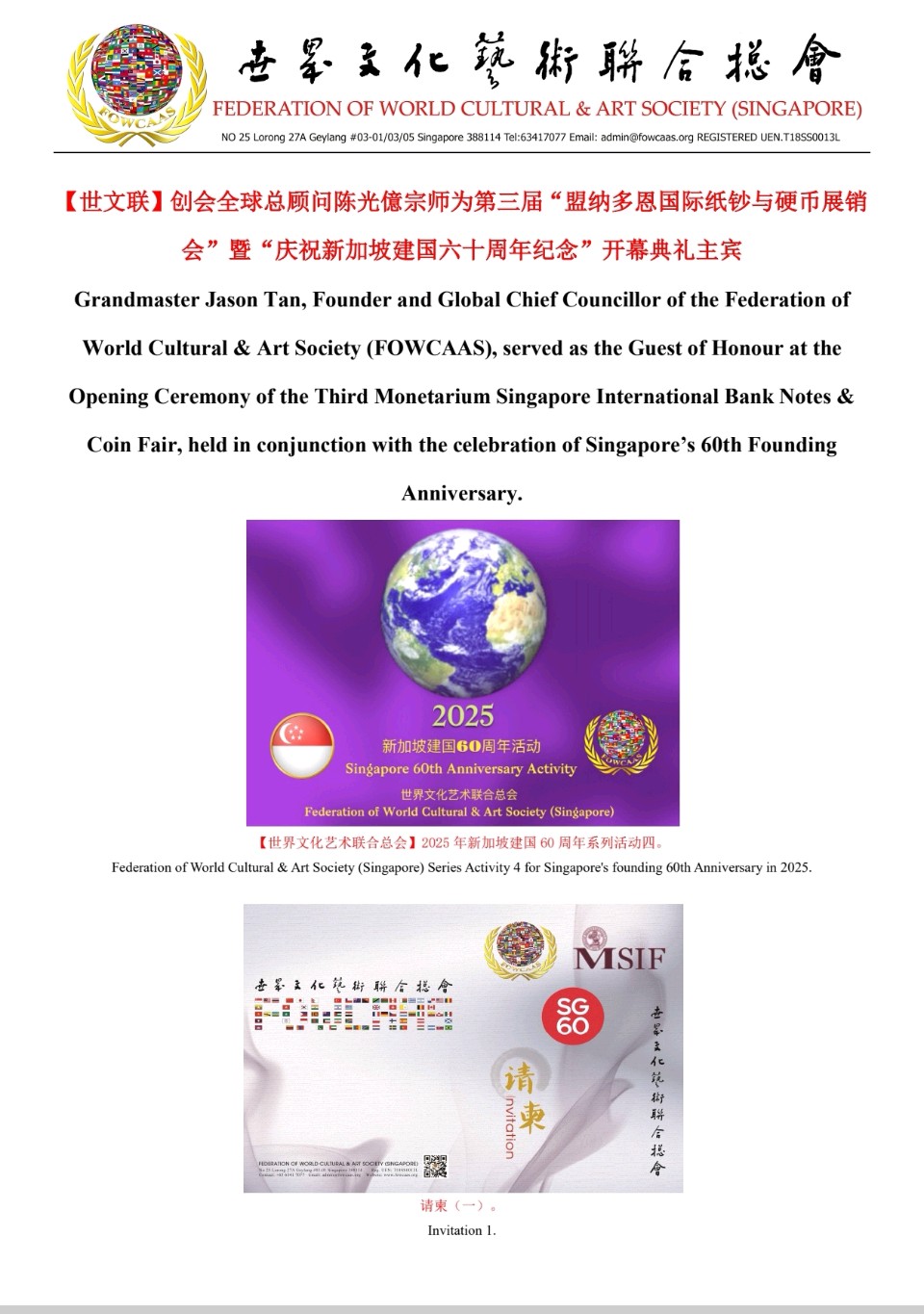 Grandmaster Jason Tan, Founder and Global Chief Councillor of the Federation of World Cultural & Art Society (FOWCAAS), served as the Guest of Honour at the Opening Ceremony of the Third Monetarium Singapore International Bank Notes & Coin Fair, held in conjunction with the celebration of Singapore’s 60th Founding Anniversary.