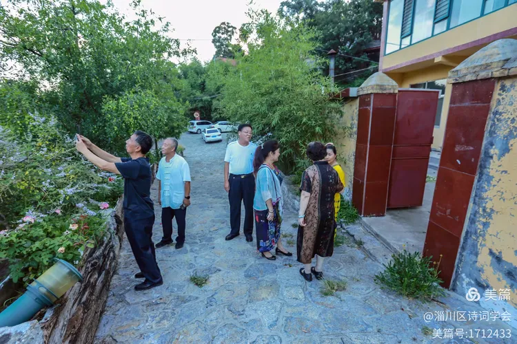 孙老师的家就在村广场斜上方,也是一座红瓦白墙的小楼,楼顶上铺架了太阳能光伏板,大门一侧有几畦菜地,坠着茄子,挂着黄瓜,垂着豆角,尽是一些时令蔬果。我摘下一抱黄瓜,每个诗友分一根,鲜!嫩!脆!他家门前树上青枣、青柿子挂满枝头,路边长长的矮花墙缀满繁花,花朵娇艳,馥郁芬芳,引无数蜂蝶漫舞。放眼望去,远处的山峦如大自然精心绘制的水墨画,浓淡相宜的绿意肆意铺展,山间云雾缭绕,如梦似幻,此乃神仙之居,怪不得孙老师要频频回老家呢!