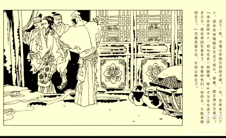 逾年,万复事于济,狐又与俱。忽有数人来,狐从与语,备极寒暄。乃语万曰:“我本陕中人,与君有夙因,遂从许时。今我兄弟来至矣。将从以归,不能周事。”留之不可,竟去。