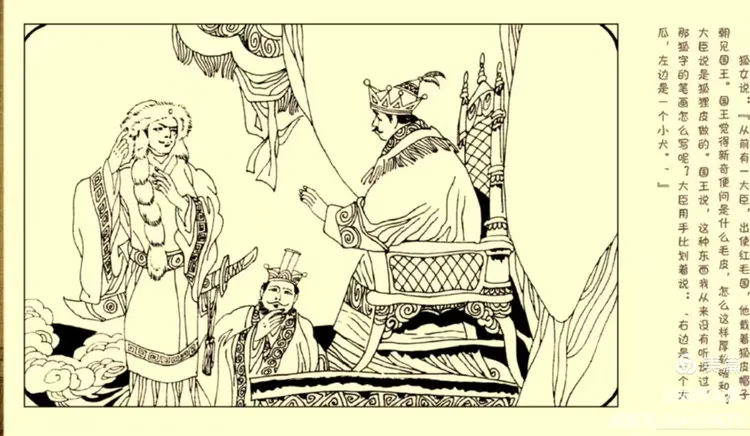 狐曰:“昔一大臣,出使红毛国,着狐腋冠见国王。王见而异之,问:‘何皮毛,温厚乃尔?’夫臣以狐对。王言:‘此物生平未曾得闻。狐字字画何等?’使臣书空而奏曰:‘右边是一大瓜,左边是一小犬。’”主客又复哄堂。二客,陈氏兄弟,一名所见,一名所闻。见孙大窘,乃曰:“雄狐何在,而纵雌狐流毒若此?”狐曰:“适一典谈犹未终,遂为群吠所乱,请终之。国王见使臣乘一骡,甚异之。使臣告曰:‘此马之所生。’又大异之。使臣曰:‘中国马生骡,骡主驹驹。’王细问其状。使臣曰:‘马生骡,是“臣所见”,骡生驹驹,是“臣所闻”。’”举坐又大笑。众知不敌,乃相约:后有开谑端者,罚作东道主。