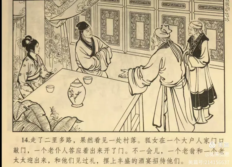 居数月,与万偕归。乃博兴界,告万曰:“我此处有葭莩亲,往来久梗,不可不一讯。日且暮,与君同寄宿,待旦而行可也。”万询其处,指言:“不远。”万疑前此故无村落,姑从之。二里许,果见一庄,生平所未历。狐往叩关,一苍头出应门。入则重门叠阁,宛然世家。俄见主人,有翁与媪,揖万而坐。列筵丰盛,待万以姻娅,遂宿焉。
