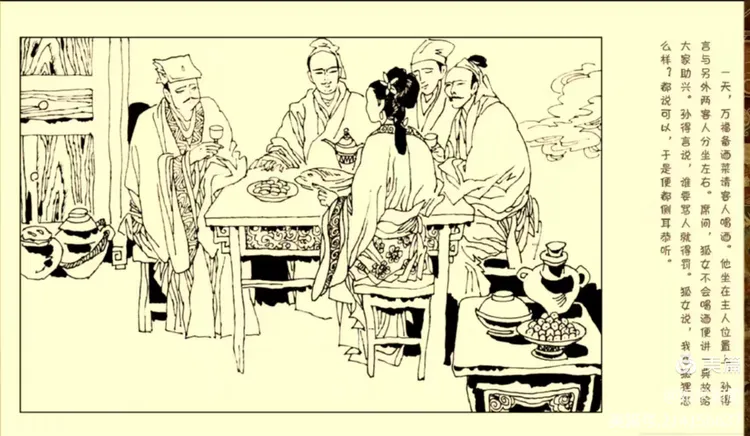 一日,置酒高会,万居主人位,孙与二客分左右座,上设一榻屈狐。狐辞不善酒。咸请坐谈,许之。酒数行,众掷骰为瓜蔓之令。客值瓜色,会当饮,戏以觥移上座曰:“狐娘子大清醒,暂借一觞。”狐笑曰:“我故不饮,愿陈一典,以佐诸公饮。”孙掩耳不乐闻。客皆言曰:“骂人者当罚。”狐笑曰:“我骂狐何如?”众曰:“可。”于是倾耳共听。